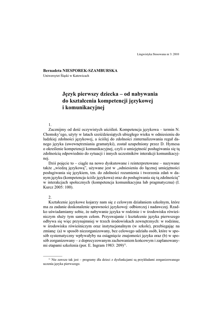 99 Lingwistyka Stosowana nr 3: 2010 Bernadeta NIESPOREK-SZAMBURSKA Uniwersytet Śląski w Katowicach Język pierwszy dziecka – od nabywania do kształcenia kompetencji językowej i komunikacyjnej 1. Zacznijmy od dość oczywistych uściśleń. Kompetencja językowa – termin N. Chomsky’ego, użyty w latach sześćdziesiątych ubiegłego wieku w odniesieniu do ludzkiej zdolności językowej, a ściślej do zdolności zinternalizowania reguł danego języka (uwewnętrzniania gramatyki), został uzupełniony przez D. Hymesa o określenie kompetencji komunikacyjnej, czyli o umiejętność posługiwania się tą zdolnością odpowiednio do sytuacji i innych uczestników interakcji komunikacyjnej. Dziś pojęcie to – ciągle na nowo dyskutowane i reinterpretowane – nazywane także „wiedzą językową”, używane jest w „odniesieniu do łącznej umiejętności posługiwania się językiem, tzn. do zdolności rozumienia i tworzenia zdań w danym języku (kompetencja ściśle językowa) oraz do posługiwania się tą zdolnością” w interakcjach społecznych (kompetencja komunikacyjna lub pragmatyczna) (I. Kurcz 2005: 100). 2. Kształcenie językowe kojarzy nam się z celowym działaniem szkolnym, które ma za zadanie doskonalenie sprawności językowej: odbiorczej i nadawczej. Rzadko uświadamiamy sobie, że nabywanie języka w rodzinie i w środowisku rówieśniczym służy tym samym celom. Przyswajanie i kształcenie języka pierwszego odbywa się więc przynajmniej w trzech środowiskach zewnętrznych: w rodzinie, w środowisku rówieśniczym oraz instytucjonalnym (w szkole), przebiegając na zmianę: (a) w sposób niezorganizowany, bez celowego udziału osób, które w sposób systematyczny wpływałyby na osiągnięcie znajomości języka oraz (b) w sposób zorganizowany – z doprecyzowanym zachowaniem końcowym i zaplanowanymi etapami szkolenia (por. E. Ingram 1983: 209)11. 11 Nie zawsze tak jest – programy dla dzieci z dysfunkcjami są przykładami zorganizowanego uczenia języka pierwszego. 100 BERNADETA NIESPOREK-SZAMBURSKA I tak przyjmuje się, że dziecko wyposażone w nieuszkodzone systemy fizjologiczne, przebywając w środowisku, które w wystarczającym stopniu zaspokaja jego potrzeby fizyczne i osobiste, przyswaja podstawowe elementy i wzorce językowe, podobnie jak uczy się chodzić i bawić przedmiotami. Współczesne badania nad rozwojem języka dziecka preferują podejście komunikacyjne, a w jego obrębie perspektywę interakcyjną (tzw. interakcyjną intencjonalność). Wewnętrznemu mechanizmowi przyswajania języka (LAD) przeciwstawia się system przyswajania języka przez socjalizację (LASS). „Dziecko, które zaczyna używać języka, jest silnie nastawione na wykonywanie (bądź komentowanie) czynności podejmowanej wspólnie z kimś innym” (J. S. Bruner 1980: 495). „Przyswaja sobie [ono – B.N.Sz.] język pod presją potrzeby zwracania się do ludzi wokół niego oraz potrzeby komunikowania swego rozwijającego się postrzegania i rozumienia świata, w którym wzrasta” (E. Ingram 1983: 275). Według teorii społeczno-pragmatycznych (M. Tomasello 2002) wszystko, czego dziecku trzeba, by opanowało język, to przebywanie z dorosłymi inicjującymi zabawy w interakcje, dostarczającymi mu wzorów językowych, reagującymi na jego zachowanie – na długo przed pojawieniem się u niego języka12. Kilkanaście miesięcy zanurzenia (immersji) w takie teksty – dzięki dziecięcej zdolności naśladowania – tworzy istotę rozumiejącą i mówiącą językiem pierwszym13. Nowe metody i schematy badań14 pozwoliły też odkryć w pierwszym roku życia dziecka przejście od uniwersalnego wzorca językowego w procesie percepcji mowy do percepcji według wzorca specyficznego dla danego języka. „Zanim […] rozpocznie się nabywanie słów [między 6. a 12. miesiącem życia – B.N.-Sz], w umyśle dziecka powstają swoiste mapy mowy, w których odwzorowana jest informacja fonetyczna specyficzna dla języka otoczenia” (B. Bokus, G.W. Shugar 2007: 21). Pozwalają one niemowlętom na koncentrowanie się na aspektach sygnału akustycznego oddzielających kategorie w ich rodzimym języku i „stanowią swego rodzaju precyzyjnie dostrojony filtr dla języka” (B. Bokus, G. W. Shugar 2007: 21). „Model rozwoju mowy zwany modelem magnesu języka ojczystego (P. K. Kuhl 2007) pokazuje [też], że językowa przestrzeń percepcyjna ulega przekształceniu, aby odwzorować umiejscowienie magnesów w języku ojczystym. Wprawdzie system słuchowy dziecka nadal przetwarza dane akustyczne oddzielające obcojęzyczne kategorie, ale te kategorie przestają być zauważane przez podmiot” 12 Badacze reprezentujący tę hipotezę twierdzą, że dzieci rodzą się nie z określoną wiedzą o regułach gramatycznych i kategoriach semantycznych czy fonologicznych, ale ze zdolnością porządkowania doświadczeń, wykrywania zależności oraz zdolnością rozumienia i używania symboli (por. E. Ingram 1983). 13 Język pierwszy – nabywany od otoczenia automatycznie, bez udziału woli. Badacze stwierdzają nawet pierwotność kompetencji komunikacyjnej w nabywaniu języka (dzięki komórkom lustrzanym). 14 Jak pomiar rytmu i siły ssania smoczka, pomiar zwolnienia rytmu pracy serca dziecka, procedury warunkowania odwracania głowy przez dziecko. Por. B. Bokus, G.W. Shugar (red.) 2007. 101 JĘZYK PIERWSZY DZIECKA... (B. Bokus, G. W. Shugar 2007: 21). Przyswajanie percepcyjnych cech sygnałów komunikacyjnych z języka ojczystego jest dla dzieci stosunkowo łatwe dzięki mowie matczynej (motherese – J. Berko Gleason, N. Bernstein Ratner 2005): uproszczonej syntaktycznie i semantycznie, wolniejszej, z przesadnym zarysowaniem konturów intonacyjnych, wzmacniających rozróżnienia fonetyczne. W takiej mowie pojawia się też więcej prototypowych egzemplarzy, które wywołują efekt percepcyjnego magnesu języka pierwszego i ułatwiają konstruowanie wspomnianych map 