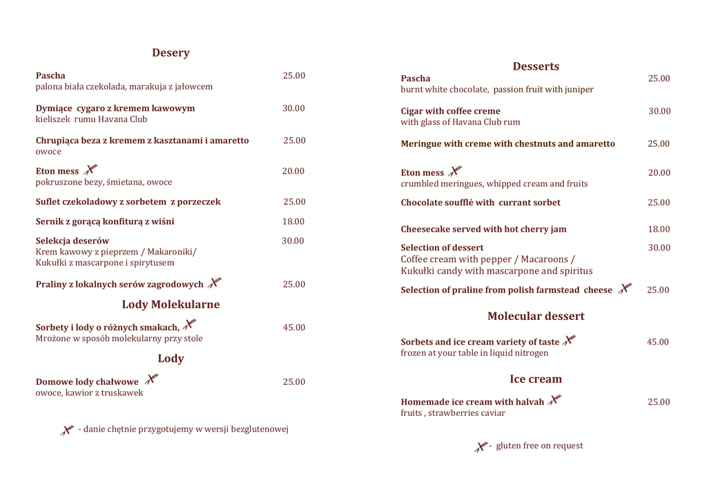 Desery Desserts Pascha palona biała czekolada, marakuja z jałowcem 25.00 Pascha burnt white chocolate, passion fruit with juniper 25.00 Dymiące cygaro z kremem kawowym kieliszek rumu Havana Club 30.00 Cigar with coffee creme with glass of Havana Club rum 30.00 Chrupiąca beza z kremem z kasztanami i amaretto owoce 25.00 Meringue with creme with chestnuts and amaretto 25.00 Eton mess pokruszone bezy, śmietana, owoce 20.00 Eton mess crumbled meringues, whipped cream and fruits 20.00 Suflet czekoladowy z sorbetem z porzeczek 25.00 Chocolate soufflé with currant sorbet 25.00 Sernik z gorącą konfiturą z wiśni 18.00 Cheesecake served with hot cherry jam 18.00 Selekcja deserów Krem kawowy z pieprzem / Makaroniki/ Kukułki z mascarpone i spirytusem 30.00 Selection of dessert 30.00 Praliny z lokalnych serów zagrodowych 25.00 Selection of praline from polish farmstead cheese 25.00 Coffee cream with pepper / Macaroons / Kukułki candy with mascarpone and spiritus Lody Molekularne Sorbety i lody o różnych smakach, Mrożone w sposób molekularny przy stole 45.00 Sorbets and ice cream variety of taste frozen at your table in liquid nitrogen Lody Domowe lody chałwowe owoce, kawior z truskawek Molecular dessert 25.00 45.00 Ice cream Homemade ice cream with halvah fruits , strawberries caviar - danie chętnie przygotujemy w wersji bezglutenowej - gluten free on request 25.00 Herbaty liściaste Polecamy z konfiturą różaną lub malinami w syropie 5.00 Świeżo mielona kawa Caffe creme, filiżanka kawy ciśnieniowej z cremą Espresso 10.00 8.00 Cappuccino 10.00 Kawa po wiedeńsku 12.00 Mocha z czekoladą duża kawa, w której smak espresso miesza się z czekoladą 12.00 Latte Machiato 10.00 warstwowa kawa na bazie espresso z delikatną mleczną pianą Latte Machaito z syropem: waniliowy, karmelowy, amaretto 12.00 Pomarańczowa caffe creme z bitą śmietaną Cointreau (20 ml), skórka pomarańczy 16.00 Latte machiato z Baileisem Baileis (30 ml), espresso, mleko 16.00 Irish coffee , whiskey (40 ml) , bita śmietana 17.00 Kawa zielona 10.00 Herbata czarna- Darjeeling royal second flush 10.00 Earl grey – szlachetna mieszanka z owocem bergamotki 10.00 Rooibos vanilla - czerwonokrzew z kawałkami wanilii 10.00 Herbata zielona Sonne asiens royal 10.00 zielona Sencha wzbogacona trawą cytrynową i kwiatami Saflory Owoce letnie - kawalki jabłek i papai płatków hibiskusa, skórek dzikiej róży, owoców bzu 10.00 Ogród ziołowy- mieszanka ziołowa z trawy cytrynowej mięty Nana, czerwonokrzewu i korzenia lukrecji 10.00 Herbata miętowa grubo krojone, aromatyczne liście mięty pieprzowej 10.00 Herbata z laską cynamonu, anyżem, jabłkiem i pomarańczą 11.00 Herbata zielona z trawą cytrynową, z imbirem i limonką 11.00 Wino półsłodkie czerwone Tokaj Aszu III puttonowy Porto 20 Years Old Port Osborne 15.00 25.00 35.00 Wina deserowe 100ml Koniak i Brandy 40ml Metaxa ******* 30.00 Calvados Boulard V.S.O.P . 35.00 Armagnac Castarede V.S.O.P. 35.00 Martel V.S. 30.00 Remy Martin V.S.O.P. 35.00 Hennesy X.O. 70.00 Leaved teas recommend with aromatic rose jam or raspberries 3zł Freshly ground coffee Caffe creme Espresso 10.00 8.00 Cappuccino 10.00 Vienna coffee 12.00 Mocha with chocolate: big coffee with the flavour of chocolate 12.00 Black tea Darjeeling royal second flush 10.00 Earl grey – classical tea with bergamot 10.00 Rooibos vanilla- tea with addition of vanilla pieces 10.00 Green tea Sonne asiens royal with addition of lemon grass and safflower 10.00 Summer fruit apple, papaya, hibiscus, wild rose and lilac flower 10.00 Herb garden, lemon grass, mint, licorice 10.00 Mint tea, aromatic leaves of peppermint 10.00 Latte Machiato, espresso and a delicate milk foam 10.00 Tea with cinnamon stick, anise, apple, orange 11.00 Latte Machiato with syrup : vanilla, caramel or amaretto 12.00 Green tea with lemon grass, ginger and lime 11.00 Orange caffe creme with whipped cream Cointreau (20 ml)l, orange peel 16.00 Latte machiato with Baileis Baileis (30 ml), espresso, milk 16.00 Irish coffee whiskey(40 ml), whipped cream, cane sugar 17.00 Green caffe 10.00 Dessert wine 100ml Semi sweet wine Tokay III puttonyos Porto 20 Years Old Port Osborne 15.00 25.00 35.00 Cognacs & Brandies 40ml Metaxa ******* 30.00 Calvados Boulard V.S.O.P . 35.00 Armagnac Castarede V.S.O.P. 35.00 Martel V.S. 30.00 Remy Martin V.S.O.P. 35.00 Hennesy X.O. 70.00