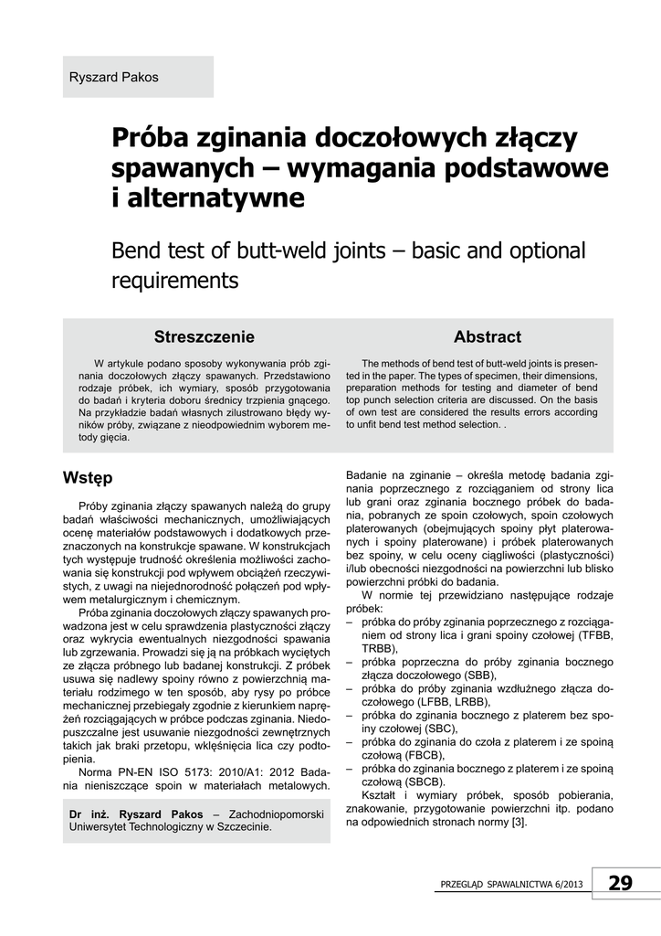 Ryszard Pakos Próba zginania doczołowych złączy spawanych – wymagania podstawowe i alternatywne Bend test of butt-weld joints – basic and optional requirements Streszczenie W artykule podano sposoby wykonywania prób zginania doczołowych złączy spawanych. Przedstawiono rodzaje próbek, ich wymiary, sposób przygotowania do badań i kryteria doboru średnicy trzpienia gnącego. Na przykładzie badań własnych zilustrowano błędy wyników próby, związane z nieodpowiednim wyborem metody gięcia. Wstęp Próby zginania złączy spawanych należą do grupy badań właściwości mechanicznych, umożliwiających ocenę materiałów podstawowych i dodatkowych przeznaczonych na konstrukcje spawane. W konstrukcjach tych występuje trudność określenia możliwości zachowania się konstrukcji pod wpływem obciążeń rzeczywistych, z uwagi na niejednorodność połączeń pod wpływem metalurgicznym i chemicznym. Próba zginania doczołowych złączy spawanych prowadzona jest w celu sprawdzenia plastyczności złączy oraz wykrycia ewentualnych niezgodności spawania lub zgrzewania. Prowadzi się ją na próbkach wyciętych ze złącza próbnego lub badanej konstrukcji. Z próbek usuwa się nadlewy spoiny równo z powierzchnią materiału rodzimego w ten sposób, aby rysy po próbce mechanicznej przebiegały zgodnie z kierunkiem naprężeń rozciągających w próbce podczas zginania. Niedopuszczalne jest usuwanie niezgodności zewnętrznych takich jak braki przetopu, wklęśnięcia lica czy podtopienia. Norma PN-EN ISO 5173: 2010/A1: 2012 Badania nieniszczące spoin w materiałach metalowych. Dr inż. Ryszard Pakos – Zachodniopomorski Uniwersytet Technologiczny w Szczecinie. Abstract The methods of bend test of butt-weld joints is presented in the paper. The types of specimen, their dimensions, preparation methods for testing and diameter of bend top punch selection criteria are discussed. On the basis of own test are considered the results errors according to unfit bend test method selection. . Badanie na zginanie – określa metodę badania zginania poprzecznego z rozciąganiem od strony lica lub grani oraz zginania bocznego próbek do badania, pobranych ze spoin czołowych, spoin czołowych platerowanych (obejmujących spoiny płyt platerowanych i spoiny platerowane) i próbek platerowanych bez spoiny, w celu oceny ciągliwości (plastyczności) i/lub obecności niezgodności na powierzchni lub blisko powierzchni próbki do badania. W normie tej przewidziano następujące rodzaje próbek: – próbka do próby zginania poprzecznego z rozciąganiem od strony lica i grani spoiny czołowej (TFBB, TRBB), – próbka poprzeczna do próby zginania bocznego złącza doczołowego (SBB), – próbka do próby zginania wzdłużnego złącza doczołowego (LFBB, LRBB), – próbka do zginania bocznego z platerem bez spoiny czołowej (SBC), – próbka do zginania do czoła z platerem i ze spoiną czołową (FBCB), – próbka do zginania bocznego z platerem i ze spoiną czołową (SBCB). Kształt i wymiary próbek, sposób pobierania, znakowanie, przygotowanie powierzchni itp. podano na odpowiednich stronach normy [3]. Przegląd sPawalnictwa 6/2013 29 Próba zginania Próbki do badań należy wykonać w taki sposób, aby przygotowanie nie wpływało ani na materiał podstawowy, ani na spoinę. Końcowe etapy przygotowania powierzchni powinny być wykonane za pomocą obróbki skrawaniem, przy czym należy przestrzegać, by nie nastąpiło utwardzenie powierzchni przez zgniot lub jej nadmierne rozgrzewanie. Powierzchnia powinna być pozbawiona zarysowań i karbów poprzecznych do kierunku próbki, z wyjątkiem podtopień, których nie powinno się usuwać, jeżeli we właściwej normie wyrobu lub ustaleniach między stronami nie ustalono inaczej. Grubość próbek należy przyjmować zgodnie z wymaganiami normy [3]. Szerokość próbek określana jest następująco: a) próba zginania poprzecznego z rozciąganiem od strony lica lub grani spoiny: – dla blach: b = 4 x t (b – szerokość próbki, t – grubość próbki), – dla rur o średnicy zewnętrznej D ≤ 50 mm: b = t + 0,1D (nie mniej niż 8 mm), – dla rur o średnicy zewnętrznej D > 50 mm: b = t + 0,5 D (min. 8 mm i nie więcej niż 40 mm), w przypadku rur o średnicy większej niż 25 grubości jej ścianki próbkę można pobrać wg wymagań dla blach spełniające wymagania: b) próba zginania bocznego: – szerokość próbki powinna być równa grubości materiału podstawowego w pobliżu złącza, c) próba zginania wzdłużnego: szerokość próbek powinna wynosić: – B = Ls + 2b1 (Ls – największa szerokość spoiny po obróbce, b1 – odległość brzegu próbki od linii wtopienia) Średnicę trzpienia gnącego określa się następująco: – dla materiału podstawowego o wydłużeniu A ≥ 20% – d = 4 x t (t – grubość próbki zginania), – dla materiału podstawowego o wydłużeniu A < 20% 100 • t d = – – t [mm] A Przegląd sPawalnictwa 6/2013 Rys. 1. Metoda zginania z trzpieniem gnącym. Zginanie z rozciąganiem od strony lica lub grani [3] Fig. 1. The bend test with bend top punch. Bending with tension of face or root of weld [3] (1) [3, 4] Spośród zalecanych metod gięcia stosowane są następujące próby: A Próba zginania z zastosowaniem trzpienia gnącego (rys. 1 i 2) Próbę należy przeprowadzić, umieszczając próbkę na dwóch podporach utworzonych przez dwie równoległe rolki. Spoina powinna się znajdować w środku między rolkami podporowymi, z wyjątkiem próby zginania z użyciem próbek wzdłużnych. Próbki należy tak zginać, aby w środku rozpiętości obciążenie rosło stopniowo i w sposób ciągły, poprzez trzpień gnący w osi spoiny prostopadle do powierzchni próbki. B Próba zginania z zastosowaniem rolki zginającej (rys. 3) 30 d + 2ls + 3 ≤ l ≤ d + 3ls d + 2ts + 3 ≤ l ≤ d + 3ls d ≥1,3 Ls – ts Rys. 2. Metoda zginania z trzpieniem gnącym. Próba zgi