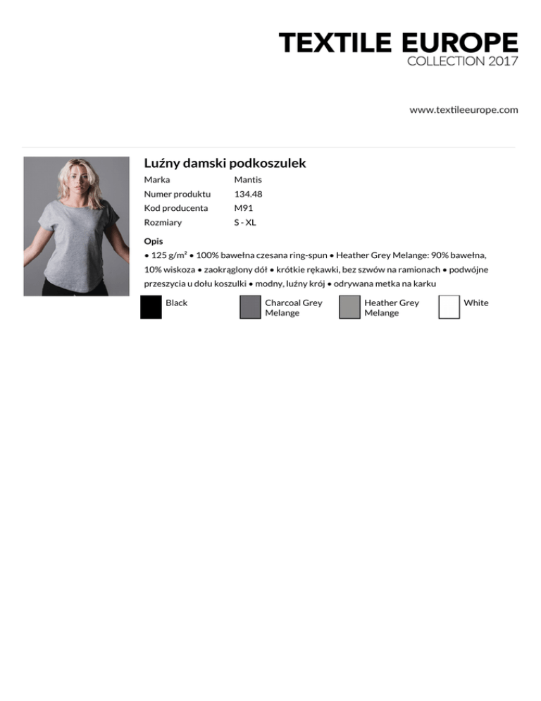 Luźny damski podkoszulek Marka Mantis Numer produktu 134.48 Kod producenta M91 Rozmiary S - XL Opis • 125 g/m² • 100% bawełna czesana ring-spun • Heather Grey Melange: 90% bawełna, 10% wiskoza • zaokrąglony dół • krótkie rękawki, bez szwów na ramionach • podwójne przeszycia u dołu koszulki • modny, luźny krój • odrywana metka na karku Black Charcoal Grey Melange Heather Grey Melange White