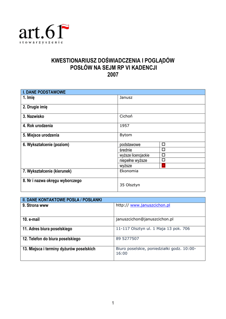 KWESTIONARIUSZ DOŚWIADCZENIA I POGLĄDÓW POSŁÓW NA SEJM RP VI KADENCJI 2007 I. DANE PODSTAWOWE 1. Imię Janusz 2. Drugie imię 3. Nazwisko Cichoń 4. Rok urodzenia 1957 5. Miejsce urodzenia Bytom 6. Wykształcenie (poziom) podstawowe średnie wyższe licencjackie niepełne wyższe wyższe 7. Wykształcenie (kierunek) Ekonomia 8. Nr i nazwa okręgu wyborczego 35 Olsztyn II. DANE KONTAKTOWE POSŁA / POSŁANKI 9. Strona www http:// www.januszcichon.pl 10. e-mail [email protected] 11. Adres biura poselskiego 11-117 Olsztyn ul. 1 Maja 13 pok. 706 12. Telefon do biura poselskiego 89 5277507 13. Miejsca i terminy dyżurów poselskich Biuro poselskie, poniedziałki godz. 10:0016:00 1 III. INFORMACJE BIOGRAFICZNE 14. Dotychczasowa kariera zawodowa od 1985: Uniwersytet Warmińsko-Mazurski w Olsztynie, Wydział Nauk Ekonomicznych, Międzynarodowe Centrum Biznesu i Administracji Publicznej, Katedra Analizy Rynku i Marketingu Adiunkt, prowadzenie badań dotyczących rynku pracy, konkurencyjności i rozwoju regionalnego, finansów publicznych oraz ekonomiki i organizacji gospodarki pasiecznej. od 2002: Wyższa Szkoła Informatyki i Ekonomii TWP w Olsztynie, Instytut Ekonomii, starszy wykładowca 2002-2006 Członek Zarządu Województwa Warmińsko-Mazurskiego 1991-1996 Współwłaściciel Firmy Consultingowej „KONSULTWARM”, doradca, konsultant. Współpraca między innymi z firmami: Sparks Companies, Land’ O Lakes, Indykpol, Tymbark, Morliny. 1996-1998 Z-ca Prezydenta Miasta Olsztyn 1998-2001 Prezydent Miasta Olsztyn 1992-1996 Udział w trzech 4-6 tygodniowych wyjazdach studyjnych dla nauczycieli akademickich organizowanych przez Department of Applied Economics, University of Minnesota (U of M) w ramach projektu finansowanego przez USAID (Amerykańska Agencja ds. Rozwoju Międzynarodowego) 1989 - 1990 Szkoła Główna Handlowa w Warszawie - staż naukowy, prowadzenie badań w zakresie demograficznych uwarunkowań rozwoju na obszarach wiejskich oraz produktywności pracy 1981-1984 Państwowe Przedsiębiorstwo Gospodarki Rolnej w Wydminach, Zakład Rolny w Berkowie, specjalista, główny specjalista. 15. Aktywność społeczna i polityczna Prosimy o opisanie Pana(i) dotychczasowej aktywności społecznej (w tym przynależności do organizacji pozarządowych) oraz aktywności politycznej (w tym przynależności do partii i ugrupowań politycznych). 1990-1994 Konsultant i doradca Sejmiku Samorządowego Województwa Olsztyńskiego oraz członek zespołu ds. informatyzacji kraju Krajowego Sejmiku Samorządu Terytorialnego 19941998 Radny RM Olsztyn, Z-ca Prezydenta Miasta, Delegat do Sejmiku Wojewódzkiego i Krajowego 1998-2001 Prezydent Miasta Olsztyn 1998-2002 Radny RM 2002-2006 Członek Zarządu Województwa Warmińsko-Mazurskiego 2006 Radny Województwa WarmińskoMazurskiego, przewodniczący Komisji Strategii i Rozwoju 2007 Poseł na Sejm Członek PTE TWP Prezes Oddziału Regionalnego PTE w Olsztynie Członek Zarządu Krajowego PTE Członek rady Regionalnej TWP Członek Platformy Obywatelskiej IV. MOTYWY KANDYDOWANIA, OBSZARY ZAINTERESOWANIA 16. Jakie są motywy, dla których podjął/podjęła Pan(i) decyzję o kandydowaniu w wyborach do Sejmu RP? Przekonanie, że wybory mogą wprowadzić zmiany, szereg reform oraz że ich wynik ma realny wpływ na otaczający nas świat. Przeświadczenie, że mogę być głosem obywateli, którzy dzięki mojej osobie mogą wyrazić swoje potrzeby oraz oczekiwania wobec państwa. Przekonanie, że nasz wybór przesądzi o tym: Jakie zapłacimy podatki? Czy powstaną nowe miejsca pracy? Jak będzie funkcjonowała służba zdrowia? Czy będziemy wreszcie czuć się bezpiecznie we własnym kraju? Czy będzie warto Tu żyć ? Uważam, że mam wiedzę i doświadczenie, które warto spożytkowac dla wspólnego dobra, że mogę z siebie coś dac, że będę mógł pilnować tego by podejmowane w Parlamencie decyzje były racjonalne i mądre. 2 17. Jakie są główne cele Pana(i) działalności jako Posła / Posłanki na Sejm RP VI kadencji? 1.Chcę być posłem regionalnym, dbać o to by Warmia i Mazury nadrabiała dystans dzielacy ją od innnych regionów Polski i Europy. To Posłowie decydują o tym jak środki budżetu państwa i zagospodarować środki płynące do nas z Unii Europejskiej. Ile? Jeśli w ogóle przeznaczyć na przykład, na budowę dróg, lotnisk, sieci światłowodowych? Gdzie? i jak? mają być one budowane. W jakiej formie? Do kogo trafić mają te pieniądze? Warmia i Mazury były dotąd w tych podziałach wyraźnie dyskryminowane. Moim celem, jest zatem przerwanie tej dyskryminacji. Kluczowe znaczenie ma tutaj dostępnośc komunikacyjna Warmi i Mazur. 2. Mam zamiar uświadomic rządzącym znaczenie turystyki w gospodarce i doprowadzic do tego, ze będzie ona traktowana jak gałąź gospodarki. Gałąź gospodarki wytwarzająca więcej niż rolnictwo, czy górnictwo i przemysł razem wzięte (udział w PKB). Chciałbym, by za tą świadomością poszły konkretne działania Państwa zmierzające do wzrostu konkurencyjności polskiej turystyki (promocja Polski, wsparcie inwestycji wspomagających rozwój turystyki). 3. Budowanie konkurencyjności Polski- upowszechnienie wiedzy na temat kapitału społecznego i jego roli w budowaniu konkurencyjnosci krajów i regionów, tworzenie klimatu służącego powstawaniu więzi pomiędzy instytucjami państwa, organizacjami pozarządowymi, przedsiębiorstwami, grupami i pojedyńczymi ludźmi.... 4. Doprowadzenie do reformy finansów publicznych- racjonalizacja wydatków publicznych, reforma systemu podatkowego. Szczególną wagę przypisuję zmniejszeniu najbardziej niesprawiedliwych podatków np. VAT 18. Jakie najważniejsze działania podejmie Pan(i) na rzecz mieszkańców Pana(i) okręgu wyborczego? 1. Będę zabiegał o szybką poprawę dostępnpości komunikacyjnej regionu: -modernizacja dróg zwłaszcza: \"7\" \"16\" \"51\" \"63\" \"65\" -modernizacja lini kolejowych E65(W-wa-Gdańsk) Olsztyn-Elbląg