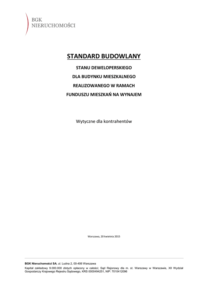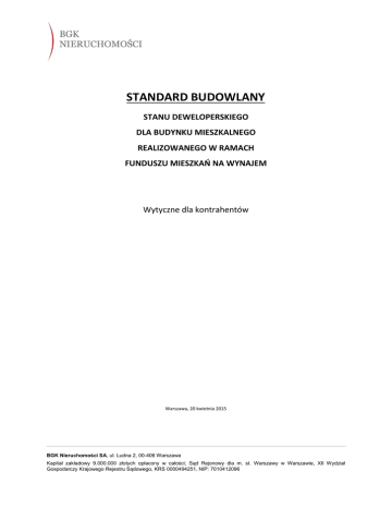 STANDARD BUDOWLANY STANU DEWELOPERSKIEGO DLA BUDYNKU MIESZKALNEGO REALIZOWANEGO W RAMACH FUNDUSZU MIESZKAŃ NA WYNAJEM Wytyczne dla kontrahentów Warszawa, 20 kwietnia 2015 BGK Nieruchomości SA, ul. Ludna 2, 00-406 Warszawa Kapitał zakładowy 9.000.000 złotych opłacony w całości; Sąd Rejonowy dla m. st. Warszawy w Warszawie, XII Wydział Gospodarczy Krajowego Rejestru Sądowego, KRS 0000494251, NIP: 7010412096 I. INFORMACJE OGÓLNE 1. Wstęp Celem niniejszego dokumentu jest prezentacja parametrów, kryteriów oraz wytycznych dla projektowania i wykonania budynków realizowanych w ramach projektów nadzorowanych przez Fundusz Mieszkań na Wynajem. Obowiązujące regulacje prawne i techniczne dotyczące projektowania, wykonania i odbioru budynków mieszkalnych wielorodzinnych są przepisami nadrzędnymi nad treścią przedmiotowego opracowania. Kryteriami rozszerzającymi wymagania stawiane projektantom i inwestorom - w ramach obowiązujących przepisów dotyczących projektowania budynków mieszkalnych wielorodzinnych - jest wznoszenie budynków o rozwiązaniach: a. proekologicznych uwzględniających normy i przepisy ochrony środowiska i gospodarowania odpadami, b. energooszczędnych minimalizujących konieczność zużycia energii elektrycznej dla zapewnienia podstawowych warunków użytkowania lokali mieszkalnych przez najemców oraz części wspólnych niezbędnych do prawidłowej eksploatacji budynku, c. termo oszczędnych minimalizujących konieczność zużycia energii cieplnej dla zapewnienia podstawowych warunków użytkowania lokali mieszkalnych przez najemców i niezbędnych do prawidłowej eksploatacji budynku. W przypadku budynków będących w fazie realizacji - gdzie każda nieruchomość ma swoją specyfikę wynikającą z lokalizacji, kształtu działki, uwarunkowań planistycznych, a budynek jest wznoszony wg. zatwierdzonego projektu budowlanego oraz innej dokumentacji technicznej – zastane i możliwe do zmian rozwiązania architektoniczne będą przedmiotem indywidualnej analizy i negocjacji. W przypadku inwestycji planowanych analizę nakładów i kosztów realizacji budynku należy wykonać z uwzględnieniem zaleceń wyszczególnionych w niniejszym opracowaniu. 1 BGK Nieruchomości SA, ul. Ludna 2, 00-406 Warszawa Kapitał zakładowy 9.000.000 złotych opłacony w całości; Sąd Rejonowy dla m. st. Warszawy w Warszawie, XII Wydział Gospodarczy Krajowego Rejestru Sądowego, KRS 0000494251, NIP: 7010412096 Należy podkreślić, że każda z nieruchomości - potencjalnych lokat Funduszu, będzie przedmiotem pogłębionej analizy, oraz że ostateczną decyzję o zakupie nieruchomości będzie podejmował Fundusz. Oznacza to, iż nie każdy obiekt lub nie każdy projekt planowanego budynku spełniający kryteria zostanie nabyty do portfela Funduszu. 2. Nieruchomość Do portfela Funduszu nabywane będą wydzielone geodezyjnie nieruchomości gruntowe zabudowane budynkami mieszkaniowymi wielorodzinnymi oraz nieruchomości gruntowe z prawem zabudowy budynkami wielorodzinnymi stanowiące niezależną i funkcjonalną całość. Nie przewiduje się nabywania do portfela Funduszu pojedynczych mieszkań zlokalizowanych w różnych budynkach, ani wydzielonych części budynków (tzn. zbioru mieszkań dostępnego w jednej klatce schodowej). Ponadto preferowane będą nieruchomości na prawie własności względem nieruchomości w użytkowaniu wieczystym. Nabywane nieruchomości muszą mieć zapewniony dostęp do drogi publicznej. Wielkość i zagospodarowanie działki winny być dostosowane do zapewnienia niezbędnych potrzeb mieszkańców (miejsca postojowe, ewentualnie miejsca rekreacyjne, place zabaw dla dzieci). 3. Preferowana struktura mieszkań STRUKTURA wyjściowa - 100 lokali mieszkalnych powierzchnia MIN. powierzchnia MAX. średnia powierzchnia lokali il.lokali w danym typie udział LOKALI % M1 klasyczne 25 29 27 10 10% M1 komfortowe 30 34 32 21 21% M2 klasyczne 38 44 41 17 17% M2 komfortowe 45 48 47 34 34% M3 klasyczne 53 57 55 5 5% M3 komfortowe 58 66 62 10 10% M4 klasyczne 70 76 73 3 3% M4 komfortowe 76 86 81 0 0% 43,34 100 100% SUMY udział LOKALI % 31% 51% 15% 3% 100% M4 - lokalizować tylko na ostatnim pietrze Powierzchnia użytkowa mieszkań będzie liczona zgodnie z normą PN-ISO 9836:1997, chyba że projekt budowlany został wydany w oparciu o PN-70/B-02365. 4. Preferowana struktura budynku Zagospodarowanie powierzchni: a. Parter (pierwsza kondygnacja): powierzchnie handlowo-usługowe (o ile przewiduje MPZP lub decyzja WZ oraz jeżeli uzasadnia lokalizacja budynku i nie jest uciążliwe dla mieszkań powyżej) oraz mieszkania. 2 BGK Nieruchomości SA, ul. Ludna 2, 00-406 Warszawa Kapitał zakładowy 9.000.000 złotych opłacony w całości; Sąd Rejonowy dla m. st. Warszawy w Warszawie, XII Wydział Gospodarczy Krajowego Rejestru Sądowego, KRS 0000494251, NIP: 7010412096 b. Piętra od +1 (od drugiej kondygnacji) wzwyż: lokale mieszkalne. c. Miejsca postojowe: kondygnacje podziemne, poziom parteru lub na terenie nieruchomości. d. Kondygnacje podziemne: powierzchnie garażowe, komórki lokatorskie, pomieszczenia techniczne, gospodarcze. 5. Ogólne wytyczne Fundusz będzie inwestował w budynki mieszkalne spełniające standardy odpowiednie dla danej lokalizacji oraz wykonane zgodnie z przepisami: a. Prawa Budowlanego, b. Rozporządzenia Ministra Infrastruktury w sprawie warunków technicznych jakim powinny odpowiadać budynki i ich usytuowanie, c. Normami technicznymi oraz innymi przepisami z zakresu planowania przestrzennego i ochrony zabytków w Polsce. Stosowana technologia budowy może być tradycyjna murowana lub żelbetowa. Ponadto dopuszczalne jest zastosowanie nowoczesnych systemów budowy z tzw. gotowych modułów w technologiach sprawdzonych, z odpowiednio długim doświadczeniem w warunkach pogodowych zbliżonych do polskich np. Niemcy, kraje skandynawskie. 6. Oczekiwane okresy gwarancji: Konstrukcja – 15 lat Powłoki dachu i izolacje – 
