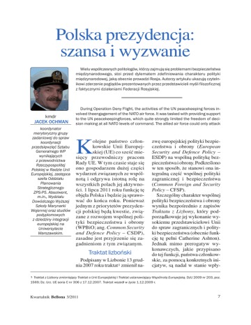 Polska prezydencja: szansa i wyzwanie Wielu współczesnych politologów, którzy zajmują się problemami bezpieczeństwa międzynarodowego, stoi przed dylematem zdefiniowania charakteru polityki międzynarodowej, jaką obecnie prowadzi Rosja. Autorzy artykułu ukazują czytelnikowi zderzenie poglądów prezentowanych przez przedstawicieli myśli filozoficznej z faktycznymi działaniami Federacji Rosyjskiej. kmdr JACEK OCHMAN koordynator merytoryczny grupy zadaniowej do spraw koordynacji przedsięwzięć Sztabu Generalnego WP wynikających z przewodnictwa Rzeczypospolitej Polskiej w Radzie Unii Europejskiej, zastępca szefa Oddziału Planowania Strategicznego ZPS-P5. Absolwent, m.in., Wydziału Dowódczego Wyższej Szkoły Marynarki Wojennej oraz studiów podyplomowych z dziedziny integracji europejskiej na Uniwersytecie Warszawskim. During Operation Deny Flight, the activities of the UN peacekeeping forces involved theengagement of the NATO air force. It was tasked with providing support to the UN peacekeepingforces, which quite strongly limited the freedom of decision making at all NATO levels of command. The allied air force could only attack K olejne państwo członkowskie Unii Europejskiej (UE) co sześć miesięcy przewodniczy pracom Rady UE. W tym czasie staje się ono gospodarzem dużej części wydarzeń związanych ze wspólnotą i odgrywa istotną rolę na wszystkich polach jej aktywności. 1 lipca 2011 roku funkcję tę objęła Polska i będzie ją sprawować do końca roku. Ponieważ jednym z priorytetów prezydencji polskiej będą kwestie, związane z rozwojem wspólnej polityki bezpieczeństwa i obrony (WPBiO; ang. Common Security and Defence Policy – CSDP), zasadne jest przyjrzenie się zagadnieniom z tym związanym. Traktat lizboński Podpisany w Lizbonie 13 grudnia 2007 roku traktat1 zmienił na- zwę europejskiej polityki bezpieczeństwa i obrony (European Security and Defence Policy – ESDP) na wspólną politykę bezpieczeństwa i obrony. Podkreślono w ten sposób, że stanowi ona integralną część wspólnej polityki zagranicznej i bezpieczeństwa (Common Foreign and Security Policy – CFSP). Szczególny charakter wspólnej polityki bezpieczeństwa i obrony wynika bezpośrednio z zapisów Traktatu z Lizbony, który podporządkowuje jej wykonanie wysokiemu przedstawicielowi Unii do spraw zagranicznych i polityki bezpieczeństwa (obecnie funkcję tę pełni Catherine Ashton). Jednak mimo prerogatyw wykonawczych, jakie przypisano do tej funkcji, państwa członkowskie, za pomocą konkretnych inicjatyw, są nadal w stanie wpły- Traktat z Lizbony zmieniający Traktat o Unii Europejskiej i Traktat ustanawiający Wspólnotę Europejską. DzU 2009 nr 203, poz. 1569; Dz. Urz. UE seria C nr 306 z 17.12.2007. Traktat wszedł w życie 1.12.2009 r. 1 Kwartalnik Bellona 3/2011 Bezpieczeństwo wać na wspólną politykę bezpieczeństwa i obrony. Katalog misji ESDP, określony w traktacie nicejskim (1) (misje humanitarne i ratunkowe, utrzymywania pokoju, zbrojne służące zarządzaniu kryzysowemu, w tym misje przywracania pokoju), w dokumencie podpisanym w Lizbonie został uzupełniony o wspólne działania rozbrojeniowe, misje doradztwa wojskowego i wsparcia, misje zapobiegania konfliktom oraz operacje stabilizacji sytuacji po zakończeniu konfliktów. Ponadto podkreślono w nim, że zadania te mogą przyczyniać się do walki z terroryzmem, w tym poprzez wspieranie państw trzecich w zwalczaniu terroryzmu na ich terytoriach (art. 43). WYJAŚNIENIE NR 1 Traktat nicejski (oficjalnie: Traktat z Nicei zmieniający Traktat o Unii Europejskiej, Traktat ustanawiający Wspólnotę Europejską oraz niektóre związane z nimi akty prawne) – umowa międzynarodowa parafowana w grudniu 2000 r., podpisana 26 lutego 2001 r. w Nicei. Wszedł w życie 1 lutego 2003 r. i był pomyślany przede wszystkim jako mający zreformować Unię Europejską, by mogła sprawnie działać po przyjęciu dziesięciu nowych krajów z Europy Środkowej i Południowej. Traktat nicejski ustanowił oficjalnie Komitet Polityczny i Bezpieczeństwa (Political and Security Committee – PSC). Traktat lizboński jest pierwszym dokumentem wiążącym Unii Europejskiej, w którym jasno potwierdzono istniejącą praktykę oddawania do dyspozycji UE [narodowych] zdolności cywilnych i wojskowych oraz powierzania przez Radę przeprowadzenia misji grupie Państw Członkowskich, które wyrażą taką wolę i które dysponują zdolnościami wymaganymi dla tej misji (art. 44). Ponadto nałożono na państwa obowiązek rozwoju swych zdolności wojskowych tak, aby były w stanie wykonywać zadania wynikające z traktatu. Podkreślono także rolę Europejskiej Agencji Obrony (European Defence Agency – EDA), która uzyskała umocowanie traktatowe. 2 Do najważniejszych zapisów dokumentu lizbońskiego, mogących mieć implikacje dla sił zbrojnych, należy zaliczyć postanowienia dotyczące bezpieczeństwa energetycznego i solidarności obronnej. Po raz pierwszy wyraźnie odniesiono się do zagadnień bezpieczeństwa energetycznego. Unia otrzymała jasne i mocne kompetencje, które mają zapewnić właściwe funkcjonowanie rynku energetycznego i dostaw surowców energetycznych. Traktat zawiera też w odniesieniu do tej dziedziny tak zwaną klauzulę solidarności. Zgodnie z zapisami dotyczącymi trudności z zapewnieniem dostaw pewnych produktów (energii): Rada, na wniosek Komisji, może podjąć decyzję, w duchu solidarności między Państwami Członkowskimi, co do środków właściwych ze względu na sytuację ekonomiczną, w szczególności gdy wystąpią poważne trudności w dostawie pewnych produktów, głównie w obszarze energii2. W podobnym tonie są utrzymane zapisy mówiące, że polityka energetyczna Unii Europejskiej, prowadzona w duchu solidarności między państwami członkowskimi, ma na celu, między innymi, zapewnienie sprawnego funkcjonowania rynku energetycznego oraz bezpieczeństwa dostaw ener