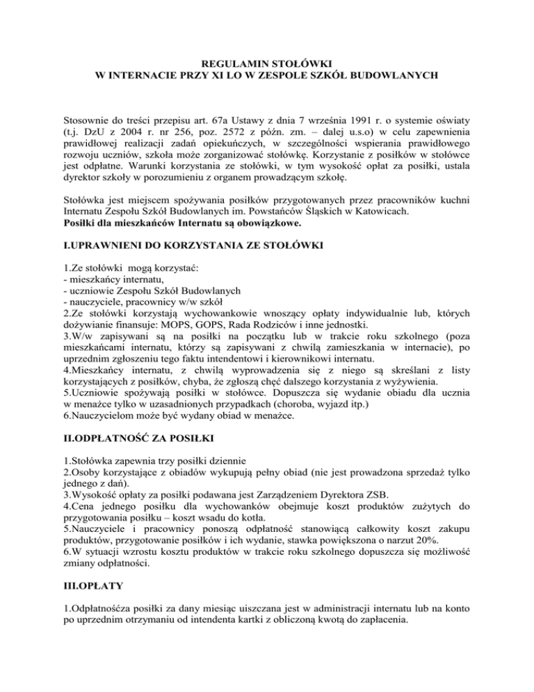 REGULAMIN STOŁÓWKI W INTERNACIE PRZY XI LO W ZESPOLE SZKÓŁ BUDOWLANYCH Stosownie do treści przepisu art. 67a Ustawy z dnia 7 września 1991 r. o systemie oświaty (t.j. DzU z 2004 r. nr 256, poz. 2572 z późn. zm. – dalej u.s.o) w celu zapewnienia prawidłowej realizacji zadań opiekuńczych, w szczególności wspierania prawidłowego rozwoju uczniów, szkoła może zorganizować stołówkę. Korzystanie z posiłków w stołówce jest odpłatne. Warunki korzystania ze stołówki, w tym wysokość opłat za posiłki, ustala dyrektor szkoły w porozumieniu z organem prowadzącym szkołę. Stołówka jest miejscem spożywania posiłków przygotowanych przez pracowników kuchni Internatu Zespołu Szkół Budowlanych im. Powstańców Śląskich w Katowicach. Posiłki dla mieszkańców Internatu są obowiązkowe. I.UPRAWNIENI DO KORZYSTANIA ZE STOŁÓWKI 1.Ze stołówki mogą korzystać: - mieszkańcy internatu, - uczniowie Zespołu Szkół Budowlanych - nauczyciele, pracownicy w/w szkół 2.Ze stołówki korzystają wychowankowie wnoszący opłaty indywidualnie lub, których dożywianie finansuje: MOPS, GOPS, Rada Rodziców i inne jednostki. 3.W/w zapisywani są na posiłki na początku lub w trakcie roku szkolnego (poza mieszkańcami internatu, którzy są zapisywani z chwilą zamieszkania w internacie), po uprzednim zgłoszeniu tego faktu intendentowi i kierownikowi internatu. 4.Mieszkańcy internatu, z chwilą wyprowadzenia się z niego są skreślani z listy korzystających z posiłków, chyba, że zgłoszą chęć dalszego korzystania z wyżywienia. 5.Uczniowie spożywają posiłki w stołówce. Dopuszcza się wydanie obiadu dla ucznia w menażce tylko w uzasadnionych przypadkach (choroba, wyjazd itp.) 6.Nauczycielom może być wydany obiad w menażce. II.ODPŁATNOŚĆ ZA POSIŁKI 1.Stołówka zapewnia trzy posiłki dziennie 2.Osoby korzystające z obiadów wykupują pełny obiad (nie jest prowadzona sprzedaż tylko jednego z dań). 3.Wysokość opłaty za posiłki podawana jest Zarządzeniem Dyrektora ZSB. 4.Cena jednego posiłku dla wychowanków obejmuje koszt produktów zużytych do przygotowania posiłku – koszt wsadu do kotła. 5.Nauczyciele i pracownicy ponoszą odpłatność stanowiącą całkowity koszt zakupu produktów, przygotowanie posiłków i ich wydanie, stawka powiększona o narzut 20%. 6.W sytuacji wzrostu kosztu produktów w trakcie roku szkolnego dopuszcza się możliwość zmiany odpłatności. III.OPŁATY 1.Odpłatnośćza posiłki za dany miesiąc uiszczana jest w administracji internatu lub na konto po uprzednim otrzymaniu od intendenta kartki z obliczoną kwotą do zapłacenia. 2.Wpłaty w kasie potwierdzone są dowodem wpłaty. Oryginał otrzymuje wpłacający, kopia pozostaje do rozliczenia dokumentacji stołówki. 3.Wpłacający przedstawia pokwitowanie wpłaty intendentowi i na tej podstawie otrzymuje bloczki żywnościowe na posiłki na dany miesiąc. 4.Księgowość szkoły na podstawie wyliczenia dokonanego przez intendenta wysyła rachunek do GOPS-u, MOPS-u lub innych jednostek, które dofinansowują wyżywienie konkretnym wychowankom. 5.Do momentu wpłaty intendent wydaje fragment bloczków żywnościowych do dnia, kiedy nastąpi wpłata. 6.Opłaty za posiłki należy uiszczać do 10 dnia miesiąca, za który opłata się należy. 7. W miesiącu wrześniu opłaty uiszcza się gotówkowo w dniu zakwaterowania. 8.W wyjątkowych przypadkach opłata może być dokonana po upływie wyznaczonej daty. IV.ZWROTY ZA POSIŁKI 1.Odliczenie z posiłków może nastąpić z powodu choroby, wycieczki, wyjazdu mieszkańca internatu do domu lub innych przyczyn losowych. 2.Nieobecność musi być zgłoszona kierownikowi internatu lub intendentowi osobiście lub telefonicznie z jednodniowym wyprzedzeniem (bez zgłoszenia osoba będzie liczona na posiłki i musi za nie zapłacić). 3.Należy zwrócić bloczki żywnościowe za niewykorzystane posiłki najpóźniej w dniu powrotu, w przeciwnym wypadku nie nastąpi odliczenie. 4.Odliczenie kwoty następuje z odpłatności w następnym miesiącu. 5.W przypadkach, gdy osoba korzystająca z posiłków zgłasza nieobecności w ściśle określonych dniach miesiąca przed dokonaniem opłaty za dany miesiąc (do 10 dnia) pomniejsza się ją o kwotę za zgłoszone dni. V.WYDAWANIE POSIŁKÓW 1.Posiłki przygotowywane są w dni nauki szkolnej: - od poniedziałku do piątku - śniadanie, obiad, kolacja. 2.Posiłki wydawane są w godzinach: śniadanie 6.00 – 8.30, obiad 13.00 – 17.00, kolacja 18.00 – 19.30 3.Posiłki wydawane są na podstawie bloczków żywnościowych. 4.Wychowanek, który kończy lekcje później niż o godz. 16,30 powinien ten fakt zgłosić w kuchni. Wówczas obiad będzie dla niego zatrzymany i wydany po godz. 17,00. 5.W stołówce wywieszony jest jadłospis (tzw. dekadówka) zatwierdzony przez kierownika internatu, kucharkę oraz intendenta. 6.Mieszkańcy mogą zgłaszać propozycje dań do jadłospisu. 7.Posiłki przygotowywane są zgodnie z zasadami racjonalnego żywienia i kalkulacją kosztów. VI.ZASADY ZACHOWANIA W STOŁÓWCE 1. Podczas spożywania posiłków obowiązują zasady kulturalnego zachowania: a) cisza , b) przestrzeganie kultury jedzenia: - właściwa postawa przy stoliku, - prawidłowe posługiwanie się sztućcami, - po spożyciu posiłku oddanie naczyń na zmywak - zwracanie uwagi na formy grzecznościowe: proszę, dziękuję przepraszam. 2.W stołówce mogą przebywać tylko osoby korzystające z wyżywienia. 3.Po spożyciu posiłku brudne naczynia należy odnieść w wyznaczone miejsce. 4.Nie wolno wynosić naczyń ze stołówki.