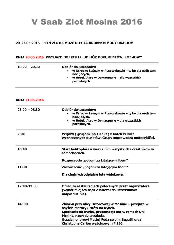 V Saab Zlot Mosina 2016 20-22.05.2016 PLAN ZLOTU, MOŻE ULEGAĆ DROBNYM MODYFIKACJOM DNIA 20.05.2016 PRZYJAZD DO HOTELI, ODBIÓR DOKUMENTÓW, ROZMOWY 18.00 – 20.00 Odbiór dokumentów: w Ośrodku Leśnym w Puszczykowie – tylko dla osób tam nocujących, w Hotelu Agro w Dymaczewie - dla wszystkich pozostałych. DNIA 21.05.2016 08.00 – 08.30 Odbiór dokumentów: w Ośrodku Leśnym w Puszczykowie – tylko dla osób tam nocujących, w Hotelu Agro w Dymaczewie – dla wszystkich pozostałych. 9:00 Wyjazd ( grupami po 10 aut ) z hoteli w kilka wyznaczonych punktów. Grupy poprowadzą motocykliści. 10:00 Start helikoptera a wraz z nim wszystkich uczestników w samochodach. Rozpoczęcie „pogoni za latającym lisem” 11:30 Zakończenie „pogoni za latającym lisem” Dla chętnych odpłatne loty widokowe. 12:00-13:30 Obiad, w restauracjach polecanych przez organizatora (wybór miejsca będzie należał do uczestników indywidualnie). 14: 00 Zbiórka przy ulicy Dworcowej w Mosinie – przejazd w asyście motocyklistów na Rynek. Spotkanie na Rynku, prezentacja aut w ramach Dni Mosiny, nagrody, atrakcje. Goście honorowi Maciej Peda swoim Bugatti oraz Christophe Carion wyścigowym F 126. 17:00 Koncert muzyki filmowej, Leśny Ośrodek Szkoleniowy ul. Adama Wodziczki 3, 62 – 040 Puszczykowo. 18.00 Dla dzieci wycieczka wozem konnym, Leśny Ośrodek Szkoleniowy ul. Adama Wodziczki 3, 62 – 040 Puszczykowo. Powrót do hoteli i przygotowania do kolacji. 19:00 Kolacja pod gwiazdami w hotelu, w którym odbierane były dokumenty. Opaska na rękę decyduje o miejscu kolacji (żółta – Hotel Agro, złota – Ośrodek Leśny). DNIA 22.05.2016 10:00 Wizyta w Muzeum Arkadego Fiedlera w Puszczykowie, ul. Słowackiego 1, 62 – 040 Puszczykowo. www.fiedler.pl 11:30 Pożegnanie i powrót do domów
