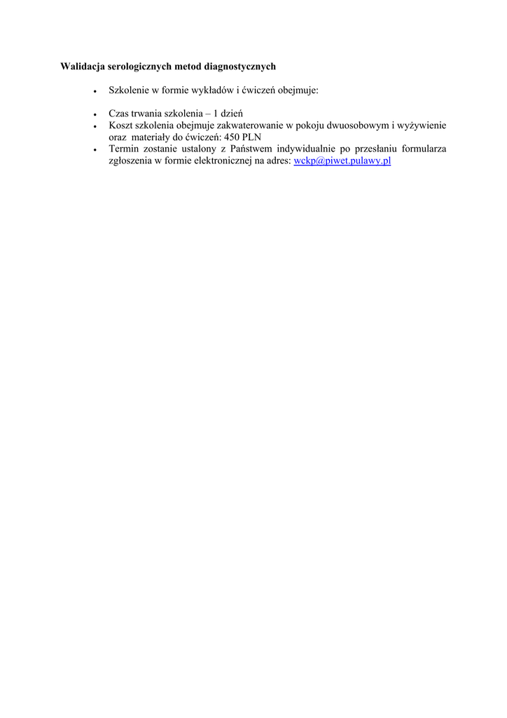 Walidacja serologicznych metod diagnostycznych • Szkolenie w formie wykładów i ćwiczeń obejmuje: • Czas trwania szkolenia – 1 dzień Koszt szkolenia obejmuje zakwaterowanie w pokoju dwuosobowym i wyżywienie oraz materiały do ćwiczeń: 450 PLN Termin zostanie ustalony z Państwem indywidualnie po przesłaniu formularza zgłoszenia w formie elektronicznej na adres: [email protected] • •