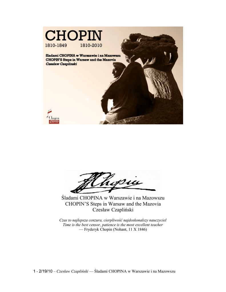 Śladami CHOPINA w Warszawie i na Mazowszu CHOPIN’S Steps in Warsaw and the Mazovia Czesław Czapliński Czas to najlepsza cenzura, cierpliwość najdoskonalszy nauczyciel Time is the best censor, patience is the most excellent teacher — Fryderyk Chopin (Nohant, 11 X 1846) 1 - 2/19/10 – Czesław Czapliński — Śladami CHOPINA w Warszawie i na Mazowszu Żelazowa Wola 1 marca 1810 Fryderyk Franciszek Chopin urodził się w Żelazowej Woli, wsi mazowieckiej leżącej nad rzeką Utratą, oddalonej o 54 kilometry na zachód od Warszawy, ówczesna posiadłość rodziny hr. Skarbków. Mimo wiloletnich naukowych badań, do dzisiaj nie ustalono, którego dnia urodził się Fryderyk Chopin. Według własnego oświadczenia na piśmie – 1 marca, według zapisu w metryce chrztu w kościele parafialnym w Brochowie – 22 lutego. Rodzice Fryderyka: ojciec, Mikołaj (1771-1844), urodzony w Marainville (w Lotaryngii), od 1987 przebywał w Polsce, spolonizował się i pełnił funkcję guwernera w rodzinie Skarbków, matka, Tekla Justyna (1782-1961) jako sierota, wychowywała się i przebywała w rodzinie Skarbków. Ślub Justyny i Mikołaja odbył się w 1806 roku w Brochowie. Pierwszym ich dzieckiem była Ludwika (1807-1855) starsza od Fryderyka o trzy lata, uzdolniona muzycznie i literacko siostra, późniejsza Jędrzejewiczowa. W Żelazowej Woli Fryderyk Chopin oprócz kilku miesięcy spędzonych po urodzeniu (od lutego do października 1810) odwiedzał latem 1823 i 1830 oraz w Boże Narodzenie 1825 i Nowy Rok 1826. Latem fortepian był wynoszony na zewnątrz do ogrodu, gdzie pod świerkiem lub lipami Fryderyk dawał koncerty w gronie rodziny i przyjaciół. W latach latach 1859-1878 w dworze mieszkał Adam Towiański, syn słynnego filozofa Andrzeja Towiańskiego i wówczas powstały plany uczczenia miejsca pamięci Chopina. Od 1891 rozpoczęto działania mające na celu przekształcenie miejsca urodzin Chopina w muzeum. W 1894 postawiono pierwszy obelisk na terenie parku. Po odzyskaniu niepodległości przez Polskę w 1918 obiektowi nadano status zabytku i udało się zakupić dworek z przyległym parkiem. W 1930 Komitet Budowy Domu Chopina rozpoczął przebudowę. W czasie II wojny światowej dworek został ogołocony, a po wojnie dworkiem zajął się Instytut Fryderyka Chopina. W 1949 w setną rocznicę śmierci Chopina odbyła się inaoguracja ekspozycji. Od 1950 przez dwa lata dom Chopina był pod zarządem Muzeum Narodowego. W 1953 opiekę nad Żalazową Wolą sprawowało Towarzystwo Fryderyka Chopina, zaś od 1 sierpnia 2005 funkcję tę przejął Narodowy Instytut Fryderyka Chopina. 2 - 2/19/10 – Czesław Czapliński — Śladami CHOPINA w Warszawie i na Mazowszu 3 - 2/19/10 – Czesław Czapliński — Śladami CHOPINA w Warszawie i na Mazowszu 4 - 2/19/10 – Czesław Czapliński — Śladami CHOPINA w Warszawie i na Mazowszu 5 - 2/19/10 – Czesław Czapliński — Śladami CHOPINA w Warszawie i na Mazowszu Brochów 23 kwietnia 1810 W kościele św. Rocha (obecnie: św. Jana Chrzciciela) w Brochowie (koło Sochaczewa) 23 kwietnia 1810 odbył się chrzest Fryderyka Chopina. Rodzicami chrzestnymi byli: Anna Skarbek, późniejsza Wiesiołowska, ze Strzyżewa oraz Fryderyk Skarbek, wychowanek Mikołaja Chopina, przyszły uczony i pisarz. Wcześniej 2 czerwca 1806 odbył się w Brochowie ślub rodziców Chopina — Mikołaja Chopina z Teklą Justyną z Krzyżanowskich. 6 - 2/19/10 – Czesław Czapliński — Śladami CHOPINA w Warszawie i na Mazowszu 7 - 2/19/10 – Czesław Czapliński — Śladami CHOPINA w Warszawie i na Mazowszu Pałac Saski 1810-1817 Mikołaj Chopin (ojciec Fryderyka) otrzymał propozycję nauki języka francuskiego w Liceum Warszawskim i przenosi się z rodziną do Warszawy. Pierwsze mieszkanie Chopinów mieściło się w Pałacu Saskim, w jego prawym skrzydle na drugim piętrze. W budynku tym mieściło się Liceum oraz mieszkania uczących w nim profesorów. W 1817 Pałac Saski decyzją Wielkiego Księcia Konstantego przeznacza na cele wojskowe, a szkoła z nauczycielami została przeniesiona do Pałacu Kazimierzowskiego. Grób Nieznanego Żołnierza pod kolumnadą Pałacu Saskiego istnieje od 1925. Początkowo był miejscem pamięci o Polakach poległych w latach 1914-18 i 1918-20 oraz nieznanych żołnierzy z Cmentarza Orląt Lwowskich. Koncepcję architektoniczną Grobu Nieznanego Żołnierza zaprojektował Stanisław Ostrowski. W czasie II wojny światowej Pałac Saski i Grób Nieznanego Żołnierza zostały zniszczone. Od 1946 arkada na Pl.Marszałka J.Piłsudskiego, otaczająca płytę Grobu Nieznanego Żołnierza, stanowi jedyny fragment Pałacu Saskiego, ocalały po zniszczeniach II wojny światowej. Na ścianie kolumn okalających grób – osiemnaście tablic upamiętniające miejsca walki i męczęństwa Polaków. Od strony Ogrodu Saskiego na kratach widnieją wizerunki trzech najważniejszych odznaczeń bojowych: Order Wojenny Virtuti Militari, Krzyż Walecznych i Krzyż Grunwaldu. W każdą niedzielę odbywa się przy Grobie Nieznanego Żołnierza uroczysta zmiana warty, na cześć poległym Polakom. 8 - 2/19/10 – Czesław Czapliński — Śladami CHOPINA w Warszawie i na Mazowszu Ogród Saski 1810-1830 Przez siedem lat (1810-1817) Fryderyk Chopin mieszkał nieopodal w Pałacu Saskim, więc na pewno odwiedzał Ogród Saski z matką, jako mały chłopczyk, jak również później w czasie spacerów z przyjaciółmi. Ogród Saski był ogrodami królewskim Augusta II Mocnego, od 1727 spełniały rolę publiczną - parku Warszawy. Dziś przylega do Pl.Piłsudskiego, gdzie jest duża fontanna w kształcie kielicha z 1855 zaprojektowana przez architekta Henryka Marconiego (17921863) oraz również przez niego zaprojektowany “Wodozbiór” (klasycystyczna wierza ciśnień) powstały w 1854 na wzgórzu. Koło fontanny znajduje się zegar słoneczny ufundowany w XIX w. przez naukowca i pisarza Antoniego Magiera (1762-1837). W drugiej połowie XX w.