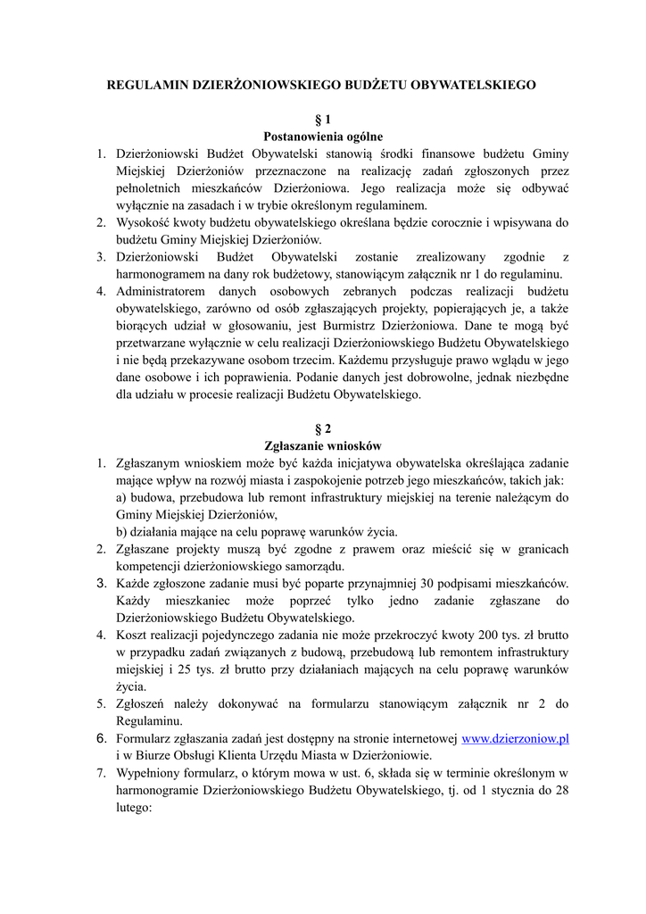 REGULAMIN DZIERŻONIOWSKIEGO BUDŻETU OBYWATELSKIEGO 1. 2. 3. 4. 1. 2. 3. 4. 5. 6. 7. §1 Postanowienia ogólne Dzierżoniowski Budżet Obywatelski stanowią środki finansowe budżetu Gminy Miejskiej Dzierżoniów przeznaczone na realizację zadań zgłoszonych przez pełnoletnich mieszkańców Dzierżoniowa. Jego realizacja może się odbywać wyłącznie na zasadach i w trybie określonym regulaminem. Wysokość kwoty budżetu obywatelskiego określana będzie corocznie i wpisywana do budżetu Gminy Miejskiej Dzierżoniów. Dzierżoniowski Budżet Obywatelski zostanie zrealizowany zgodnie z harmonogramem na dany rok budżetowy, stanowiącym załącznik nr 1 do regulaminu. Administratorem danych osobowych zebranych podczas realizacji budżetu obywatelskiego, zarówno od osób zgłaszających projekty, popierających je, a także biorących udział w głosowaniu, jest Burmistrz Dzierżoniowa. Dane te mogą być przetwarzane wyłącznie w celu realizacji Dzierżoniowskiego Budżetu Obywatelskiego i nie będą przekazywane osobom trzecim. Każdemu przysługuje prawo wglądu w jego dane osobowe i ich poprawienia. Podanie danych jest dobrowolne, jednak niezbędne dla udziału w procesie realizacji Budżetu Obywatelskiego. §2 Zgłaszanie wniosków Zgłaszanym wnioskiem może być każda inicjatywa obywatelska określająca zadanie mające wpływ na rozwój miasta i zaspokojenie potrzeb jego mieszkańców, takich jak: a) budowa, przebudowa lub remont infrastruktury miejskiej na terenie należącym do Gminy Miejskiej Dzierżoniów, b) działania mające na celu poprawę warunków życia. Zgłaszane projekty muszą być zgodne z prawem oraz mieścić się w granicach kompetencji dzierżoniowskiego samorządu. Każde zgłoszone zadanie musi być poparte przynajmniej 30 podpisami mieszkańców. Każdy mieszkaniec może poprzeć tylko jedno zadanie zgłaszane do Dzierżoniowskiego Budżetu Obywatelskiego. Koszt realizacji pojedynczego zadania nie może przekroczyć kwoty 200 tys. zł brutto w przypadku zadań związanych z budową, przebudową lub remontem infrastruktury miejskiej i 25 tys. zł brutto przy działaniach mających na celu poprawę warunków życia. Zgłoszeń należy dokonywać na formularzu stanowiącym załącznik nr 2 do Regulaminu. Formularz zgłaszania zadań jest dostępny na stronie internetowej www.dzierzoniow.pl i w Biurze Obsługi Klienta Urzędu Miasta w Dzierżoniowie. Wypełniony formularz, o którym mowa w ust. 6, składa się w terminie określonym w harmonogramie Dzierżoniowskiego Budżetu Obywatelskiego, tj. od 1 stycznia do 28 lutego: a) korespondencyjnie na adres Urzędu Miasta w Dzierżoniowie z adnotacją na kopercie „Dzierżoniowski Budżet Obywatelski”. Za datę złożenia uważa się datę stempla pocztowego; b) osobiście w Biurze Obsługi Klienta Urzędu Miasta w Dzierżoniowie, Rynek 1. 1. 2. 3. 4. §3 Weryfikacja zgłoszonych zadań Zgłoszone wnioski gromadzi i analizuje powołany przez burmistrza zespół ds. Dzierżoniowskiego Budżetu Obywatelskiego. Zadania analizowane są pod kątem: a) formalno-prawnej możliwości realizacji zgłoszonego zadania; b) rzeczywistych kosztów jego realizacji; c) możliwości zabezpieczenia w latach następnych kosztów wynikających z bieżącego utrzymania zadania. Jeżeli w wyniku przeprowadzonej analizy okaże się, że złożony wniosek: a) nie zawiera istotnych informacji potrzebnych do analizy; b) ma uchybienia formalne; osoba zgłaszająca wniosek zostanie poinformowana o konieczności dokonania uzupełnień. Zespół ds. Dzierżoniowskiego Budżetu Obywatelskiego weryfikuje zgłoszone zadania na karcie analizy zadania stanowiącej załącznik nr 4 do Regulaminu do 30 kwietnia oraz dokonuje wyboru zadań, które znajdą się na ostatecznej liście podlegającej głosowaniu. Lista, o której mowa w ust. 3 oraz lista wniosków odrzuconych wraz z uzasadnieniem, podana będzie do publicznej wiadomości poprzez zamieszczenie jej na stronie www.dzierzoniow.pl i wywieszenie na tablicy ogłoszeń Urzędu Miasta w Dzierżoniowie. §4 Wybór zadań do realizacji w trybie głosowania 1. Wyboru zadań do Dzierżoniowskiego Budżetu Obywatelskiego dokonują mieszkańcy Dzierżoniowa w bezpośrednim, powszechnym i jawnym głosowaniu. 2. Prawo do głosowania ma każdy pełnoletni mieszkaniec Dzierżoniowa (nie dotyczy Młodzieżowego Budżetu Obywatelskiego). 3. Głosowanie odbywa się w następujący sposób: a) na stronie internetowej www.dzierzoniow.pl z wykorzystaniem platformy ePUAP; b) tradycyjnie - w siedzibie Urzędu Miasta w Dzierżoniowie i jednostkach podległych. 4.Głosowanie trwać będzie od 23 maja do 5 czerwca. Wzór karty do głosowania stanowi załącznik nr 3 do Regulaminu. 5. Głosowanie odbywa się poprzez postawienie znaku „X” przy wybranym zadaniu na karcie do głosowania. Głosujący może zagłosować tylko jeden raz i wybrać jedno zadanie z listy wskazanych w karcie do głosowania. Jeżeli głosujący zaznaczy więcej niż jedno pole – głos będzie nieważny. 6. Na karcie do głosowania należy podać imię, nazwisko, adres zamieszkania i nr PESEL oraz złożyć własnoręczny podpis (w przypadku głosowania przez platformę ePUAP należy posłużyć się profilem zaufanym). 7. Karta do głosowania wypełniona niewłaściwie, zawierająca niewłaściwe dane, będzie uznana za nieważną. 9. W przypadku wypełnienia przez jedną osobę kilku kart do głosowania, wszystkie karty wypełnione przez tę osobę będą uznane za nieważne. 9. W przypadku wypełnienia kart do głosowania przez osoby nieuprawnione, wszystkie karty wypełnione przez te osoby będą uznane za nieważne. 10. Wyniki głosowania ustala zespół ds. Dzierżoniowskiego Budżetu Obywatelskiego na podstawie liczby głosów uzyskanych przez poszczególne zadania. 11. Za wybrane do realizacji uznaje się zadania, które uzyskały największą liczbę głosów, aż do wyczerpania puli środków przeznaczonych na Dzierżoni