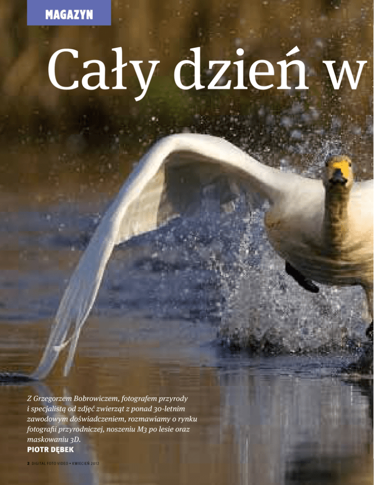 Cały dzień w Z Grzegorzem Bobrowiczem, fotografem przyrody i specjalistą od zdjęć zwierząt z ponad 30-letnim zawodowym doświadczeniem, rozmawiamy o rynku fotografii przyrodniczej, noszeniu M3 po lesie oraz maskowaniu 3D. piotr dębek 2 DIGITAL FOTO VIDEO • k wiecień 2012 zawód: fotograf ukryciu DFV: Niedawno ukazał się Pański album „Polska dzika przyroda” – solidny tom o wymiarach 27x33 cm, liczący ponad 270 stron i prezentujący tyleż zdjęć. To Pańska trzynasta publikacja książkowa, mająca szczególną pozycję w dorobku. Grzegorz Bobrowicz: To mój pierwszy album w pełni autorski, stanowiący formę podsumowania tego, co robiłem do tej pory. Wcześniejsze pozycje były zorientowane na prezentowanie pewnych obszarów, np. monografie parków krajobrazowych, a moja fotografia pełniła tam często rolę uzupełniającą. Na książkach przyrodniczych dobrze się zarabia? Niezbyt. To zajęcie dla ludzi z pasją. Moją motywacją do pracy nad tym albumem i wydania go była chęć stworzenia formy portfolio – tomu, który zbierałby mój dorobek i stanowił podsumowanie dotychczasowych osiągnięć. Czy można się utrzymać wyłącznie z fotografii przyrodniczej? Jest przynajmniej kilkunastu fotografów w Polsce, którzy tego próbują, choć... co najmniej część z nich wspomaga się innym rodzajem dochodów, np. fotografowaniem ślubów. Pan się wspomaga dokumentacjami przyrodniczymi... Tak, mam jednoosobową firmę Ciconia, która dla jednostek administracji publicznej i organizacji pozarządowych wykonuje inwentaryzacje i waloryzacje przyrodnicze rezerwatów przyrody, parków krajobrazowych, użytków ekologicznych i innych obszarów. Najchętniej poświęciłbym się wyłącznie fotografii, ale uzyskanie zlecenia na kilka takich dokumentacji na początku roku daje mi świadomość, że to będzie finansowo bezpieczny rok. Takie zlecenia mają też dodatkowe zalety – w wiele miejsc bym się nie wybrał, do niektórych miałbym utrudniony dostęp, a tak, robiąc inwentaryzację, przy okazji zapoznaję się z terenem, który niekiedy eksploruję potem fotograficznie. W ten sposób też powstała część moich poprzednich książek – wykonałem do nich zdjęcia przy okazji inwentaryzacji albo na zlecenia ze strony administracji publicznej, która potrzebowała ich do materiałów promujących atrakcje regionu. To są publikacje nie do końca rynkowe, bo ich opłacalność nie jest zależna od liczby sprzedanych egzemplarzy. Takie dynamiczne ujęcia, zwłaszcza gdy ptak błyskawicznie zbliża się do fotografa, wymagają szybkiego autofokusu. Tutaj najlepiej sprawdzi się profesjonalny 1D. W pozostałych sytuacjach fotograf preferuje Canona 5D ze względu na lepszą jakość obrazu na wysokich czułościach oraz możliwość uzyskania większych odbitek. Jak wygląda dzisiaj rynek na fotografię przyrodniczą? Jest bardzo trudny. W ciągu ostatniej dekady ceny za zdjęcia spadły przynajmniej dwukrotnie. Zdarza się, że fotografie sprzedaje się poniżej 100 zł za sztukę. Pojawiło się wielu hobbystów, którzy tylko chcą być wydrukowani – nie oczekują za to pieniędzy. To też przyzwyczaiło wiele redakcji, które dziś twierdzą, że publikując zdjęcie, robią autorowi reklamę. Przeżyć można, różnicując źródła dochodów: z albumów, ale też odczytów, prac zleconych dla samorządów czy – jak w moim przypadku – dokumentacji przyrodniczych. Niestety, nie ma u nas rynku na sprzedaż dużych odbitek pejzażowych czy przyrodniczych do powieszenia na ścianę. To dobrze funkcjonuje w Stanach Zjednoczonych, ale nie w Polsce. U nas natomiast w ostatnich latach pojawiły się realizowane czy to przez gminy, czy przez organizacje pozarządowe programy na stworzenie różnego rodzaju ścieżek edukacyjnych lub izb edukacji ekologicznej. k wiecień 2012 • DIGITAL FOTO VIDEo 3 To nie są projekty przeznaczone stricte dla fotografa, ale jest tam często zapotrzebowanie na zdjęcia dokumentacyjne lub reklamowe, więc i dla fotografa praca się znajdzie. Na takie prace może jednak liczyć najczęściej fotograf z solidnym dorobkiem. Nie chodzi tylko o wiarygodność w oczach zleceniodawcy, ale też np. o to, że takie projekty mają często fatalne terminy realizacji. Mnie ostatnio np. zdarzyło się otrzymać w połowie lipca zlecenie, które miało być ukończone do końca roku i zawierać zdjęcia danego obszaru, przedstawiające go w różnych porach roku, więc zdjęcia wiosenne albo już trzeba mieć w archiwum, albo znać fotografów, którzy takie zdjęcia wykonali. Czy polecałby Pan ten rodzaj fotografii jako profesję młodym miłośnikom fotografii? Wyrobienie sobie dzisiaj nazwiska i kontaktów, które są potrzebne do sprzedaży zdjęć, jest znacznie trudniejsze, niż było to jeszcze 20 lat temu. Teraz rywalizuje się nie tylko z grupką zawodowców, ale także z całkiem nowym rodzajem konkurencji: fotoamatorami, którzy dobrze zarabiają w tygodniu, np. w bankowości, a w weekend jadą w plener i robią niezłe zdjęcia. Finanse nie stanowią dla nich problemu, więc mają świetny sprzęt, a co więcej – nie są zainteresowani zarabianiem na zdjęciach, a tylko ich publikacją. Chętnie zgadzają się na publikację za darmo, byle fotografie były podpisane nazwiskiem autora. Świadomie lub nieświadomie psują rynek, a ponieważ wielu z nich robi niezłe zdjęcia, rywalizacja z nimi dla osób wchodzących do tego biznesu jest bardzo trudna. Jeśli mimo wszystko ktoś jest zdecydowany na pójście tą drogą, to powinien na początek skupić się na zdjęciach, które może wykonać w swojej najbliższej okolicy. Tutaj są najniższe koszty, tutaj ma on teżnajlepsze rozeznanie w terenie, tutaj najłatwiej zdobywać doświadczenie i tutaj najłatwiej będzie im zgłębić temat, i przygotować dobry materiał. A jeżeli będzie to materiał naprawdę dobry i różnorodny, mało kto będzie mógł z nim konkurować