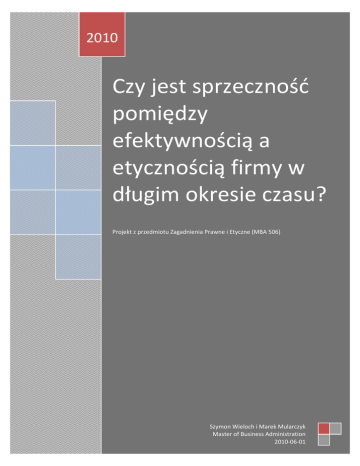 2010 Czy jest sprzecznośd pomiędzy efektywnością a etycznością firmy w długim okresie czasu? Projekt z przedmiotu Zagadnienia Prawne i Etyczne (MBA 506) Szymon Wieloch i Marek Mularczyk Master of Business Administration 2010-06-01 Spis treści Konflikt interesów pomiędzy firmą a klientem ....................................................................................... 3 Przykłady nieetycznych zachowao .......................................................................................................... 3 Uliczni sprzedawcy perfum.................................................................................................................. 3 Mechanicy samochodowi .................................................................................................................... 5 Sprzedawcy lodów w objazdowych cyrkach ....................................................................................... 6 Poczta Polska ....................................................................................................................................... 7 Przykłady etycznych zachowao ............................................................................................................... 8 Fakro .................................................................................................................................................... 8 Artur Andersen .................................................................................................................................... 9 Podsumowanie .................................................................................................................................. 10 Szymon Wieloch i Marek Mularczyk – „Czy istnieje sprzecznośd pomiędzy efektywnością a etycznością firmy w długim okresie czasu?” 2 Konflikt interesów pomiędzy firmą a klientem Firma oraz jej klient mogą byd traktowani jako dwa podmioty dążące do swoich egoistycznych celów. Celem firmy jest zdobycie pieniędzy poprzez sprzedanie klientowi produktu lub usługi. Klient stara się zaspokoid jakąś swoją potrzebę przy pomocy zakupionego produktu lub usługi. Oczywiście firma najchętniej uzyskałaby jak największą ilośd pieniędzy przy jak najmniejszych kosztach. Klient odwrotnie – chciałby uzyskad produkt lub usługę o najwyższej jakości, ale jednocześnie chciałby zapłacid za nią jak najmniej. Obie strony dążąc do swoich celów mogą albo zachowywad się etycznie, albo spróbowad naciągnąd drugą stronę licząc na uzyskanie większej ilości dóbr lub poniesienie mniejszych kosztów. Celem tej pracy jest analiza zachowania kilku rzeczywistych firm, które prowadząc swój biznes zachowują się albo etycznie, albo nieetycznie, a następnie ustalenie, czy w długim okresie zachowanie etyczne jest bardziej opłacalne od zachowania nieetycznego. Przykłady nieetycznych zachowań Nieetyczne zachowania można podzielid na dwie główne kategorie: Zachowania zgodne z prawem. Każdy system prawny posiada wiele luk, które można wykorzystad i osiągnąd przewagę nad drugą stroną. Przykładem może byd celowe tworzenie skomplikowanych systemów prawnych (regulaminy usług), które dla przeciętnego klienta mogą byd zbyt złożone, aby był w stanie wszystko zrozumied. Dlatego nie będzie w pełni świadomy, co tak naprawdę podpisuje. Inny przykład to firmy wysyłkowe informujące klientów, że wygrały główną nagrodę w zorganizowanym w firmie konkursie i że wystarczy, że zakupią tylko dowolny produkt z dołączonego katalogu, a otrzymają wygraną. Załączony do listu regulamin definiował główną nagrodę jako sumę dzieloną po równo pomiędzy wszystkich „zwycięzców” w prowadzonym konkursie. Dla ukrycia przed klientami tej informacji regulamin drukowany był na wewnętrznej stronie koperty. Proceder taki nie był zabroniony prawnie. Zachowania niezgodne z prawem. Zachowanie niezgodne z prawem może nie zostad wykryte, a nawet jeśli zostanie, to drugiej stronie często nie opłaca się procesowad o drobne sumy. Przykładem takiego zachowania może byd dolewanie do benzyny na stacjach paliw taoszych substancji, a następnie sprzedawanie mieszanki jako pełnowartościową benzynę. Uliczni sprzedawcy perfum Kilka lat temu w Nowym Sączu na ul. Jagiellooskiej pojawili się sprzedawcy perfum. Sprzedawcy wykorzystywali fakt, że osobie na ulicy trudno jest oszacowad rzeczywistą wartośd ich produktów, dlatego perfumy były przedstawiane jako markowe i bardzo ekskluzywne, mimo że w rzeczywistości były to zwykłe, tanie perfumy. Sprzedawcy mieli ustalony pewien schemat rozmowy stworzony prawdopodobnie przez specjalistę od perswazji. Schemat ten w dużej mierze opierał się na wykorzystywaniu praw perswazji zdefiniowanych przez amerykaoskiego profesora psychologii Roberta Cialdiniego. Niektóre techniki stosowane przez sprzedawców to: Szymon Wieloch i Marek Mularczyk – „Czy istnieje sprzecznośd pomiędzy efektywnością a etycznością firmy w długim okresie czasu?” 3 Pytanie klientów, czy widzieli w telewizji reklamę sprzedawanych perfum z udziałem Krzysztofa Ibisza. W rzeczywistości reklamy takie nigdy nie były emitowane. Przedstawianie się jako przedstawiciela akcji realizowanej przez telewizję Polsat, co w rzeczywistości nie miało miejsca. Wkładanie perfum w ręce klientów – wykorzystanie reguły konsekwencji. Proponowanie klientom gry – pytania o to, jak długo istnieje już telewizja Polsat – 5 czy 10 lat. W rzeczywistości każda odpowiedź przedstawiana była jako poprawna, a klient otrzymywał do ręki „wygraną” w postaci kolejnej buteleczki z perfumami, za którą później kazano mu zapłacid. Jest to przykład zachowania niezgodnego z prawem (przedstawianie fałszywych informacji), ale mimo to firma nigdy nie poniosła prawnych konsekwencji swoich oszustw. Początkowo efektywnośd była bardzo wysoka, co można było bardzo łat