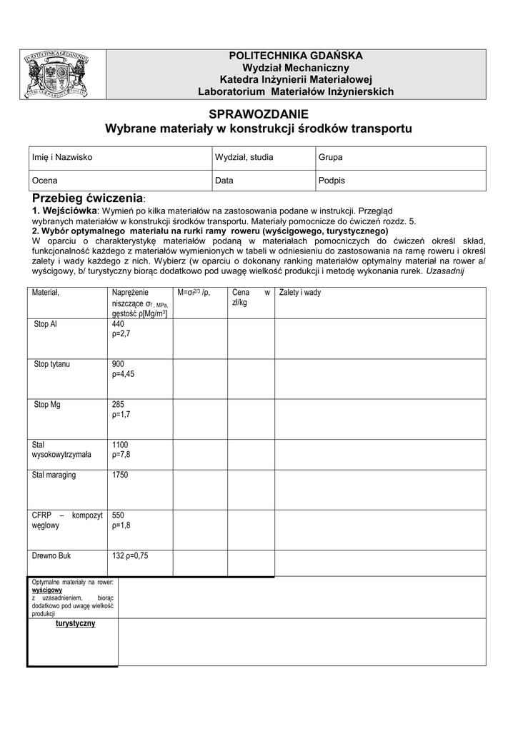 Wybrane materiały konstrukcyjne - wzór sprawozdania