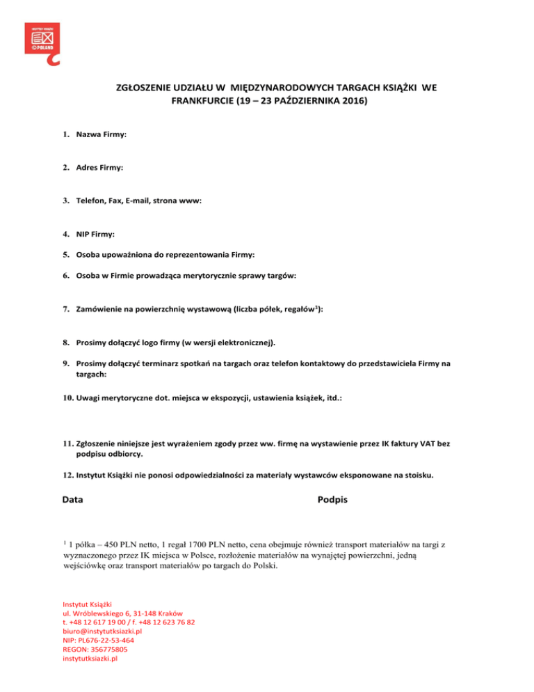 ZGŁOSZENIE UDZIAŁU W MIĘDZYNARODOWYCH TARGACH KSIĄŻKI WE FRANKFURCIE (19 – 23 PAŹDZIERNIKA 2016) 1. Nazwa Firmy: 2. Adres Firmy: 3. Telefon, Fax, E-mail, strona www: 4. NIP Firmy: 5. Osoba upoważniona do reprezentowania Firmy: 6. Osoba w Firmie prowadząca merytorycznie sprawy targów: 7. Zamówienie na powierzchnię wystawową (liczba półek, regałów 1): 8. Prosimy dołączyć logo firmy (w wersji elektronicznej). 9. Prosimy dołączyć terminarz spotkań na targach oraz telefon kontaktowy do przedstawiciela Firmy na targach: 10. Uwagi merytoryczne dot. miejsca w ekspozycji, ustawienia książek, itd.: 11. Zgłoszenie niniejsze jest wyrażeniem zgody przez ww. firmę na wystawienie przez IK faktury VAT bez podpisu odbiorcy. 12. Instytut Książki nie ponosi odpowiedzialności za materiały wystawców eksponowane na stoisku. Data Podpis 1 półka – 450 PLN netto, 1 regał 1700 PLN netto, cena obejmuje również transport materiałów na targi z wyznaczonego przez IK miejsca w Polsce, rozłożenie materiałów na wynajętej powierzchni, jedną wejściówkę oraz transport materiałów po targach do Polski. 1 Instytut Książki ul. Wróblewskiego 6, 31-148 Kraków t. +48 12 617 19 00 / f. +48 12 623 76 82 [email protected] NIP: PL676-22-53-464 REGON: 356775805 instytutksiazki.pl