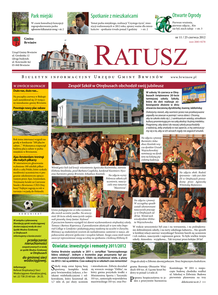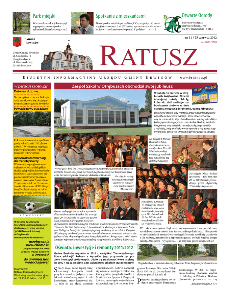 Park miejski Spotkanie z mieszkańcami Otwarte Ogrody W czasie konsultacji koncepcji zagospodarowania parku zgłoszono kilkanaście uwag > str. 2 Temat parku miejskiego, realizacji "Czystego życia", inwestycji realizowanych w 2012 roku, sprawy ważne dla mieszkańców - spotkanie trwało ponad 3 godziny > str. 2 Pierwsze wrażenia, pierwsze zdjęcia... Kto nie był, niech żałuje > str. 3 nr 11 / 25 czerwca 2012 RAtusz Gmina Brwinów Urząd Gminy Brwinów ul. Grodziska 12 (drugi budynek: ul. Kościuszki 4a) 05-840 Brwinów Biuletyn informacyjny Urzędu Gminy Brwinów issn 2083-9278 w w w. br w i now. pl Zespół Szkół w Otrębusach obchodził swój jubileusz w dwóch Słowach Dużo nas, dużo nas... W sobotę 16 czerwca w Otrębusach świętowano 20-lecie tamtejszej szkoły. Szkoły, która do dziś realizuje zobowiązanie złożone w dniu otwarcia ówczesną dyrektorkę Joannę Jabłońską: Na początku czerwca w Biskupicach zameldował się 23-tysięczny mieszkaniec gminy Brwinów. Powstaje nowy plac zabaw Dołożymy starań, aby wartości przez nas przekazywane zapadły na zawsze w pamięć i serca dzieci. Chcemy, aby ta szkoła stała się (...) sanktuarium wiedzy, ośrodkiem kultury promieniującym na całą okolicę i kuźnią intelektu. Pragniemy, aby dzieci do naszej szkoły przychodziły z radością, żeby znalazły w nas oparcie, a my zatroszczymy się o to, aby w ich sercach nigdy nie zagościł smutek. Na zdjęciu z prawej: Burmistrz Arkadiusz Kosiński wręcza dyrektor Urszuli Wojciechowskiej nominację na dyrektora na kolejną pięcioletną kadencję. Rok temu internauci wygrali nagrodę w konkursie "100 placów zabaw...". Wykonawca rozpoczął budowę placu zabaw w parku miejskim w Brwinowie. Ajax Amsterdam: treningi dla małych piłkarzy k o m u n i k a t W związku z planowaną likwidacją spinki wodociągowej dostarczającej wodę do sieci Spółki Wodno-Ściekowej w Otrębusach informujemy o konieczności przełączania nieruchomości zaopatrywanych w wodę ze spółki Wodno-Ściekowej w Otrębusach do gminnej sieci wodociągowej. Informacje: Referat Eksploatacji Sieci Wodociągowo-Kanalizacyjnej, tel. 22 738 25 60 lub - 26 25. Wśród gości byli (od lewej): wicestarosta Agnieszka Kuźmińska, starosta Elżbieta Smolińska, poseł Barbara Czaplicka, kardynał Kazimierz Nycz oraz burmistrz gminy Brwinów Arkadiusz Kosiński. Na zdjęciu wyżej: Poloneza odtańczyli uczniowie, nauczyciele oraz tancerze "Mazowsza". Na zdjęciu obok: Radość śpiewania – taki jest chór ZS w Otrębusach prowadzony przez Agnieszkę Witomską-Rejnowicz. Grono pedagogiczne co roku wystawia dla swoich uczniów jasełka. Na uroczystość 20-lecia szkoły nauczyciele zaśpiewali piosenkę Anny Jantar. Stylowo! Z poczuciem humoru wystąpili też dawni wychowankowie otrębuskiej szkoły, Tomasz i Bartosz Koprowscy. Z powodzeniem ukończyli w tym roku Imperial College w Londynie i podejmują pracę naukową na uczelni w Zurychu. Bliźniacy są znakomitym wzorem do naśladowania: sumienni w nauce, ale jednocześnie aktywni społecznie i wszędzie lubiani. Swego czasu mieli nawet zaszczyt reprezentować swoją uczelnię na spotkaniu z królową Elżbietą II. Na zdjęciu z prawej: W szczególny sposób zostali uhonorowani nauczyciele pracujący w Otrębusach od 20 lat. Wśród nich wicedyrektor Elżbieta Wojciechowska. Fot. PR W internetowym głosowaniu wyłoniono 100 szkółek piłkarskich z całej Polski, które zyskały możliwości uczestnictwa w programie szkoleniowym opracowanym przez Ajax Amsterdam. Trzymamy kciuki za Czerwone Smoki z Brwinowa i UKS Otrębusy! Najlepsi zagrają za rok w turnieju i wyjadą do Holandii. W trakcie uroczystości był czas i na wzruszenia, i na podziękowanie dobrodziejom szkoły, i na żarty szkolnego kabaretu... Nie sposób w krótkiej relacji zawrzeć wszystkiego! Świetnie bawili się uczniowie i ich rodzice, nauczyciele i zaproszeni goście. To było wielkie święto szkoły. Atmosfera - wyjątkowa... Tak trzymać przez kolejne 20 lat! Oświata: inwestycje i remonty 2011/2012 Gmina Brwinów uzyskała w 2011 r. certyfikat "Samorządowego lidera edukacji". Jednym z kryteriów jego przyznania był poziom inwestycji oświatowych. Udało się zrealizować wiele, a plany na 2012 r. też są ambitne. Czas wakacji to w szkołach czas remontów! S zkoły mają coraz lepszą bazę sportową: kompleks boisk przy brwinowskiej Jedynce, z boiskami wielofunkcyjnymi i rolkowiskiem, który kosztował ok. 1,7 mln zł, już służy uczniom i mieszkańcom. Żółwin doczekał się wreszcie swojego "Orlika", na który gmina pozyskała środki z Ministerstwa Sportu i Turystyki 333 tys., samorządu województwa mazowieckiego 333 tys. oraz Pro- Droga do szkoły w Żółwinie: dawniej poboczem. Teraz: bezpiecznym chodnikiem. gramu Rozwoju Obszarów Wiejskich 450 tys. zł. Łączny koszt budowy to ponad 1,4 mln zł. P oprawa bezpieczeństwa to jeden z priorytetów burmistrza Kosińskiego. W 2011 r. rozpocząto budowę chodnika wzdłuż ul. Szkolnej w Żółwinie. Budowa pierwotnie planowana na trzy dokończenie na str. 2 >>> 2 ratusz Biuletyn informacyjny Urzędu Gminy Brwinów nr 11 25 czerwca 2012 „ W „ czasie sesji 26 czerwca radni będą podejmować uchwałę w sprawie mojego sprawozdania oraz absolutorium za rok 2011. Myślę, że to był bardzo dobry rok, a największym sukcesem było rozwiązanie problemu zalewania tunelu w Brwinowie. - Arkadiusz Kosiński, burmistrz gminy Brwinów Park miejski: opinie mieszkańców w dwóch Słowach Fot. www.gopzr.pl Świetlice GOPzR działają... i będą działać! Opadły emocje związane z rzekomą likwidacją świetlic Gminnego Ośrodka Pracy z Rodziną. Po włączeniu ich w struktury Środowiskowego Ośrodka Pomocy Społecznej jako Dział Wspierania Rodziny działają pod kierownictwem Agnieszki Olejniczak. Działają świetnie! Dzieci prezentowały w czerwcu przedstawienia „Złota kaczka” oraz „Mamo, tato usłysz mnie