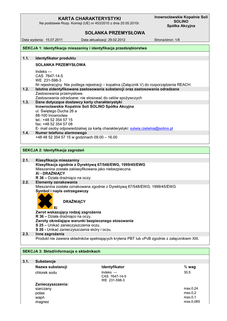 KARTA CHARAKTERYSTYKI Na podstawie Rozp. Komisji (UE) nr 453/2010 z dnia 20.05.2010r. Inowrocławskie Kopalnie Soli SOLINO Spółka Akcyjna SOLANKA PRZEMYSŁOWA Data wydania: 15.07.2011 Data aktualizacji: 29.02.2012 Strona/stron: 1/8 SEKCJA 1: Identyfikacja mieszaniny i identyfikacja przedsiębiorstwa 1.1. Identyfikator produktu SOLANKA PRZEMYSŁOWA 1.2. 1.3. 1.4. Indeks --CAS 7647-14-5 WE 231-598-3 Nr rejestracyjny Nie podlega rejestracji – kopalina (Załącznik V) do rozporządzenia REACH. Istotne zidentyfikowane zastosowania substancji oraz zastosowania odradzane Zastosowania przemysłowe. Zastosowania odradzane: nie stosować do celów spożywczych Dane dotyczące dostawcy karty charakterystyki Inowrocławskie Kopalnie Soli SOLINO Spółka Akcyjna ul. Świętego Ducha 26 a 88-100 Inowrocław tel.: +48 52 354 57 15 fax: +48 52 354 57 08 E- mail osoby odpowiedzialnej za kartę charakterystyki: [email protected] Numer telefonu alarmowego +48 48 52 354 57 15 w godzinach 09.00 – 16.00 SEKCJA 2: Identyfikacja zagrożeń 2.1. 2.2. Klasyfikacja mieszaniny Klasyfikacja zgodnie z Dyrektywą 67/548/EWG, 1999/45/EWG Mieszanina została zaklasyfikowana jako niebezpieczna. Xi - DRAŻNIĄCY R 36 – Działa drażniąco na oczy. Elementy oznakowania Mieszanina została oznakowana zgodnie z Dyrektywą 67/548/EWG; 1999/45/EWG Symbol i napis ostrzegawczy DRAŻNIĄCY 2.3. Xi Zwrot wskazujący rodzaj zagrożenia R 36 – Działa drażniąco na oczy. Zwroty określające warunki bezpiecznego stosowania S 25 – Unikać zanieczyszczenia oczu. S 26 - Unikać zanieczyszczenia skóry i oczu. Inne zagrożenia Produkt nie zawiera składników spełniających kryteria PBT lub vPvB zgodnie z załącznikiem XIII. SEKCJA 3: Skład/informacja o składnikach 3.1. Substancje Nazwa substancji chlorek sodu Zanieczyszczenia: siarczany potas wapń magnez Identyfikator % wag Indeks --CAS 7647-14-5 WE 231-598-3 30,5 max.0,24 max.0,2 max.0,1 max.0,065 KARTA CHARAKTERYSTYKI Na podstawie Rozp. Komisji (UE) nr 453/2010 z dnia 20.05.2010r. Inowrocławskie Kopalnie Soli SOLINO Spółka Akcyjna SOLANKA PRZEMYSŁOWA Data wydania: 15.07.2011 Data aktualizacji: 29.02.2012 Substancje nierozpuszczalne woda Wzór chemiczny: Wzór strukturalny: Strona/stron: 2/8 max.0,003 do 100 NaCl SEKCJA 4: Środki pierwszej pomocy 4.1. 4.2. 4.3. Opis środków pierwszej pomocy Drogi narażenia: drogi oddechowe, drogi pokarmowe, kontakt ze skórą, kontakt z oczami. Następstwa wdychania: • Wyprowadzić poszkodowana osobę na świeże powietrze. Ułożyć w wygodnej pozycji. Zapewnić ciepło i spokój. • Utrzymywać drożność dróg oddechowych. • W razie potrzeby wezwać pomoc lekarską. Następstwa połknięcia: • Przepłukać usta. Podać do wypicia dużą ilość wody. Nie wywoływać wymiotów. Zapewnić spokój, leżenie i ciepło. • W razie potrzeby zapewnić pomoc lekarską. Kontakt z oczami: • Przemyć zanieczyszczone oczy większą ilością letniej wody przez 15 - 20 minut, przy wywiniętych powiekach (usunąć przedtem szkła kontaktowe). • W przypadku konieczności zapewnić konsultację lekarza – okulisty.. Kontakt ze skórą: • Zdjąć zanieczyszczone ubranie. Oczyścić zanieczyszczoną skórę, przemyć wodą a następnie wodą z łagodnym mydłem. • Zasięgnąć porady dermatologa gdy wystąpi podrażnienie skóry. Najważniejsze ostre i opóźnione objawy oraz skutki narażenia Powoduje podrażnienie oczu i lekkie podrażnienie skóry. Połknięcie może spowodować podrażnienie błon śluzowych przewodu pokarmowego i żołądka, ból brzucha, mdłości, wymioty, biegunkę, Wskazania dotyczące wszelkiej natychmiastowej pomocy lekarskiej i szczególnego postępowania z poszkodowanym W miejscu pracy powinny być dostępne środki umożliwiające pierwszą pomoc przedlekarską. SEKCJA 5: Postępowanie w przypadku pożaru 5.1. 5.2. 5.3. Środki gaśnicze Odpowiednie środki gaśnicze do gaszenia pożarów w sąsiedztwie: rozproszona woda, ditlenek węgla CO2, proszki gaśnicze, piana gaśnicza. Niewłaściwe środki gaśnicze: Nie stosować zwartych strumieni wody na palącą się powierzchnię. Szczególne zagrożenia związane z substancją Specyficzne zagrożenia podczas pożaru. Roztwór wodny. Nie pali się. Zagrożenia wybuchowe: Nie występuje. Informacje dla straży pożarnej Stosować standardowe metody gaszenia pożarów chemicznych. Pojemniki narażone na działanie wysokiej temperatury chłodzić wodą i w miarę możliwości usunąć z zagrożonego obszaru. Sprzęt ochronny strażaków: Ubrania odporne na działanie wysokich temperatur. Niezależne aparaty izolujące drogi oddechowe. KARTA CHARAKTERYSTYKI Na podstawie Rozp. Komisji (UE) nr 453/2010 z dnia 20.05.2010r. Inowrocławskie Kopalnie Soli SOLINO Spółka Akcyjna SOLANKA PRZEMYSŁOWA Data wydania: 15.07.2011 Data aktualizacji: 29.02.2012 Strona/stron: 3/8 SEKCJA 6: Postępowanie w przypadku niezamierzonego uwolnienia do środowiska 6.1. 6.2. 6.3. 6.4. Indywidualne środki ostrożności, wyposażenie ochronne i procedury w sytuacjach awaryjnych Zapewnić właściwą wentylację. W warunkach produkcyjnych zakładać odzież ochronną z materiałów naturalnych (bawełna) lub włókien syntetycznych, rękawice wykonane z lateksu, neoprenu, nitrylu lub PCV. W warunkach przemysłowych stosować okulary ochronne typu gogle. Nie pić, nie jeść i nie palić w trakcie używania. Zapewnić odpowiednią wentylację ogólną i miejscową. Unikać bezpośredniego kontaktu z substancją. Unikać wdychania pyłu. Środki ostrożności w zakresie ochrony środowiska Nie dopuścić do zanieczyszczenia środowiska. Zabezpieczyć studzienki ściekowe. W przypadku poważnego zanieczyszczenia cieku wodnego, systemu kanalizacyjnego lub zanieczyszczenia gruntu, powiadomić odpowiednie władze administracyjne i kontrolne oraz organizacje ratownicze. Metody i materiały zapobiegające rozprzestrzenianiu się zanieczyszczenia i służące do usuwania zanieczyszc
