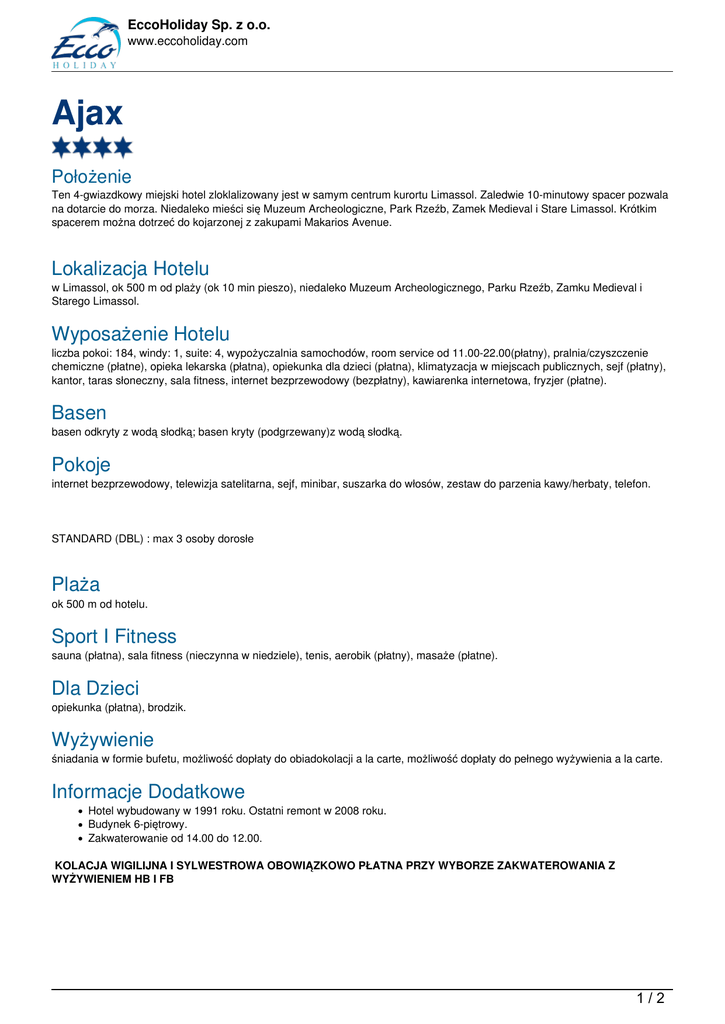 EccoHoliday Sp. z o.o. www.eccoholiday.com Ajax Położenie Ten 4-gwiazdkowy miejski hotel zloklalizowany jest w samym centrum kurortu Limassol. Zaledwie 10-minutowy spacer pozwala na dotarcie do morza. Niedaleko mieści się Muzeum Archeologiczne, Park Rzeźb, Zamek Medieval i Stare Limassol. Krótkim spacerem można dotrzeć do kojarzonej z zakupami Makarios Avenue. Lokalizacja Hotelu w Limassol, ok 500 m od plaży (ok 10 min pieszo), niedaleko Muzeum Archeologicznego, Parku Rzeźb, Zamku Medieval i Starego Limassol. Wyposażenie Hotelu liczba pokoi: 184, windy: 1, suite: 4, wypożyczalnia samochodów, room service od 11.00-22.00(płatny), pralnia/czyszczenie chemiczne (płatne), opieka lekarska (płatna), opiekunka dla dzieci (płatna), klimatyzacja w miejscach publicznych, sejf (płatny), kantor, taras słoneczny, sala fitness, internet bezprzewodowy (bezpłatny), kawiarenka internetowa, fryzjer (płatne). Basen basen odkryty z wodą słodką; basen kryty (podgrzewany)z wodą słodką. Pokoje internet bezprzewodowy, telewizja satelitarna, sejf, minibar, suszarka do włosów, zestaw do parzenia kawy/herbaty, telefon. STANDARD (DBL) : max 3 osoby dorosłe Plaża ok 500 m od hotelu. Sport I Fitness sauna (płatna), sala fitness (nieczynna w niedziele), tenis, aerobik (płatny), masaże (płatne). Dla Dzieci opiekunka (płatna), brodzik. Wyżywienie śniadania w formie bufetu, możliwość dopłaty do obiadokolacji a la carte, możliwość dopłaty do pełnego wyżywienia a la carte. Informacje Dodatkowe Hotel wybudowany w 1991 roku. Ostatni remont w 2008 roku. Budynek 6-piętrowy. Zakwaterowanie od 14.00 do 12.00. KOLACJA WIGILIJNA I SYLWESTROWA OBOWIĄZKOWO PŁATNA PRZY WYBORZE ZAKWATEROWANIA Z WYŻYWIENIEM HB I FB 1/2 EccoHoliday Sp. z o.o. www.eccoholiday.com Oferta: Wylot 01.01.1970 Powrót 01.01.1970 godz. godz. Zakwaterowanie -() Dni dni Cena os. dorosła 2/2 Powered by TCPDF (www.tcpdf.org)
