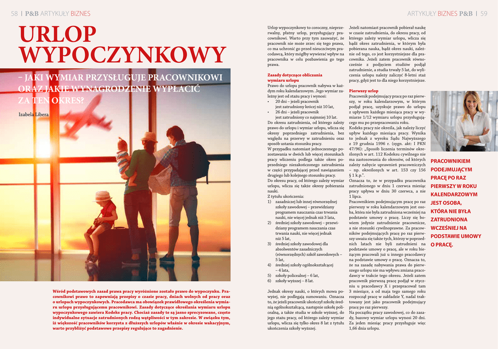 58 P&B ARTYKUŁY BIZNES URLOP WYPOCZYNKOWY – JAKI WYMIAR PRZYSŁUGUJE PRACOWNIKOWI ORAZ JAKIE WYNAGRODZENIE WYPŁACIĆ ZA TEN OKRES? Izabela Libera Wśród podstawowych zasad prawa pracy wyróżnione zostało prawo do wypoczynku. Pracownikowi prawo to zapewniają przepisy o czasie pracy, dniach wolnych od pracy oraz o urlopach wypoczynkowych. Pracodawca ma obowiązek prawidłowego określenia wymiaru urlopu przysługującemu pracownikowi. Zasady dotyczące określania wymiaru urlopu wypoczynkowego zawiera Kodeks pracy. Chociaż zasady te są jasno sprecyzowane, często indywidualne sytuacje zatrudnionych rodzą wątpliwości w tym zakresie. W związku tym, iż większość pracowników korzysta z dłuższych urlopów właśnie w okresie wakacyjnym, warto przybliżyć podstawowe przepisy regulujące to zagadnienie. ARTYKUŁY BIZNES P&B Urlop wypoczynkowy to coroczny, nieprzerwalny, płatny urlop, przysługujący pracownikowi. Warto przy tym zauważyć, że pracownik nie może zrzec się tego prawa, co ma uchronić go przed nieuczciwym pracodawcą, który mógłby wywierać wpływ na pracownika w celu pozbawienia go tego prawa. Zasady dotyczące obliczania wymiaru urlopu Prawo do urlopu pracownik nabywa w każdym roku kalendarzowym. Jego wymiar zależny jest od stażu pracy i wynosi: • 20 dni – jeżeli pracownik jest zatrudniony krócej niż 10 lat, • 26 dni – jeżeli pracownik jest zatrudniony co najmniej 10 lat. Do okresu zatrudnienia, od którego zależy prawo do urlopu i wymiar urlopu, wlicza się okresy poprzedniego zatrudnienia, bez względu na przerwy w zatrudnieniu oraz sposób ustania stosunku pracy. W przypadku natomiast jednoczesnego pozostawania w dwóch lub więcej stosunkach pracy wliczeniu podlega także okres poprzedniego niezakończonego zatrudnienia w części przypadającej przed nawiązaniem drugiego lub kolejnego stosunku pracy. Do okresu pracy, od którego zależy wymiar urlopu, wlicza się także okresy pobierania nauki. Z tytułu ukończenia: 1) zasadniczej lub innej równorzędnej szkoły zawodowej – przewidziany programem nauczania czas trwania nauki, nie więcej jednak niż 3 lata, 2) średniej szkoły zawodowej – przewidziany programem nauczania czas trwania nauki, nie więcej jednak niż 5 lat, 3) średniej szkoły zawodowej dla absolwentów zasadniczych (równorzędnych) szkół zawodowych – 5 lat, 4) średniej szkoły ogólnokształcącej – 4 lata, 5) szkoły policealnej – 6 lat, 6) szkoły wyższej – 8 lat. Jednak okresy nauki, o których mowa powyżej, nie podlegają sumowaniu. Oznacza to, że jeżeli pracownik ukończył szkołę średnią ogólnokształcącą, następnie szkołę policealną, a także studia w szkole wyższej, do jego stażu pracy, od którego zależy wymiar urlopu, wlicza się tylko okres 8 lat z tytułu ukończenia szkoły wyższej. 59 Jeżeli natomiast pracownik pobierał naukę w czasie zatrudnienia, do okresu pracy, od którego zależy wymiar urlopu, wlicza się bądź okres zatrudnienia, w którym była pobierana nauka, bądź okres nauki, zależnie od tego, co jest korzystniejsze dla pracownika. Jeżeli zatem pracownik równocześnie z podjęciem studiów podjął zatrudnienie, a studia trwały 5 lat, do wyliczenia urlopu należy zaliczyć 8-letni staż pracy, gdyż jest to dla niego korzystniejsze. Pierwszy urlop Pracownik podejmujący pracę po raz pierwszy, w roku kalendarzowym, w którym podjął pracę, uzyskuje prawo do urlopu z upływem każdego miesiąca pracy w wymiarze 1/12 wymiaru urlopu przysługującego mu po przepracowaniu roku. Kodeks pracy nie określa, jak należy liczyć upływ każdego miesiąca pracy. Wynika to jednak z wyroku Sądu Najwyższego z 19 grudnia 1996 r. (sygn. akt: I PKN 47/96): „Sposób liczenia terminów określonych w art. 112 Kodeksu cywilnego nie ma zastosowania do okresów, od których zależy nabycie uprawnień pracowniczych – np. określonych w art. 153 czy 156 § 1 k.p.”. Oznacza to, że w przypadku pracownika zatrudnionego w dniu 1 czerwca miesiąc pracy upływa w dniu 30 czerwca, a nie 1 lipca. Pracownikiem podejmującym pracę po raz pierwszy w roku kalendarzowym jest osoba, która nie była zatrudniona wcześniej na podstawie umowy o pracę. Liczy się bowiem jedynie zatrudnienie pracownicze, a nie stosunki cywilnoprawne. Za pracowników podejmujących pracę po raz pierwszy uważa się także tych, którzy w poprzednich latach nie byli zatrudnieni na podstawie umowy o pracę, ale w roku bieżącym pracowali już u innego pracodawcy na podstawie umowy o pracę. Oznacza to, że na zasadę nabywania prawa do pierwszego urlopu nie ma wpływu zmiana pracodawcy w trakcie tego okresu. Jeżeli zatem pracownik pierwszą pracę podjął w styczniu u pracodawcy X i przepracował tam 3 miesiące, a od maja tego samego roku rozpoczął pracę w zakładzie Y, nadal traktowany jest jako pracownik podejmujący pracę po raz pierwszy. Na początku pracy zawodowej, co do zasady, bazowy wymiar urlopu wynosi 20 dni. Za jeden miesiąc pracy przysługuje więc 1,66 dnia urlopu. PRACOWNIKIEM PODEJMUJĄCYM PRACĘ PO RAZ PIERWSZY W ROKU KALENDARZOWYM JEST OSOBA, KTÓRA NIE BYŁA ZATRUDNIONA WCZEŚNIEJ NA PODSTAWIE UMOWY O PRACĘ. 60 P&B ARTYKUŁY BIZNES ZGODNIE Z ART. 172 KODEKSU PRACY ZA CZAS URLOPU PRACOWNIKOWI PRZYSŁUGUJE WYNAGRODZENIE, JAKIE BY OTRZYMAŁ, GDYBY W TYM CZASIE PRACOWAŁ. Co z pracownikami zatrudnionymi w niepełnym wymiarze czasu pracy? Wymiar urlopu dla pracownika zatrudnionego w niepełnym wymiarze czasu pracy ustala się proporcjonalnie do wymiaru czasu pracy tego pracownika, biorąc za podstawę wymiar urlopu przysługujący mu ze względu na staż pracy, tj. w wymiarze 20 lub 26 dni. W wypadku takich pracowników niepełny dzień urlopu zaokrągla się w górę do pełnego dnia. Jeżeli zatem pracodawca zatrudnia pracownika z 6-letnim stażem pracy na 1/4 etatu i nie jest to jego pierwsza praca, pracownik ten ma prawo do urlopu w wymiarze 5 dni, co otrzymujem