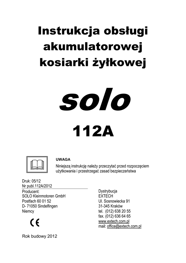Instrukcja obsługi akumulatorowej kosiarki żyłkowej solo 112A UWAGA Niniejszą instrukcję należy przeczytać przed rozpoczęciem użytkowania i przestrzegać zasad bezpieczeństwa Druk: 05/12 Nr publ.112A/2012 Producent: SOLO Kleinmotoren GmbH Postfach 60 01 52 D- 71050 Sindelfingen Niemcy Rok budowy 2012 Dystrybucja EXTECH Ul. Sosnowiecka 91 31-345 Kraków tel. (012) 638 20 55 fax. (012) 636 64 65 www.extech.com.pl mail: [email protected] 2 3 Symbole Na urządzeniu lub w tekście niniejszej instrukcji są zamieszczone następujące symbole: 1. Należy zwrócić szczególną uwagę 2. Przeczytać instrukcję obsługi przed pierwszym uruchomieniem, czynnościami obsługowymi i czyszczeniem 3. Podczas pracy używać ochronnego nakrycia głowy, okularów ochronnych oraz ochronników słuchu 4. W promieniu 15 m od miejsca pracy nie mogą znajdować się osoby postronne 5. Po uruchomieniu – wirujący element tnący – nie zbliżać się do obszaru pracy 6. Nigdy nie używać urządzenia w wilgotnych warunkach atmosferycznych 7. Zużyte akumulatory powinny zostać oddane do recyklingu 8. Bateria zawiera lit. Zużytych baterii nie wolno wyrzucać do pojemników na śmieci. 9. Elementy elektryczne nie mogą być traktowane jak normalne odpady. Należy zapewnić utylizacją całego urządzenia lub elementów elektrycznych w przeznaczonym do tego punkcie Deklaracja Zgodności Deklaracja zgodności CE jest umieszczona w opakowaniu na oddzielnym formularzu Numer seryjny oraz rok produkcji znajdują się na tabliczce znamionowej umieszczonej na urządzeniu 4 Spis treści Dane techniczne Wstęp 1. Ogólne wskazówki dotyczące bezpieczeństwa 2. Przeznaczenie urządzenia 3. Ogólne zasady bezpieczeństwa 3.1 Zalecenia dotyczące obsługi i konserwacji urządzenia 3.2 Zalecenia dotyczące pracy akumulatorową kosiarką żyłkową 3.3 Ważne informacje dotyczące ochrony gwarancyjnej urządzenia 4. Obsługa urządzeń zasilanych akumulatorem 5. Zalecenia dotyczące akumulatora 6. Ładowanie akumulatora 7. Montaż osłony układu tnącego 8. Przygotowanie urządzenia do pracy 9. Regulacja długości wysięgnika i ustawienia układu tnącego 10. Cięcie trawy 11. Regulacja długości żyłki 12. Wymiana żyłki tnącej 13. Typowe problemy związane z eksploatacją kosy 14. Czyszczenie i przechowywanie urządzenia 15. Utylizacja urządzenia i ochrona środowiska 16. Warunki gwarancji 6 6 6 7 7 8 8 9 9 9 10 10 10 10 11 11 11 11 12 12 15 Dane techniczne Model 112A Napięcie pracy 24 V DC 10.000 min -1 Prędkość obrotowa żyłki Średnica pracy żyłki Ø 22 cm Grubość żyłki tnącej 1,4 mm Bateria Li-lon-24V/1,5Ah Maksymalny czas pracy do pełnego rozładowania baterii Około 30 – 40 minut Waga bez baterii 2,2 kg Wartość ciśnienia akustycznego LPA 77 dB(A) Ważona efektywna wartość drgań <2,5 m/s 2 K3,0dB K 1,5 m/ s2 Dane techniczne ładowarki Napięcie zasilania 230 V ~ / 50 Hz Czas ładowania baterii Około 3,5 – 4 godzin Napięcie ładowania 25,2 V DC Prąd ładowania 500 mA Wyposażenie dodatkowe Dodatkowy akumulator – nr 0084175 Szybka ładowarka – nr 0084170 Czas ładowania akumulatora szybką ładowarką 5 1,5 godziny Gratulujemy Państwa zakupu akumulatorowej kosiarki żyłkowej firmy SOLO. Konstruktorzy firmy SOLO, bazując na najnowocześniejszych technologiach, opracowali urządzenie charakteryzujące się łatwą obsługą, bezproblemową i długą eksploatacją. Aby zapewnić jak najdłuższe, użytkowanie kosy radzimy uważnie zapoznać się z treścią niniejszej instrukcji przed pierwszym uruchomieniem urządzenia. Mając na względzie bezpieczeństwo i zdrowie użytkownika zalecamy ściśle przestrzegać podanych zasad bezpieczeństwa. W razie jakichkolwiek wątpliwości i pytań prosimy zwrócić się do autoryzowanego dealera firmy SOLO Wstęp do Instrukcji obsługi Instrukcja obsługi powinna być traktowana jak część urządzenie. Należy ją zawsze dołączać do urządzenia nawet jeśli kosiarka zostanie odsprzedana osobie trzeciej. Niniejszą instrukcję obsługi należy uważnie przeczytać przed pierwszym uruchomieniem urządzenia, zapoznać się z zawartymi w niej wskazówkami dotyczącymi prawidłowej eksploatacji urządzenia i zasadami bezpieczeństwa, oraz następnie zachować do wglądu w bezpiecznym miejscu. Prosimy ściśle trzymać się wszystkich wskazówek, objaśnień i przepisów. Przestrzeganie niniejszej instrukcji obsługi jest podstawowym warunkiem prawidłowego i bezpiecznego użytkowania tego urządzenia. Urządzenie należy użytkować ze szczególną ostrożnością , przestrzegając następujących zasad bezpieczeństwa. Nieprzestrzeganie zasad bezpieczeństwa może być powodem powstania ryzyka poważnych zranień operatora oraz powikłań zdrowotnych. Instrukcja obsługi powinna być zawsze dostępna w trakcie użytkowania urządzenia. Jakiekolwiek użytkowanie kosiarki w sposób nie wymieniony w niniejszej instrukcji oraz instrukcji obsługi silnika jest surowo zabronione. Dodatkowo podczas pracy należy stosować się do lokalnych przepisów regulujących użytkowanie urządzeń mechanicznych 1. Ogólne wskazówki dotyczące bezpieczeństwa Urządzenie odpowiada wymogom odpowiednich Dyrektyw dotyczących emisji hałasu. Jednak wartość ciśnienia akustycznego w miejscu pracy jest bliska wartości 80 dB(A). W związku z tym zalecamy stosowanie ochronników słuchu UWAGA. Należy stosować się do lokalnych przepisów dotyczących emisji hałasu. Podczas użytkowania urządzeń elektrycznych należy stosować się do podanych zasad bezpieczeństwa. Niestosowanie się do nich może spowodować porażenie prądem, zranienie i być powodem powstania pożaru Pomimo, że urządzenie jest wyprodukowane przy użyciu nowoczesnej technologii i zgodnie z obowiązującymi Dyrektywami, nie można jednak wyeliminować ryzyka szczątkowego związanego z użytkowaniem urządzenia. Należy pamiętać, że obsługujący urządzenie odpowiada za be