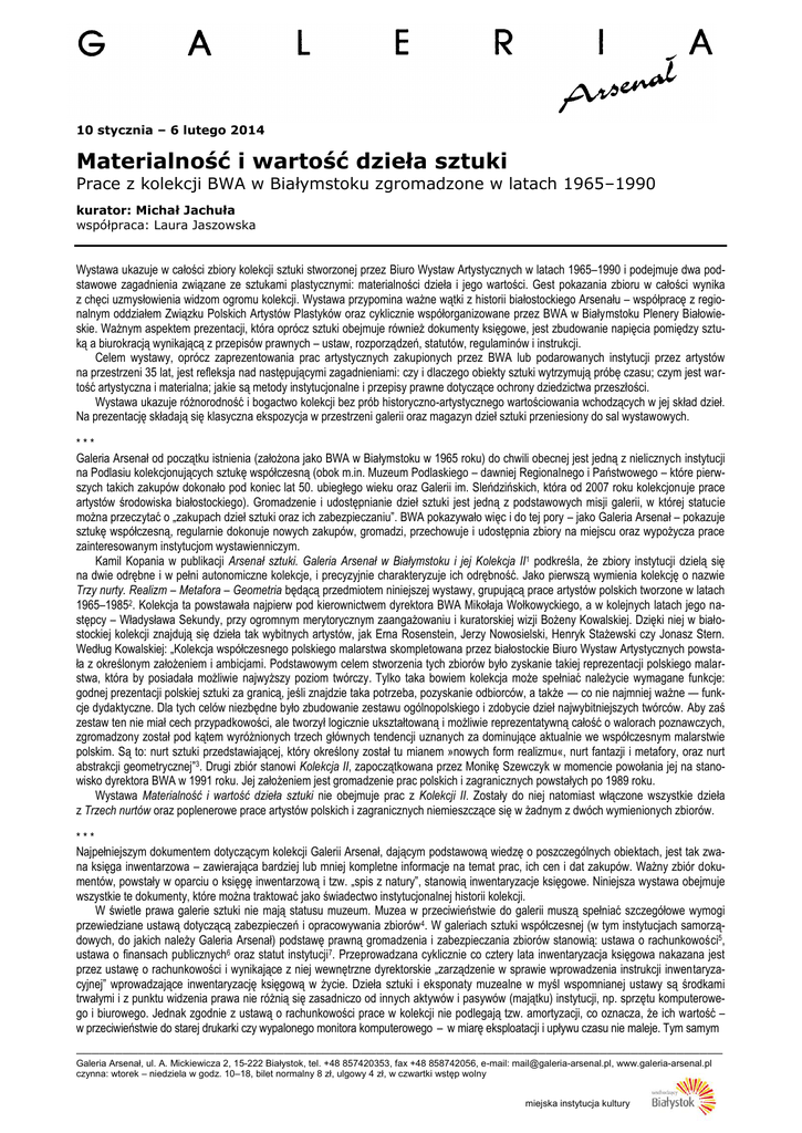 10 stycznia – 6 lutego 2014 Materialność i wartość dzieła sztuki Prace z kolekcji BWA w Białymstoku zgromadzone w latach 1965–1990 kurator: Michał Jachuła współpraca: Laura Jaszowska Wystawa ukazuje w całości zbiory kolekcji sztuki stworzonej przez Biuro Wystaw Artystycznych w latach 1965–1990 i podejmuje dwa podstawowe zagadnienia związane ze sztukami plastycznymi: materialności dzieła i jego wartości. Gest pokazania zbioru w całości wynika z chęci uzmysłowienia widzom ogromu kolekcji. Wystawa przypomina ważne wątki z historii białostockiego Arsenału – współpracę z regionalnym oddziałem Związku Polskich Artystów Plastyków oraz cyklicznie współorganizowane przez BWA w Białymstoku Plenery Białowieskie. Ważnym aspektem prezentacji, która oprócz sztuki obejmuje również dokumenty księgowe, jest zbudowanie napięcia pomiędzy sztuką a biurokracją wynikającą z przepisów prawnych – ustaw, rozporządzeń, statutów, regulaminów i instrukcji. Celem wystawy, oprócz zaprezentowania prac artystycznych zakupionych przez BWA lub podarowanych instytucji przez artystów na przestrzeni 35 lat, jest refleksja nad następującymi zagadnieniami: czy i dlaczego obiekty sztuki wytrzymują próbę czasu; czym jest wartość artystyczna i materialna; jakie są metody instytucjonalne i przepisy prawne dotyczące ochrony dziedzictwa przeszłości. Wystawa ukazuje różnorodność i bogactwo kolekcji bez prób historyczno-artystycznego wartościowania wchodzących w jej skład dzieł. Na prezentację składają się klasyczna ekspozycja w przestrzeni galerii oraz magazyn dzieł sztuki przeniesiony do sal wystawowych. *** Galeria Arsenał od początku istnienia (założona jako BWA w Białymstoku w 1965 roku) do chwili obecnej jest jedną z nielicznych instytucji na Podlasiu kolekcjonujących sztukę współczesną (obok m.in. Muzeum Podlaskiego – dawniej Regionalnego i Państwowego – które pierwszych takich zakupów dokonało pod koniec lat 50. ubiegłego wieku oraz Galerii im. Sleńdzińskich, która od 2007 roku kolekcjonuje prace artystów środowiska białostockiego). Gromadzenie i udostępnianie dzieł sztuki jest jedną z podstawowych misji galerii, w której statucie można przeczytać o „zakupach dzieł sztuki oraz ich zabezpieczaniu”. BWA pokazywało więc i do tej pory – jako Galeria Arsenał – pokazuje sztukę współczesną, regularnie dokonuje nowych zakupów, gromadzi, przechowuje i udostępnia zbiory na miejscu oraz wypożycza prace zainteresowanym instytucjom wystawienniczym. Kamil Kopania w publikacji Arsenał sztuki. Galeria Arsenał w Białymstoku i jej Kolekcja II1 podkreśla, że zbiory instytucji dzielą się na dwie odrębne i w pełni autonomiczne kolekcje, i precyzyjnie charakteryzuje ich odrębność. Jako pierwszą wymienia kolekcję o nazwie Trzy nurty. Realizm – Metafora – Geometria będącą przedmiotem niniejszej wystawy, grupującą prace artystów polskich tworzone w latach 1965–19852. Kolekcja ta powstawała najpierw pod kierownictwem dyrektora BWA Mikołaja Wołkowyckiego, a w kolejnych latach jego następcy – Władysława Sekundy, przy ogromnym merytorycznym zaangażowaniu i kuratorskiej wizji Bożeny Kowalskiej. Dzięki niej w białostockiej kolekcji znajdują się dzieła tak wybitnych artystów, jak Erna Rosenstein, Jerzy Nowosielski, Henryk Stażewski czy Jonasz Stern. Według Kowalskiej: „Kolekcja współczesnego polskiego malarstwa skompletowana przez białostockie Biuro Wystaw Artystycznych powstała z określonym założeniem i ambicjami. Podstawowym celem stworzenia tych zbiorów było zyskanie takiej reprezentacji polskiego malarstwa, która by posiadała możliwie najwyższy poziom twórczy. Tylko taka bowiem kolekcja może spełniać należycie wymagane funkcje: godnej prezentacji polskiej sztuki za granicą, jeśli znajdzie taka potrzeba, pozyskanie odbiorców, a także — co nie najmniej ważne — funkcje dydaktyczne. Dla tych celów niezbędne było zbudowanie zestawu ogólnopolskiego i zdobycie dzieł najwybitniejszych twórców. Aby zaś zestaw ten nie miał cech przypadkowości, ale tworzył logicznie ukształtowaną i możliwie reprezentatywną całość o walorach poznawczych, zgromadzony został pod kątem wyróżnionych trzech głównych tendencji uznanych za dominujące aktualnie we współczesnym malarstwie polskim. Są to: nurt sztuki przedstawiającej, który określony został tu mianem »nowych form realizmu«, nurt fantazji i metafory, oraz nurt abstrakcji geometrycznej”3. Drugi zbiór stanowi Kolekcja II, zapoczątkowana przez Monikę Szewczyk w momencie powołania jej na stanowisko dyrektora BWA w 1991 roku. Jej założeniem jest gromadzenie prac polskich i zagranicznych powstałych po 1989 roku. Wystawa Materialność i wartość dzieła sztuki nie obejmuje prac z Kolekcji II. Zostały do niej natomiast włączone wszystkie dzieła z Trzech nurtów oraz poplenerowe prace artystów polskich i zagranicznych niemieszczące się w żadnym z dwóch wymienionych zbiorów. *** Najpełniejszym dokumentem dotyczącym kolekcji Galerii Arsenał, dającym podstawową wiedzę o poszczególnych obiektach, jest tak zwana księga inwentarzowa – zawierająca bardziej lub mniej kompletne informacje na temat prac, ich cen i dat zakupów. Ważny zbiór dokumentów, powstały w oparciu o księgę inwentarzową i tzw. „spis z natury”, stanowią inwentaryzacje księgowe. Niniejsza wystawa obejmuje wszystkie te dokumenty, które można traktować jako świadectwo instytucjonalnej historii kolekcji. W świetle prawa galerie sztuki nie mają statusu muzeum. Muzea w przeciwieństwie do galerii muszą spełniać szczegółowe wymogi przewiedziane ustawą dotyczącą zabezpieczeń i opracowywania zbiorów4. W galeriach sztuki współczesnej (w tym instytucjach samorządowych, do jakich należy Galeria Arsenał) podstawę prawną gromadzenia i zabezpieczania zbiorów stanowią: ustawa o 