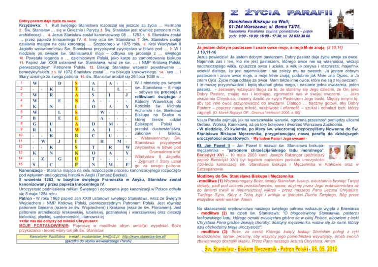 Dobry pasterz daje życie za owce Krzyżówka: 1. Kult świętego Stanisława rozpoczął się jeszcze za życia … Hermana 2. Św. Stanisław … się w Gnieźnie i Paryżu 3. Św. Stanisław jest również patronem m.in. archidiecezji … 4. Jezus Stanisław został kanonizowany 08 … 1253 r. 5. Stanisław został … przez papieża Innocentego IV. 6. Imię ojca św. Stanisława 7. Św. Stanisław podjął działania mające na celu koronację … Szczodrego w 1075 roku. 8. Król Władysław II Jagiełło wstawiennictwu Św. Stanisława przypisywał zwycięstwo w bitwie pod … 9. W I niedzielę po święcie św. Stanisława,8 maja – odbywa się procesja z … świętego 10. Powstała legenda o … dzielnicowym Polski, jako karze za zamordowanie biskupa 11. Papież Jan XXIII ustanowił św. Stanisława, wraz ze św. … i NMP Królową Polski, pierwszorzędnym Patronem Polski. 12. Biskup Stanisław wspierał powstawanie … benedyktyńskich. 13. W 1072 Stanisław został … na biskupa krakowskiego. 14. Król … I Stary uznał go za swego patrona 15. św. Stanisław urodził się 26 lipca 1030 w … 1 W 2 x 3 4 5 6 W W K W B G R D x K R E N L E S T A N I S Ł A W B I S K U P A Ł S A O A x x Ł x I x x J x A W A x Y x x x x x x W I niedzielę po święcie św. Stanisława – 8 maja – odbywa się procesja z relikwiami świętego z Katedry Wawelskiej do Kościoła św. Michała Archanioła i św. Stanisława Biskupa na Skałce w której bierze udział 8 x U D M x Episkopat Polski i przedst. duchowieństwa, 9 x x L A I zakonów i laikatu. 10 x x x R C U x - Wstawiennictwu Św. 11 x W J H M x Stanisława przypisywał 12 x x K T R W zwycięstwo w bitwie pod Grunwaldem król 13 K N O A Y Władysław II Jagiełło; 14 x x x x Z G T x - Zygmunt I Stary uznał 15 S C N W E go za swego patrona. Kanonizacja - Starania mające na celu rozpoczęcie procesu kanonizacyjnego rozpoczęto pod wpływem analogicznej historii w Anglii (Tomasz Becket). 8 września 1253, w bazylice świętego Franciszka w Asyżu, Stanisław został kanonizowany przez papieża Innocentego IV. Uroczystość podniesienia relikwii Świętego i ogłoszenia jego kanonizacji w Polsce odbyła się 8 maja 1254 roku. Patron - W roku 1963 papież Jan XXIII ustanowił świętego Stanisława, wraz ze Świętym Wojciechem i NMP Królową Polski, pierwszorzędnym Patronem Polski. Jest również patronem Gniezna (razem ze św. Wojciechem) i Krakowa (wraz ze św. Florianem). Jest patronem archidiecezji krakowskiej, lubelskiej, poznańskiej i warszawskiej oraz diecezji kieleckiej, płockiej, sandomierskiej i tarnowskiej 7 <<Nic nas nie odłączy od miłości Chrystusa>> MOJE POSTANOWIENIE: Poproszę w modlitwie abym umiał(a) wypełniać Boże przykazania i bronić wiary tak jak św. Stanisław Kancelaria Parafialna e-mail : [email protected] http://www.stanislaw-bm.pl/ [gazetka do użytku wewnętrznego Parafii] Stanisława Biskupa na Woli; 01-244 Warszawa; ul. Bema 73/75, Kancelaria Parafialna czynna: poniedziałek – piątek godz. 9:00 - 10:00; 16:00 - 17:30; tel. 22 632 38 00 Ja jestem dobrym pasterzem i znam owce moje, a moje Mnie znają (J 10,14) J 10,11-16 Jezus powiedział: Ja jestem dobrym pasterzem. Dobry pasterz daje życie swoje za owce. Najemnik zaś i ten, kto nie jest pasterzem, którego owce nie są własnością, widząc nadchodzącego wilka, opuszcza owce i ucieka, a wilk je porywa i rozprasza; /najemnik ucieka/ dlatego, że jest najemnikiem i nie zależy mu na owcach. Ja jestem dobrym pasterzem i znam owce moje, a moje Mnie znają, podobnie jak Mnie zna Ojciec, a Ja znam Ojca. Życie moje oddaję za owce. Mam także inne owce, które nie są z tej owczarni. I te muszę przyprowadzić i będą słuchać głosu mego, i nastanie jedna owczarnia, jeden pasterz. - Jesteśmy wdzięczni Bogu za to, że staliśmy się Jego dziećmi, że On, jako Dobry Pasterz, znając nas i kochając, zgromadził nas w swojej owczarni. … Jako owczarnia Chrystusa, chcemy dzielić ze swym Pasterzem Jego troski. Między innymi tę, aby też inne owce przyprowadzić do owczarni. Dlatego … bądźmy gotowi, aby Dobry Pasterz – poprzez naszą miłość, wrażliwość i ofiarność – szukał i odnalazł tych, którzy zaginęli. [O. Marek Rojszyk OP, „Oremus” kwiecień 2006, s. 90] Nasza Parafia zajmuje, jak na warszawskie warunki, ogromną przestrzeń pomiędzy ulicami Ordona, Wolską, Karolkową, aż po tory kolejowe i dworzec Warszawa Zachodnia. - W niedzielę, 29 kwietnia, po Mszy św. wieczornej rozpoczęliśmy Nowennę do Św. Stanisława Biskupa Męczennika, przygotowującą naszą parafię do dzisiejszych uroczystości odpustowych. - My ludem Pana i Jego owcami Bł. Jan Paweł II – Jan Paweł II nazwał św. Stanisława biskupamęczennika - "patronem chrześcijańskiego ładu moralnego". Benedykt XVI – 10 maja 2003 kard. Joseph Ratzinger (późniejszy papież Benedykt XVI) był legatem papieskim podczas uroczystości 750-lecia kanonizacji św. Stanisława Biskupa i Męczennika w Krakowie oraz w Szczepanowie Modlitwy do Św. Stanisława Biskupa i Męczennika: - modlitwa (1) Wszechmogący Boże, święty Stanisław, biskup, nieustannie broniąc Twojej chwały, padł pod ciosami prześladowców, spraw, abyśmy przez Jego wstawiennictwo aż do śmierci trwali w nienaruszonej wierze - przez naszego Pana Jezusa Chrystusa, Twojego Syna, Który z Tobą żyje i króluje w jedności Ducha Świętego, Bóg przez wszystkie wieki wieków. Amen. Na skuteczność orędownictwa naszego świętego patrona wskazuje wyjęta z Brewiarza - modlitwa (2) na dzień św. Stanisława: "O błogosławiony Stanisławie, pasterzu krakowskiego ludu, którego oznaki zwycięstwa głośne są w całej Polsce, albowiem z łaski Chrystusa Pana groźne znikają choroby: dostojny męczenniku, wstaw się za nami, którzy dziś obchodzimy twoją uroczystość". - modlitwa (3): Boże, za cześć Którego święty biskup Stanisław poległ z ręki bezbożników, spra