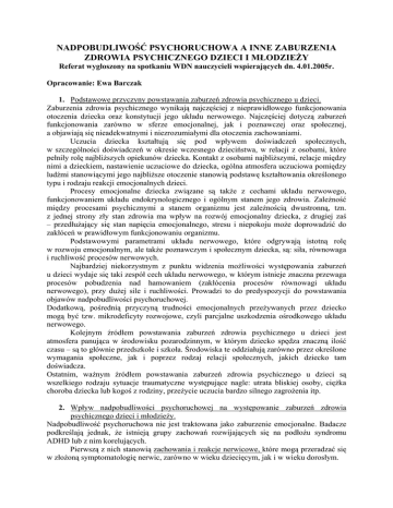 NADPOBUDLIWOŚĆ PSYCHORUCHOWA A INNE ZABURZENIA ZDROWIA PSYCHICZNEGO DZIECI I MŁODZIEŻY Referat wygłoszony na spotkaniu WDN nauczycieli wspierających dn. 4.01.2005r. Opracowanie: Ewa Barczak 1. Podstawowe przyczyny powstawania zaburzeń zdrowia psychicznego u dzieci. Zaburzenia zdrowia psychicznego wynikają najczęściej z nieprawidłowego funkcjonowania otoczenia dziecka oraz konstytucji jego układu nerwowego. Najczęściej dotyczą zaburzeń funkcjonowania zarówno w sferze emocjonalnej, jak i poznawczej oraz społecznej, a objawiają się nieadekwatnymi i niezrozumiałymi dla otoczenia zachowaniami. Uczucia dziecka kształtują się pod wpływem doświadczeń społecznych, w szczególności doświadczeń w okresie wczesnego dzieciństwa, w relacji z osobami, które pełniły rolę najbliższych opiekunów dziecka. Kontakt z osobami najbliższymi, relacje między nimi a dzieckiem, nastawienie uczuciowe do dziecka, ogólna atmosfera uczuciowa pomiędzy ludźmi stanowiącymi jego najbliższe otoczenie stanowią podstawę kształtowania określonego typu i rodzaju reakcji emocjonalnych dzieci. Procesy emocjonalne dziecka związane są także z cechami układu nerwowego, funkcjonowaniem układu endokrynologicznego i ogólnym stanem jego zdrowia. Zależność między procesami psychicznymi a stanem organizmu jest zależnością dwustronną, tzn. z jednej strony zły stan zdrowia ma wpływ na rozwój emocjonalny dziecka, z drugiej zaś – przedłużający się stan napięcia emocjonalnego, stresu i niepokoju może doprowadzić do zakłóceń w prawidłowym funkcjonowaniu organizmu. Podstawowymi parametrami układu nerwowego, które odgrywają istotną rolę w rozwoju emocjonalnym, ale także poznawczym i społecznym dziecka, są: siła, równowaga i ruchliwość procesów nerwowych. Najbardziej niekorzystnym z punktu widzenia możliwości występowania zaburzeń u dzieci wydaje się taki zespół cech układu nerwowego, w którym istnieje znaczna przewaga procesów pobudzenia nad hamowaniem (zakłócenia procesów równowagi układu nerwowego), przy dużej sile i ruchliwości. Prowadzi to do predyspozycji do powstawania objawów nadpobudliwości psychoruchowej. Dodatkową, pośrednią przyczyną trudności emocjonalnych przeżywanych przez dziecko mogą być tzw. mikrodeficyty rozwojowe, czyli parcjalne uszkodzenia ośrodkowego układu nerwowego. Kolejnym źródłem powstawania zaburzeń zdrowia psychicznego u dzieci jest atmosfera panująca w środowisku pozarodzinnym, w którym dziecko spędza znaczną ilość czasu – są to głównie przedszkole i szkoła. Środowiska te oddziałują zarówno przez określone wymagania społeczne, jak i poprzez rodzaj relacji społecznych, jakich dziecko tam doświadcza. Ostatnim, ważnym źródłem powstawania zaburzeń zdrowia psychicznego u dzieci są wszelkiego rodzaju sytuacje traumatyczne występujące nagle: utrata bliskiej osoby, ciężka choroba dziecka lub kogoś z rodziny, przeżycie uczucia bardzo silnego zagrożenia itp. 2. Wpływ nadpobudliwości psychoruchowej na występowanie zaburzeń zdrowia psychicznego dzieci i młodzieży. Nadpobudliwość psychoruchowa nie jest traktowana jako zaburzenie emocjonalne. Badacze podkreślają jednak, że istnieją grupy zachowań rozwijających się na podłożu syndromu ADHD lub z nim korelujących. Pierwszą z nich stanowią zachowania i reakcje nerwicowe, które mogą przeradzać się w złożoną symptomatologię nerwic, zarówno w wieku dziecięcym, jak i w wieku dorosłym. Wynikają one z jednej strony – z zaburzonej równowagi procesów nerwowych, z drugiej zaś – mogą być efektem nadmiernie karzących i nadmiernie krytycznych reakcji otoczenia na trudne zachowania dziecka lub przedłużającej się sytuacji braku sukcesów w realizacji zadań oraz w kontaktach społecznych. Trudności w tych ostatnich związane są zarówno z ograniczonymi możliwościami koncentracji uwagi, brakiem tolerancji na otoczenie przy zaspokajaniu potrzeb oraz z nadmiernie szybkimi reakcjami w toku myślenia i działania. Do reakcji nerwicowych są predysponowane szczególnie te dzieci nadpobudliwe, które oprócz wrodzonej skłonności do silniejszych i bardziej labilnych reakcji na bodźce otoczenia poddawane były karzącemu treningowi zachowań społecznych, wymuszających na nich posłuszeństwo i hamowaniu nadpobudliwych zachowań, pod groźbą utraty akceptacji i miłości najbliższego otoczenia. Musiało to z kolei wywoływać silne napięcie nerwicowe, związane z ogromnymi trudnościami w sprostaniu wymaganiom, lęk przed odrzuceniem oraz w konsekwencji – objawy nerwicowe. Drugą grupą zaburzeń, skorelowaną często z nadpobudliwością, są fragmentaryczne deficyty rozwojowe, które przy normalnej inteligencji dziecka powodują specyficzne trudności w zakresie postrzegania wzrokowego czy słuchowego bądź przejawiają się niższym poziomem sprawności i koordynacji ruchowej dziecka oraz zaburzeniami lateralizacji. Związek tych zaburzeń z nadpobudliwością polega na wspólnej przyczynie, za jaką uważa się czynnik uszkadzający ośrodkowy układ nerwowy. Często pojawiające się zaburzenia dyslektyczne, dysgraficzne lub dyskalkuliczne są dla dziecka z ADHD znacznie większym obciążeniem niż dla innych dzieci. Trudności związane z koncentracją uwagi dodatkowo zwielokrotniają zniekształcenia napływających informacji. Trudności w nauce powodują pogorszenie zdolności koncentracji uwagi, a kiedy dziecko nie potrafi się skupić, popełnia coraz więcej błędów. Powstaje wtedy „mechanizm błędnego koła”. Jak okazało się w badaniach, dzieci nadpobudliwe mają też pewne specyficzne trudności językowe: np. trudności w budowaniu spójnych wypowiedzi, częste odbieganie od tematu, nieprzestrzeganie zasad prowadzenia rozmowy, zbyt szybkie i zbyt głośne mówienie, trudności w posługiwaniu się przyimkami określającymi położenie w przestrzeni oraz trudności 