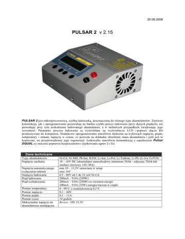 20.08.2008 PULSAR 2 v 2.15 PULSAR 2 jest mikroprocesorową, szybką ładowarką, przeznaczoną do różnego typu akumulatorów. Zarówno konstrukcja, jak i oprogramowanie pozawalają na bardzo szybki proces ładowania (przy dużych prądach), nie powodując przy tym uszkodzenia ładowanego akumulatora, a w niektórych przypadkach zwiększając jego żywotność. Parametry procesu ładowania są wyświetlane na wyświetlaczu LCD i poprzez złącze RS przekazywane do komputera. Dodatkowe oprogramowanie umożliwia śledzenie na wykresach napięcia, prądu, temperatury i zmiany napięcia w czasie, co pozwala na dokładne określenie stanu akumulatora i jeśli jest to konieczne, na przeprowadzenie jego regeneracji. Ładowarka umożliwia komunikację z equalizerem Pulsar EQUAL co znacznie poprawia bezpieczeństwo użytkowania ogniw Li-Xx. Dane techniczne Typy akumulatorów Napięcie zasilania Napięcia automatycznego wyłączenia (alarm) Napięcie ładowania Prąd ładowania Prąd rozładowania Pomiar temperatury Pomiar napięcia Pomiar prądu Pomiar czasu Maksymalne napięcie na akumulatorze zasilającym Ni-Cd, Ni-MH, Pb-bat, RAM, Li-Ion, Li-Pol, Li-Tadiran, Li-Ph (Li-Ion FePO4) 10 – 16V DC (akumulator samochodowy minimum 30Ah - zalecany 70Ah lub zasilacz sieciowy 14V/30A) min 10 – 11,5V ustawiane w setup max 16V 0.5 - 60V od 1 do 32 celi Ni-Cd 200mA – 9,9A (250W) 200mA – 9,9A (250W) ze zwrotem energii 200mA – 9,9A (35W) energia tracona w ciepło 0 - 99°C z rozdzielczością 0,1°C 0,1 – 60V 0,1 – 11A 14 godzin Revers - ON 15,3V Włączenie ładowarki Ładowarka jest przystosowana do pracy z akumulatorem samochodowym. Możliwa jest również praca z zasilaczem sieciowym o napięciu wyjściowym 12 – 14 V i prądzie przynajmniej 5A (zalecane 30 A). Kabel czerwony + 12V Kabel niebieski – 12V, masa Na lewej, bocznej ściance znajdują się kolejno złącza: • gniazdo czujnika temperatury (port komunikacji z balanserem Pulsar EQUAL) • gniazdo zasilania wentylatora chłodzącego pakiet akumulatorów (max 1,2A) • gniazdo RS 232 – do podłączenia z komputerem PC (9 pin) Po podłączeniu do zasilania, wybierając opcję Setup (klawisz M) można włączyć/wyłączyć sygnał dźwiękowy, włączyć/wyłączyć zabezpieczenie termiczne oraz ustawić wartość napięcia zasilania, poniżej którego ładowarka ma przerwać pracę i włączyć sygnał alarmowy (zabezpieczenie przed nadmiernym rozładowaniem akumulatora samochodowego). Wybierając opcje Start (klawisz E) przechodzimy do menu głównego. - P U S t a L r S A R t - Tryb Start Klawisze E Setup M ( + , – ); E V S 2 e . t 1 u 5 p Funkcja Menu główne Mem 1-8.; Format; Test Ustawienia globalne 1. Bib On/Off – sygnał dźwiękowy ( + , – ); E 2. T max On/Off – zabezpieczenie termiczne ( + , – ); E 3. T on < od 30 do 45°C – rozpoczęcie przy T<Ton ( + , – ); E 4. T off < od 50 do 65°C – przerwanie przy T>Toff ( + , – ); E 5. Voff od 10 do 11,5V – minimalne napięcie ( + , – ) ; E - ustawianie wartości klawiszami „+” lub „–” i potwierdzenie klawiszem „E” na wyświetlaczu LCD ustawiany parametr miga Tmax On – włączy badanie temperatury Ton i Toff. Ton – jeśli temperatura pakietu przekracza ustawioną temperaturę Ton, proces rozpocznie się dopiero po ostygnięciu akumulatora do zadanej temperatury (wymuszenie startu kl. +). Toff – przekroczenie zadanej temperatury pakietu spowoduje przerwanie procesu i alarm dźwiękowy. Ustawienie prądu i funkcja limitera Krótkie naciśnięcie klawisza E umożliwi zmianę prądu danego procesu. Jeśli jest to proces złożony (Dis/Ch. rozładowanie /ładowanie) można ustawić różne wartości prądów. D i s c h . - - , - A h 8 , 0 A N i - C d R A 8 W trybie ustawiania prądu, można również zadać maksymalną pojemność pakietu (0,1 – 12.0 Ah), po osiągnięciu której, proces zostanie przerwany - limiter. Po naciśnięciu klawisza M, klawiszami + , – można ustawić żądaną wartość i potwierdzić klawiszem E ( --,-Ah oznacza wyłączenie tej funkcji). Rozpoczęcie procesu W chwili podłączenia pakietu do ładowarki rozpocznie się test połączenia, po którym ładowarka oszacuje ilość ogniw w pakiecie. Jeśli akumulator jest naładowany lub zbytnio rozładowany należy skorygować ilość ogniw ( + , – ). Potwierdzenie klawiszem E rozpocznie właściwy cykl pracy, zależny od ustawionego trybu. D i s c h . - - , - A h 9 , 0 V R A 0 7 N i - C d Zakończenie procesu Zakończenie procesu jest sygnalizowane miganiem wyświetlanych danych na wyświetlaczu, pulsowaniem podświetlenia i przerywanym sygnałem dźwiękowym. Po 30 s sygnał dźwiękowy jest wyciszony do „cichego stukania”. Wyświetlone dane są ostatnimi zmierzonymi wartościami podczas trwania procesu. Rozpoczęcie nowego procesu na tym samym pakiecie jest możliwe dopiero po odłączeniu i ponownym podłączeniu pakietu! Menu główne (akumulator odłączony) Menu główne składa się z 10 okien. • M 1-8 pamięć procesów, formowanie/regeneracja i test pakietów Pamięć procesów M1-8 Numer pamięci - cyfra w prawym dolnym rogu na wyświetlaczu. W każdej z ośmiu pamięci można zapamiętać: Parametry procesu Podstawowym parametrem jest prąd ładowania/rozładowania. W procesach złożonych (roz./ładowanie, ład./rozładowanie) można ustawić inne prądy ładowania i rozładowania. Tryb pracy rozładowanie – Disch., ładowanie – Charge, rozładowanie/ładowanie – Dis/Ch., ładowanie/rozładowanie – Ch/Dis. Typ ogniw Ni-Cd, Ni-MH, Pb-bat, RAM, Li-Ion, Li-Pol, Li-Tadiran, Li-Ph Okno informacyjne (akumulator odłączony) Naciśnięcie klawisza M spowoduje wyświetlenie okna informacyjnego. V b = 1 2 , 5 V M e m Vb=12,5V Tc=23,7 Mem 2,131Ah - T c = 2 3 , 7 2 , 1 3 1 A h napięcie zasilania temperatura akumulatora (--,- czujnik nie podłączony) pamięć danych z 8 ostatnich procesów pomiar energii z ostatniego procesu Naciśnięcie klawisz