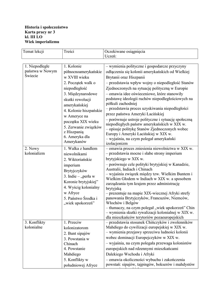 Historia i społeczeństwo Karta pracy nr 3 kl. III LO Wiek imperializmu Temat lekcji Treści 1. Niepodległe państwa w Nowym Świecie 1. Kolonie północnoamerykańskie w XVIII wieku 2. Początek walk o niepodległość 3. Międzynarodowe skutki rewolucji amerykańskiej 4. Kolonie hiszpańskie w Ameryce na początku XIX wieku 5. Zerwanie związków z Hiszpanią 6. Ameryka dla Amerykanów 2. Nowy kolonializm 1. Walka z handlem niewolnikami 2. Wiktoriańskie imperium Brytyjczyków 3. Indie – „perła w Koronie brytyjskiej” 4. Wyścig kolonialny w Afryce 5. Państwo Środka i „wiek upokorzeń” 3. Konflikty kolonialne 1. Przeciw kolonizatorom 2. Bunt sipajów 3. Powstania w Chinach 4. Powstanie Mahdiego 5. Konflikty w południowej Afryce Oczekiwane osiągnięcia Uczeń: – wymienia polityczne i gospodarcze przyczyny odłączenia się kolonii amerykańskich od Wielkiej Brytanii oraz Hiszpanii – przedstawia wpływ wojny o niepodległość Stanów Zjednoczonych na sytuację polityczną w Europie – omawia idee oświeceniowe, które stanowiły podstawę ideologii ruchów niepodległościowych na półkuli zachodniej – przedstawia proces uzyskiwania niepodległości przez państwa Ameryki Łacińskiej – porównuje ustroje polityczne i sytuację społeczną niepodległych państw amerykańskich w XIX w. – opisuje politykę Stanów Zjednoczonych wobec Europy i Ameryki Łacińskiej w XIX w. – wyjaśnia, na czym polegał amerykański izolacjonizm – omawia proces zniesienia niewolnictwa w XIX w. – przedstawia mocne i słabe strony imperium brytyjskiego w XIX w. – porównuje cele polityki brytyjskiej w Kanadzie, Australii, Indiach i Chinach – wyjaśnia związek między tzw. Wielkim Buntem i Wielkim Głodem w Indiach w XIX w. a sposobem zarządzania tym krajem przez administrację brytyjską – prezentuje na mapie XIX-wiecznej Afryki strefy panowania Brytyjczyków, Francuzów, Niemców, Włochów i Belgów – tłumaczy, na czym polegał „wiek upokorzeń” Chin – wymienia skutki rywalizacji kolonialnej w XIX w. dla mieszkańców terytoriów pozaeuropejskich – przedstawia stosunek Chińczyków i zwolenników Mahdiego do cywilizacji europejskiej w XIX w. – wymienia przejawy sprzeciwu ludności kolonii wobec dominacji Europejczyków w XIX w. – wyjaśnia, na czym polegała przewaga kolonistów europejskich nad rdzennymi mieszkańcami Dalekiego Wschodu i Afryki – omawia okoliczności wybuchu i zakończenia powstań: sipajów, tajpingów, bokserów i mahdystów oraz wojen burskich 4. Ekonomia w okresie imperializmu 1. Rola kolonii w epoce industrialnej 2. Szlaki oceaniczne 3. Kolej a kolonizacja 4. Metody administrowania koloniami 5. Brzemię białego człowieka 1. Stosunek Europejczyków do ludności skolonizowanej 2. Ideologia imperialna 3. Skutki kolonializmu dla ludności pozaeuropejskiej 4. Krytyka kolonializmu 5. Wpływ kolonializmu na kulturę europejską 1. Japonia: od izolacji do otwarcia na świat 2. Reformy w Japonii 3. Podboje japońskie i wojna z Rosją 4. Klęski Europejczyków w próbach kolonizacji 5. Początki ruchów niepodległościowych w koloniach 6. Świat wobec dominacji mocarstw kolonialnych oraz wojen burskich – opisuje walki plemion afrykańskich i indiańskich z najeźdźcami z zachodniego kręgu kulturowego – prezentuje kierunki ekspansji gospodarczej mocarstw europejskich na rynku światowym w epoce industrialnej – omawia wpływ rozwoju przemysłu w XIXwiecznej Europie na politykę kolonialną państw europejskich – przedstawia znaczenie budowy Kanału Sueskiego i Kanału Panamskiego dla usprawnienia transportu i umocnienia pozycji politycznej mocarstw kolonialnych – wyjaśnia, w jakich celach władze mocarstw kolonialnych rozwijały sieć kolejową i telegraficzną na podporządkowanych sobie terenach – porównuje metody administrowania koloniami stosowane przez władze metropolitalne – przedstawia i ocenia stosunek Europejczyków i Amerykanów do rdzennej ludności kolonizowanych terytoriów – ocenia ideologię i politykę imperialną mocarstw kolonialnych w XIX w. – wymienia polityczne, społeczne i gospodarcze skutki XIX-wiecznego kolonializmu – prezentuje działalność europejskich przeciwników polityki imperialnej i kolonializmu w XIX w. – wyjaśnia, które zdobycze cywilizacji europejskiej pozytywnie wpłynęły na sytuację rdzennych mieszkańców kolonii – opisuje cechy charakterystyczne orientalizmu w kulturze XIX-wiecznej Europy – przedstawia okoliczności otwarcia Japonii na świat i obalenia systemu szogunatu w XIX w. – opisuje proces modernizacji Japonii w XIX w. i jego skutki – omawia cele strategiczne Rosji i Japonii podczas wojny w latach 1904–1905 – wymienia przyczyny utrzymania niepodległości w XIX w. przez Afganistan i Etiopię – wyjaśnia, dlaczego na przełomie XIX i XX w. wykształceni w Europie przedstawiciele inteligencji z krajów skolonizowanych zaczęli sprzeciwiać się polityce światowych mocarstw