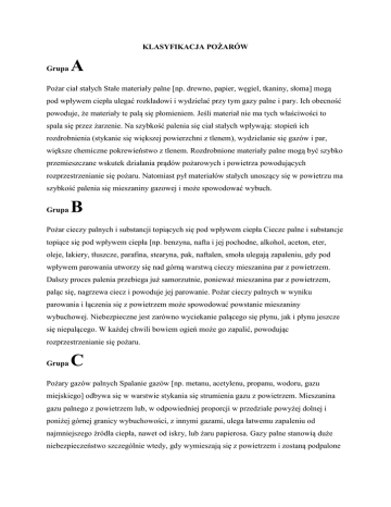 KLASYFIKACJA POŻARÓW Grupa A Pożar ciał stałych Stałe materiały palne [np. drewno, papier, węgiel, tkaniny, słoma] mogą pod wpływem ciepła ulegać rozkładowi i wydzielać przy tym gazy palne i pary. Ich obecność powoduje, że materiały te palą się płomieniem. Jeśli materiał nie ma tych właściwości to spala się przez żarzenie. Na szybkość palenia się ciał stałych wpływają: stopień ich rozdrobnienia (stykanie się większej powierzchni z tlenem), wydzielanie się gazów i par, większe chemiczne pokrewieństwo z tlenem. Rozdrobnione materiały palne mogą być szybko przemieszczane wskutek działania prądów pożarowych i powietrza powodujących rozprzestrzenianie się pożaru. Natomiast pył materiałów stałych unoszący się w powietrzu ma szybkość palenia się mieszaniny gazowej i może spowodować wybuch. Grupa B Pożar cieczy palnych i substancji topiących się pod wpływem ciepła Ciecze palne i substancje topiące się pod wpływem ciepła [np. benzyna, nafta i jej pochodne, alkohol, aceton, eter, oleje, lakiery, tłuszcze, parafina, stearyna, pak, naftalen, smoła ulegają zapaleniu, gdy pod wpływem parowania utworzy się nad górną warstwą cieczy mieszanina par z powietrzem. Dalszy proces palenia przebiega już samorzutnie, ponieważ mieszanina par z powietrzem, paląc się, nagrzewa ciecz i powoduje jej parowanie. Pożar cieczy palnych w wyniku parowania i łączenia się z powietrzem może spowodować powstanie mieszaniny wybuchowej. Niebezpieczne jest zarówno wyciekanie palącego się płynu, jak i płynu jeszcze się niepalącego. W każdej chwili bowiem ogień może go zapalić, powodując rozprzestrzenianie się pożaru. Grupa C Pożary gazów palnych Spalanie gazów [np. metanu, acetylenu, propanu, wodoru, gazu miejskiego] odbywa się w warstwie stykania się strumienia gazu z powietrzem. Mieszanina gazu palnego z powietrzem lub, w odpowiedniej proporcji w przedziale powyżej dolnej i poniżej górnej granicy wybuchowości, z innymi gazami, ulega łatwemu zapaleniu od najmniejszego źródła ciepła, nawet od iskry, lub żaru papierosa. Gazy palne stanowią duże niebezpieczeństwo szczególnie wtedy, gdy wymieszają się z powietrzem i zostaną podpalone w pomieszczeniu zamkniętym. Wybuch mieszaniny gazowo-powietrznej może dokonać poważnych zniszczeń w budynku, a nawet jego okolicach. Grupa D D Pożary metali Metale [np. lit, sód, potas, glin i ich stopy], w zależności od składu chemicznego, podczas palenia zużywają tlen z powietrza albo – jako mieszaniny mające w swym składzie utleniacze – spalają się bez dostępu do powietrza [np. termit (pirotechnika), elektron (stop magnezu)]. Metale te oraz mieszanki ciekłe, przeważnie pochodne ropy naftowej [np. napalm, pirożel], są trudne do ugaszenia. Z tego powodu armie stosują je jako środki zapalające, wywołujące pożary punktowe lub przestrzenne. Grupa E Pożary tłuszczów Pożary tłuszczów i olejów w urządzeniach kulinarnych. Wyróżnienie tej klasy wynikło z tego, że tłuszcze spożywcze w czasie ich użytkowania (np. smażenie) mają wysoką temperaturę, co utrudnia ich gaszenie, gdy są w większej ilości (np. urządzenia kuchenne stosowane w restauracjach), ponieważ po ich ugaszeniu mogą znów zacząć się palić, gdy znów dotrze do nich tlen z powietrza. Niebezpieczeństwo pożarów tej grupy wynika również z tego, że przy próbie ugaszenia takiego pożaru wodą może nastąpić wyrzut palącego się tłuszczu co gwałtownie może powiększyć strefę spalania. Do kwietnia 2006 grupa E obejmowała pożary grup A, B, C i D w pobliżu urządzeń elektrycznych. W niektórych krajach wyróżnia się także grupę F – tłuszcze i oleje spożywcze. Natomiast w USA stosuje się inny podział na grupy: A – ciała stałe, B – ciecze i gazy palne, C – pożary grup A i B w pobliżu urządzeń pod napięciem, D – metale palne, K – tłuszcze spożywcze w urządzeniach kuchennych.