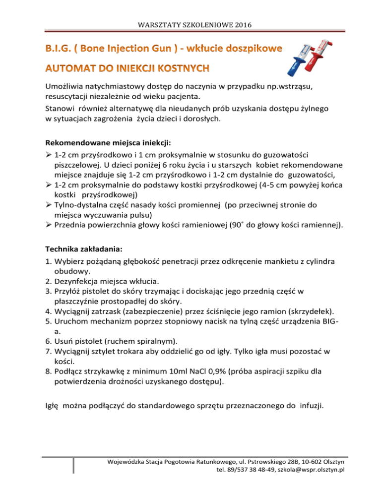WARSZTATY SZKOLENIOWE 2016 Umożliwia natychmiastowy dostęp do naczynia w przypadku np.wstrząsu, resuscytacji niezależnie od wieku pacjenta. Stanowi również alternatywę dla nieudanych prób uzyskania dostępu żylnego w sytuacjach zagrożenia życia dzieci i dorosłych. Rekomendowane miejsca iniekcji: 1-2 cm przyśrodkowo i 1 cm proksymalnie w stosunku do guzowatości piszczelowej. U dzieci poniżej 6 roku życia i u starszych kobiet rekomendowane miejsce znajduje się 1-2 cm przyśrodkowo i 1-2 cm dystalnie do guzowatości, 1-2 cm proksymalnie do podstawy kostki przyśrodkowej (4-5 cm powyżej końca kostki przyśrodkowej) Tylno-dystalna część nasady kości promiennej (po przeciwnej stronie do miejsca wyczuwania pulsu) Przednia powierzchnia głowy kości ramieniowej (90˚ do głowy kości ramiennej). Technika zakładania: 1. Wybierz pożądaną głębokość penetracji przez odkręcenie mankietu z cylindra obudowy. 2. Dezynfekcja miejsca wkłucia. 3. Przyłóż pistolet do skóry trzymając i dociskając jego przednią część w płaszczyźnie prostopadłej do skóry. 4. Wyciągnij zatrzask (zabezpieczenie) przez ściśnięcie jego ramion (skrzydełek). 5. Uruchom mechanizm poprzez stopniowy nacisk na tylną część urządzenia BIGa. 6. Usuń pistolet (ruchem spiralnym). 7. Wyciągnij sztylet trokara aby oddzielić go od igły. Tylko igła musi pozostać w kości. 8. Podłącz strzykawkę z minimum 10ml NaCl 0,9% (próba aspiracji szpiku dla potwierdzenia drożności uzyskanego dostępu). Igłę można podłączyć do standardowego sprzętu przeznaczonego do infuzji. Wojewódzka Stacja Pogotowia Ratunkowego, ul. Pstrowskiego 28B, 10-602 Olsztyn tel. 89/537 38 48-49, [email protected] WARSZTATY SZKOLENIOWE 2016 Zalecana głębokość penetracji: Dorośli: A. Przyśrodkowo od guzowatości kości piszczelowej- 2,5cm B. Powyżej kostki przyśrodkowej - 2,0cm C. Dystalna część kości promieniowej- 1,5cm D. Głowa kości ramieniowej - 2,5cm Wyznaczenie miejsca wkłucia (dorosły) Dzieci: Od 0 do 3 lat 0,5 - 1 cm. Od 3 do 6 lat 1 – 1,5 cm. Od 6 do 12 lat 1,5 cm. Rekomendowane miejsce wkłucia – proksymalny odcinek kości piszczelowej. Wojewódzka Stacja Pogotowia Ratunkowego, ul. Pstrowskiego 28B, 10-602 Olsztyn tel. 89/537 38 48-49, [email protected] WARSZTATY SZKOLENIOWE 2016 Wyznaczenie miejsca wkłucia (dziecko od 0-12 lat) Wojewódzka Stacja Pogotowia Ratunkowego, ul. Pstrowskiego 28B, 10-602 Olsztyn tel. 89/537 38 48-49, [email protected]