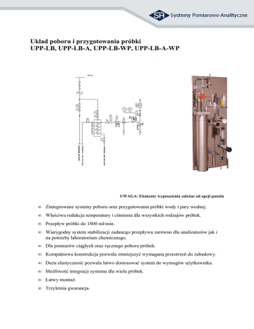 Układ poboru i przygotowania próbki UPP-LB, UPP-LB-A, UPP-LB-WP, UPP-LB-A-WP KKS No. TI PI UWAGA: Elementy wyposażenia zależne od opcji panelu • Zintegrowane systemy poboru oraz przygotowania próbki wody i pary wodnej. • Właściwa redukcja temperatury i ciśnienia dla wszystkich rodzajów próbek. • Przepływ próbki do 1800 ml/min. • Wiarygodny system stabilizacji zadanego przepływu zarówno dla analizatorów jak i na potrzeby laboratorium chemicznego. • Dla pomiarów ciągłych oraz ręcznego poboru próbek. • Kompaktowa konstrukcja pozwala zmniejszyć wymaganą przestrzeń do zabudowy. • Duża elastyczność pozwala łatwo dostosować system do wymogów użytkownika. • Możliwość integracji systemu dla wielu próbek. • Łatwy montaż. • Trzyletnia gwarancja. UPP – LB UPP – WP – LB ELEMENTY STANDARDOWE • • • • • • • Chłodnica próbki W9150 lub W9250 Zawory odcinające wodę chłodzącą (wlot/wylot) Zawór odcinający próbki Zwór iglicowy jako regulator przepływu Zwór spustowy (wlot – przedmuch trasy) Zawór spustowy próbki Zawór spustowy wody chłodzącej ELEMENTY STANDARDOWE • • • • • • • Chłodnica próbki W9150 lub W9250 Zawory odcinające wodę chłodzącą (wlot/wylot) Zawór odcinający próbki Reduktor ciśnienia Zwór spustowy (przedmuch trasy wysokociśnieniowy) Zawór spustowy próbki Zawór spustowy wody chłodzącej UPP – LB – A UPP – LB – WP - A ELEMENTY STANDARDOWE ELEMENTY STANDARDOWE Jak wyżej plus • Manometr • Regulator ciśnienia wstecznego Jak wyżej plus • Manometr • Regulator ciśnienia wstecznego • • • • • • • • • • • • OPCJE DODATKOWE Wziernik (kontrola przepływu) TSV – bezpiecznik termiczny Rotametr Termometr Krańcówki sygnalizacyjne NC/NO Stojak OPCJE DODATKOWE Wziernik (kontrola przepływu) TSV – bezpiecznik termiczny Rotametr Termometr Krańcówki sygnalizacyjne NC/NO. Stojak Chłodnica TSV (termiczny zawór odcinający) Wykonana ze stali nierdzewnej SS 316 Ti wężownica, płaszcz wykonany ze stali 304L. Dostępne dwa modele o długościach wężownicy 12m i 19m, do zastosowania w zależności od temperatury próbki. Na życzenie jako opcja wężownica wykonana z Inconelu® dla wody chłodzącej o dużym zasoleniu. Odcina gorącą próbkę w mniej niż 5 sekund. Chroni analizatory oraz obsługę. Wielokrotnego zadziałania. Automatycznie zazbraja się po ostygnięciu. Reduktor ciśnienia Reduktor wysokiego ciśnienia max ∆p 350 bar. Możliwość regulacji wydajności w czasie pracy. Odporny na zanieczyszczenia, z możliwością czyszczenia na obiekcie. Opcjonalnie w miejsce reduktora PrRED przy parametrach poniżej 1,7MPa, instalowany jest zawór iglicowy jako regulator przepływu. Regulator ciśnienia wstecznego Dokładnie reguluje zadane ciśnienie w celu utrzymania właściwego przepływu. Dzięki możliwości swobodnego ustawienia ciśnienia w zakresie 0–3,5 bar pozwala ominąć problemy związane z oporami przepływu medium na drodze do analizatora. Rozwiązanie szczególnie korzystne dla systemów, gdzie analizatory znajdują się ponad układami przygotowania próbki. Specyfikacja zamówieniowa UPP-LB: ciśnienie do 1,7MPa; pobór ręczny na potrzeby laboratorium chemicznego UPP-LB-A: ciśnienie do 1,7MPa; pobór ręczny oraz wyjście z regulatorem dla urządzeń do pomiarów ciągłych UPP-WP-LB: ciśnienie > 1,7MPa; pobór ręczny na potrzeby laboratorium chemicznego UPP-WP-LB-A: ciśnienie > 1,7MPa; pobór ręczny oraz wyjście z regulatorem dla urządzeń do pomiarów ciągłych. UWAGA: Typ chłodnicy dobiera się w zależności od temperatury próbki oraz na podstawie zapotrzebowania medium do analizy. Każdy z elementów systemu można kupić osobno. SPA Systemy Pomiarowo-Analityczne sp. z o.o. www.spa-systemy.pl; [email protected]