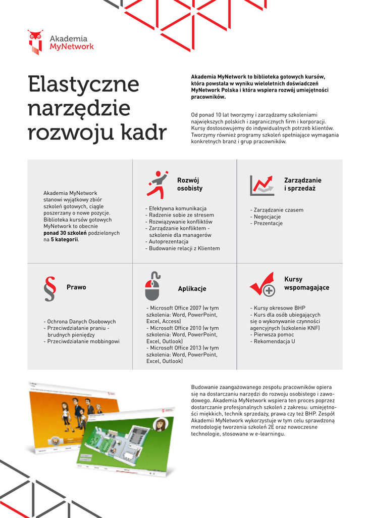 Elastyczne narzędzie rozwoju kadr Akademia MyNetwork stanowi wyjątkowy zbiór szkoleń gotowych, ciągle poszerzany o nowe pozycje. Biblioteka kursów gotowych MyNetwork to obecnie ponad 30 szkoleń podzielonych na 5 kategorii. Prawo - Ochrona Danych Osobowych - Przeciwdziałanie praniu brudnych pieniędzy - Przeciwdziałanie mobbingowi Akademia MyNetwork to biblioteka gotowych kursów, która powstała w wyniku wieloletnich doświadczeń MyNetwork Polska i która wspiera rozwój umiejętności pracowników. Od ponad 10 lat tworzymy i zarządzamy szkoleniami największych polskich i zagranicznych firm i korporacji. Kursy dostosowujemy do indywidualnych potrzeb klientów. Tworzymy również programy szkoleń spełniające wymagania konkretnych branż i grup pracowników. Rozwój osobisty - Efektywna komunikacja - Radzenie sobie ze stresem - Rozwiązywanie konfliktów - Zarządzanie konfliktem szkolenie dla managerów - Autoprezentacja - Budowanie relacji z Klientem Aplikacje - Microsoft Office 2007 (w tym szkolenia: Word, PowerPoint, Excel, Access) - Microsoft Office 2010 (w tym szkolenia: Word, PowerPoint, Excel, Outlook) - Microsoft Office 2013 (w tym szkolenia: Word, PowerPoint, Excel, Outlook) Zarządzanie i sprzedaż - Zarządzanie czasem - Negocjacje - Prezentacje Kursy wspomagające - Kursy okresowe BHP - Kurs dla osób ubiegających się o wykonywanie czynności agencyjnych (szkolenie KNF) - Pierwsza pomoc - Rekomendacja U Budowanie zaangażowanego zespołu pracowników opiera się na dostarczaniu narzędzi do rozwoju osobistego i zawodowego. Akademia MyNetwork wspiera ten proces poprzez dostarczanie profesjonalnych szkoleń z zakresu: umiejętności miękkich, technik sprzedaży, prawa czy też BHP. Zespół Akademii MyNetwork wykorzystuje w tym celu sprawdzoną metodologię tworzenia szkoleń 2E oraz nowoczesne technologie, stosowane w e-learningu. Elastyczne narzędzie rozwoju kadr Dzięki profesjonalnej realizacji procesów kształcenia kadr, wspieramy największe polskie firmy i organizacje. Oferujemy kompleksowe rozwiązania, które odpowiadają zróżnicowanym potrzebom i możliwościom Klientów. Proponujemy 2 modele udostępniania szkoleń, pozwalające na przełamanie ograniczeń związanych z wdrożeniem e-learningu w organizacjach i optymalne wykorzystanie zasobów posiadanych przez Klientów. 1 2 Proces szkolenia realizowany na platformie LMS Klienta w wariancie z licencją ograniczoną czasowo lub/i ilościowo. Kompleksowa realizacja całego procesu szkoleniowego w oparciu o zasoby MyNetwork Polska. Akademia MyNetwork jest uniwersalnym narzędziem, wykorzystywanym do rozwoju umiejętności pracowników. Ze szkoleń Akademii MyNetwork skorzystali już: Nasi konsultanci profesjonalnie doradzą, jaki model wykorzystania Akademii MyNetwork w Państwa firmie będzie najkorzystniejszy. Jeśli chcą Państwo uzyskać dodatkowe informacje na temat Akademii MyNetwork lub otrzymać dostęp demo do szkoleń, zachęcamy do kontaktu: www.akademia.mynetwork.pl tel. 12 631 54 21 e-mail: [email protected]