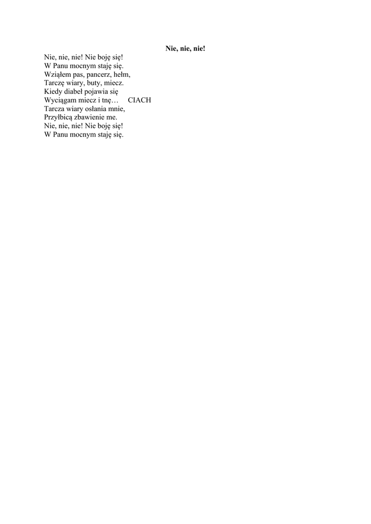 Nie, nie, nie! Nie, nie, nie! Nie boję się! W Panu mocnym staję się. Wziąłem pas, pancerz, hełm, Tarczę wiary, buty, miecz. Kiedy diabeł pojawia się Wyciągam miecz i tnę… CIACH Tarcza wiary osłania mnie, Przyłbicą zbawienie me. Nie, nie, nie! Nie boję się! W Panu mocnym staję się.