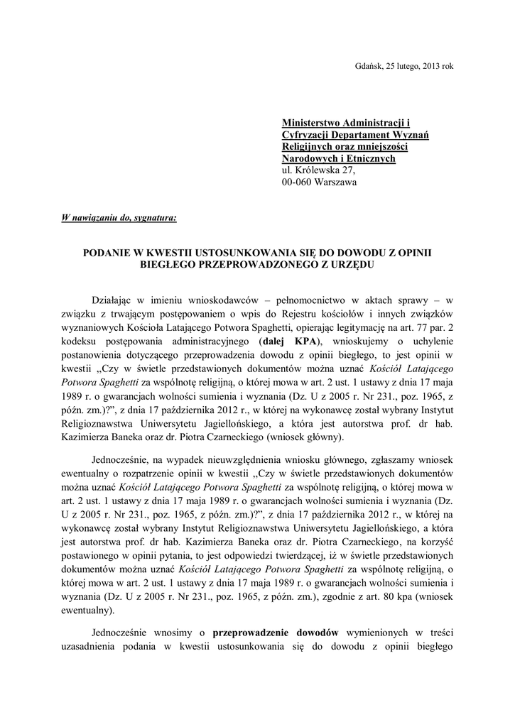 Gdańsk, 25 lutego, 2013 rok Ministerstwo Administracji i Cyfryzacji Departament Wyznań Religijnych oraz mniejszości Narodowych i Etnicznych ul. Królewska 27, 00-060 Warszawa W nawiązaniu do, sygnatura: PODANIE W KWESTII USTOSUNKOWANIA SIĘ DO DOWODU Z OPINII BIEGŁEGO PRZEPROWADZONEGO Z URZĘDU Działając w imieniu wnioskodawców – pełnomocnictwo w aktach sprawy – w związku z trwającym postępowaniem o wpis do Rejestru kościołów i innych związków wyznaniowych Kościoła Latającego Potwora Spaghetti, opierając legitymację na art. 77 par. 2 kodeksu postępowania administracyjnego (dalej KPA), wnioskujemy o uchylenie postanowienia dotyczącego przeprowadzenia dowodu z opinii biegłego, to jest opinii w kwestii ,,Czy w świetle przedstawionych dokumentów można uznać Kościół Latającego Potwora Spaghetti za wspólnotę religijną, o której mowa w art. 2 ust. 1 ustawy z dnia 17 maja 1989 r. o gwarancjach wolności sumienia i wyznania (Dz. U z 2005 r. Nr 231., poz. 1965, z późn. zm.)?”, z dnia 17 października 2012 r., w której na wykonawcę został wybrany Instytut Religioznawstwa Uniwersytetu Jagiellońskiego, a która jest autorstwa prof. dr hab. Kazimierza Baneka oraz dr. Piotra Czarneckiego (wniosek główny). Jednocześnie, na wypadek nieuwzględnienia wniosku głównego, zgłaszamy wniosek ewentualny o rozpatrzenie opinii w kwestii ,,Czy w świetle przedstawionych dokumentów można uznać Kościół Latającego Potwora Spaghetti za wspólnotę religijną, o której mowa w art. 2 ust. 1 ustawy z dnia 17 maja 1989 r. o gwarancjach wolności sumienia i wyznania (Dz. U z 2005 r. Nr 231., poz. 1965, z późn. zm.)?”, z dnia 17 października 2012 r., w której na wykonawcę został wybrany Instytut Religioznawstwa Uniwersytetu Jagiellońskiego, a która jest autorstwa prof. dr hab. Kazimierza Baneka oraz dr. Piotra Czarneckiego, na korzyść postawionego w opinii pytania, to jest odpowiedzi twierdzącej, iż w świetle przedstawionych dokumentów można uznać Kościół Latającego Potwora Spaghetti za wspólnotę religijną, o której mowa w art. 2 ust. 1 ustawy z dnia 17 maja 1989 r. o gwarancjach wolności sumienia i wyznania (Dz. U z 2005 r. Nr 231., poz. 1965, z późn. zm.), zgodnie z art. 80 kpa (wniosek ewentualny). Jednocześnie wnosimy o przeprowadzenie dowodów wymienionych w treści uzasadnienia podania w kwestii ustosunkowania się do dowodu z opinii biegłego przeprowadzonego z urzędu na okoliczności wymienione w treści uzasadnienia podania w kwestii ustosunkowania się do dowodu z opinii biegłego przeprowadzonego z urzędu, zgodnie z art. 78 par. 1 kpa. Uzasadnienie Dnia 27.07.2012 roku wnioskodawcy złożyli wniosek o rejestrację Kościoła Latającego Potwora Spaghetti do Ministerstwa Administracji i Cyfryzacji, Departamentu Wyznań Religijnych oraz Narodowych i Etnicznych (dalej organ). Dnia 5.09.2012 roku wnioskodawcy dokonali sprostowania wniosku w zakresie numerów PESEL, a następnie dnia 27.11.2012 roku zostali poinformowani przez organ o powołaniu dowodu z opinii biegłego w zakresie ,,Czy w świetle przedstawionych dokumentów można uznać Kościół Latającego Potwora Spaghetti za wspólnotę religijną, o której mowa w art. 2 ust. 1 ustawy z dnia 17 maja 1989 r. o gwarancjach wolności sumienia i wyznania (Dz. U z 2005 r. Nr 231., poz. 1965, z późn. zm.)?”. Dnia 22.01.2012 roku organ, powołując się na art. 36 par 2 kpa, wyznaczył termin rozpatrzenia wniosku o wpis Kościoła Latającego Potwora Spaghetti oraz przekazania opinii biegłego wnioskodawcy do dnia 15.03.2013 roku. Dnia 19.02.2013 roku doręczona została pełnomocnikowi wnioskodawców opinia biegłych z dnia 17.10.2012 roku w zakresie ,,Czy w świetle przedstawionych dokumentów można uznać Kościół Latającego Potwora Spaghetti za wspólnotę religijną, o której mowa w art. 2 ust. 1 ustawy z dnia 17 maja 1989 r. o gwarancjach wolności sumienia i wyznania (Dz. U z 2005 r. Nr 231., poz. 1965, z późn. zm.)?” Postępowanie w związku z wydaniem opinii, jak i sama opinia została wydana sprzecznie z art. 8 kpa, to jest obowiązkiem organu administracji publicznej prowadzenia postępowania w sposób budzący zaufanie jego uczestników do władzy publicznej. Dnia 2-3 lutego 2013 roku, z soboty na niedzielę, w ,,Dzienniku Polskim”, ukazał się artykuł ,,Kto uwierzył w makaron”. Akapit piąty niniejszego artykułu brzmi: ,,Sprawę kultu Potwora Spaghetti badał zespół w skład którego wchodził prof. Kazimierz Banek z Instytutu Religioznawstwa Uniwersytetu Jagiellońskiego. Zespół orzekł – w opinii sporządzonej w październiku 2012 r. – że pastafarianizm nie jest religią. – Zapoznaliśmy się ze statutem Polskiego Kościoła Latającego Potwora Spaghetti. Przeanalizowaliśmy też założenia doktrynalne, organizacyjne i kultowe. Nie obserwowaliśmy natomiast praktyk pastafarian, gdyż resort nie zlecał stosownych badań. Na podstawie dokumentów oraz przyjętej definicji religii wydaliśmy opinię negatywną – mówi prof. Kazimierz Banek.” Artykuł ,,Kto uwierzył w makaron” ukazał się przed doręczeniem przez organ pełnomocnikowi wnioskodawców opinii biegłego oraz przed możliwością zapoznania się strony z opinią biegłego, a także wypowiedzenia się co do przeprowadzonego dowodu, zgodnie z art. 81 kpa. W przytoczonym fragmencie artykułu ,,Kto uwierzył w makaron”, autor opinii, biegły prof. Kazimierz Banek z Instytutu Religioznawstwa Uniwersytetu Jagiellońskiego, będącego wykonawcą opinii, zdradza metodologię pracy przy opinii, jej treść, okoliczności, a także rozstrzygnięcie. Opinia społeczna, za pośrednictwem prasy, mogła zatem zapoznać się wcześniej z opinią biegłych, niż wnioskodawcy, w których to sprawie toczy się właśnie postępowanie rejestracyjne. Ponadto, zaistniała sytuacja wprowadziła wnioskodawców w błąd, iż doręczenie zostało w istocie dokonane, lecz w sposób n