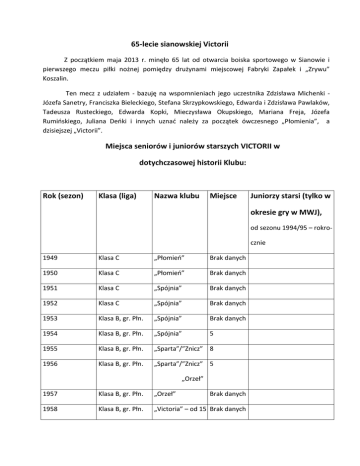 65-lecie sianowskiej Victorii Z początkiem maja 2013 r. minęło 65 lat od otwarcia boiska sportowego w Sianowie i pierwszego meczu piłki nożnej pomiędzy drużynami miejscowej Fabryki Zapałek i „Zrywu” Koszalin. Ten mecz z udziałem - bazuję na wspomnieniach jego uczestnika Zdzisława Michenki Józefa Sanetry, Franciszka Bieleckiego, Stefana Skrzypkowskiego, Edwarda i Zdzisława Pawlaków, Tadeusza Rusteckiego, Edwarda Kopki, Mieczysława Okupskiego, Mariana Freja, Józefa Rumińskiego, Juliana Deńki i innych uznać należy za początek ówczesnego „Płomienia”, a dzisiejszej „Victorii”. Miejsca seniorów i juniorów starszych VICTORII w dotychczasowej historii Klubu: Rok (sezon) Klasa (liga) Nazwa klubu Miejsce Juniorzy starsi (tylko w okresie gry w MWJ), od sezonu 1994/95 – rokrocznie 1949 Klasa C „Płomień” Brak danych 1950 Klasa C „Płomień” Brak danych 1951 Klasa C „Spójnia” Brak danych 1952 Klasa C „Spójnia” Brak danych 1953 Klasa B, gr. Płn. „Spójnia” Brak danych 1954 Klasa B, gr. Płn. „Spójnia” 5 1955 Klasa B, gr. Płn. „Sparta”/”Znicz” 8 1956 Klasa B, gr. Płn. „Sparta”/”Znicz” 5 „Orzeł” 1957 Klasa B, gr. Płn. „Orzeł” Brak danych 1958 Klasa B, gr. Płn. „Victoria” – od 15 Brak danych grudnia 1957 roku 1959 Klasa B, gr. Kosz. „Victoria” Brak danych 1960 Klasa B, gr. Kosz. „Victoria” Brak danych 1960/61 Od jesie- Klasa A „Victoria: 4 ni 1960 r. rozgrywki toczone są sy stemem: jesień wiosna 1961/62 Klasa A „Victoria” 5 1962/63 Klasa A „Victoria” 8 1963/64 Klasa A „Victoria” 4 1964/65 Klasa A „Victoria” 4 1965/66 Klasa A, gr. Płn. „Victoria” 2 1966/67 Liga Okręgowa „Victoria” 1 1967/68 III Liga „Victoria” 13 1968/69 Liga Okręgowa „Victoria” 8 1969/70 Liga Okręgowa „Victoria” 7 1970/71 Liga Okręgowa „Victoria” 4 1971/72 Liga Okręgowa „Victoria” 4 1972/73 Liga Okręgowa „Victoria” 6 1973/74 Klasa Okręgowa „Victoria” 10 1974/75 Klasa Okręgowa „Victoria” 10 1975/76 Klasa Okręgowa „Victoria” 4 Klub zrezygnował z gry w Klasie Mię dzywojewó dzkiej 1976/77 Klasa A, gr. Kosz. „Victoria” 10 1977/78 Klasa A, gr. Kosz. „Victoria” 4 1978/79 Klasa A, gr. Kosz. „Victoria” 7 1979/80 Klasa Okręgowa „Victoria” 6 1980/81 Klasa Okręgowa „Victoria” 2 1981/82 Klasa Okręgowa „Victoria” 8 1982/83 Klasa Okręgowa „Victoria” 6 1983/84 Klasa Okręgowa „Victoria” 3 1984/85 Klasa Okręgowa „Victoria” 1 Baraż o III Liga Międzywojewódzka Ligę z „Łucz Juniorów Makroregionu nikiem” Wielkopolskiego – 14 Strzelce Kra miejsce. Awans po rezy – jeńskie gnacji „Wielima” i „Kotwicy”. 1985/86 Klasa Okręgowa „Victoria” 7 1986/87 Liga Okręgowa „Victoria” 10 „Victoria” 5 „Victoria” 10 Koszalińsko-Słu pska 1987/88 Liga Okręgowa Koszalińsko-Słu pska 1988/89 Liga Okręgowa Koszalińsko-Słu Liga Międzywojewódzka Juniorów Makroregionu pska Wielkopolskiego - 15 miejsce. Awans po rezygnacji „Iskry”. 1989/90 Klasa Okręgowa „Victoria” 8 1990/91 Klasa Okręgowa „Victoria” 8 1991/92 Klasa Okręgowa „Victoria” 7 Liga Międzywojewódzka Juniorów Makroregionu Wielkopolskiego, gr. Płn. 11 miejsce. Bezdyskusyj ny awans. 1992/93 Klasa Okręgowa/ „Tur”/”Victoria” 18 Od rundy rewan- od 4 lutego 1993 żowej III Liga - roku po fuzji z „Turem” Koszalin 1993/94 Klasa Makroregio „Tur”/”Victoria” 8 nalna 1994/95 Klasa Makroregio „Tur”/”Victoria” 6 nalna LMWJ, gr. Płn. – 15 miejsce. Utrzymanie po rezy gnacji „Iskry”. 1995/96 IV Liga „Tur”/”Victoria” 14 LMWJ, gr. „Szczecińska” - 13 miejsce. Utrzymanie w Lidze. 1996/97 IV Liga „Tur”/”Victoria” 4 LMWJ, gr. „Szczecińska” - 14 miejsce. Baraż z „Nie lbą” o utrzymanie. 1997/98 1998/99 Klasa Makroregio „Victoria” od 9 nalna lipca 1997 roku V Liga „Victoria” 14 LMWJ, gr. „Szczecińska” - 10 miejsce. 4 LMWJ, gr. „Szczecińska” - 7 miejsce. 1999/00 V Liga „Victoria” 9 LMWJ, gr. „Szczecińska” -6 miejsce. 2000/01 Klasa Okręgowa, „Victoria” 3 gr. Płn. Liga Wojewódzka Juniorów - 15 miejsce. Utrzy manie w wyniku posze rzenia Ligi do 18 zespo łów. 2001/02 Klasa Okręgowa, „Victoria” 8 gr. Płn. Liga Wojewódzka JunioRów. Zespół występo - wał pod nazwą „Bałtyk / Victoria” Koszalin. Decy zją działaczy KKPN „Bał tyk” został wycofany z ro zgrywek po rundzie je siennej. Zespół zajmował wówczas 13 miejsce. 2002/03 Klasa Okręgowa, „Victoria” 15 Spadek do Klasa okręgowa juniorów gr. Płn. klasy „A”. Utrzymała się po fuzji z Or- Grupa Północ – 5 miejsce łem Lubiecho wo 2003/04 Klasa Okręgowa, „Orzeł Victoria” gr. Płn. 2 po fuzji z „Orłem” Klasa okręgowa juniorów Grupa Północ – 8 miejsce Lubiechowo od 1 sierpnia 2003 roku 2004/05 Klasa Okręgowa, „Orzeł Victoria”, gr. Płn. 7 „Victoria Dega” Klasa 1 juniorów – miejsce 9 od 18 października 2004 roku 2005/06 2006/07 Klasa Okręgowa, „Victoria Dega” 1 Awans do Klasa 1 juniorów – miejsce gr. Płn. IV ligi 6 IV Liga, gr. Zacho „Victoria Dega” 14 Klasa 1 juniorów – miejsce dniopomorska (drugi zespół 4 5 – w grupie 1 Klasy „A”) 2007/08 IV Liga, gr. Zacho „Victoria Dega”, 18 dniopomorska od 12 grudnia (drugi zespół 4 2007 roku Klub 13 – w grupie Sportowy „Victo- „północnej” ria” Klasy Okręgo wej KOZPN) Klasa 1 juniorów – miejsce 2008/09 V Liga, gr. “Victoria” “Koszalińska” 11 Klasa 2 juniorów – miejsce (drugi zespół 3 9 – w grupie 1 Klasy „A”) 2009/10 V Liga, gr. „Victoria” „Koszalińska” 9 Klasa 2 juniorów – miejsce (drugi zespół 5 8 – w grupie 1 Klasy „A”) 2010/11 Koszalińska Klasa „Victoria” 13 Klasa 2 juniorów – miejsce Okręgowa (drugi zespół 1 4 – w grupie 1 Klasy „A”) 2011/12 Koszalińska Klasa „Victoria” 9 Klasa 2 juniorów, grup