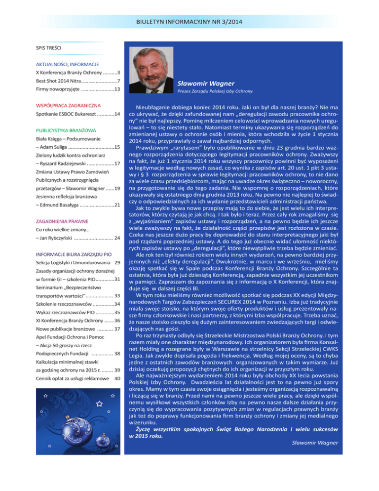 BIULETYN INFORMACYJNY NR 3/2014 SPIS TREŚCI AKTUALNOŚCI, INFORMACJE X Konferencja Branży Ochrony ..........3 Best Shot 2014 Nitra .........................7 Firmy nowoprzyjęte .......................13 WSPÓŁPRACA ZAGRANICZNA Spotkanie ESBOC Bukareszt ............14 PUBLICYSTYKA BRANŻOWA Biała Księga – Podsumowanie – Adam Suliga ................................15 Zielony ludzik kontra ochroniarz – Ryszard Radziejewski ...................17 Zmiana Ustawy Prawo Zamówień Publicznych a rozstrzygnięcia przetargów – Sławomir Wagner ......19 Jesienna refleksja branżowa – Edmund Basałyga ........................21 ZAGADNIENIA PRAWNE Co roku wielkie zmiany... – Jan Rybczyński ........................... 24 INFORMACJE BIURA ZARZĄDU PIO Sekcja Logistyki i Umundurowania 29 Zasady organizacji ochrony doraźnej w formie GI – szkolenia PIO.............31 Seminarium „Bezpieczeństwo transportów wartości” ................... 33 Szkolenie rzeczoznawców ...............34 Wykaz rzeczoznawców PIO .............35 XI Konferencja Branży Ochrony .......36 Nowe publikacje branżowe ........... 37 Apel Fundacji Ochrona i Pomoc – Akcja 50 groszy na rzecz Podopiecznych Fundacji ............... 38 Kalkulacja minimalnej stawki za godzinę ochrony na 2015 r. ........ 39 Cennik opłat za usługi reklamowe 40 Sławomir Wagner Prezes Zarządu Polskiej Izby Ochrony Nieubłaganie dobiega koniec 2014 roku. Jaki on był dla naszej branży? Nie ma co ukrywać, że dzięki zafundowanej nam „deregulacji zawodu pracownika ochrony” nie był najlepszy. Pominę milczeniem celowości wprowadzania nowych uregulowań – to się niestety stało. Natomiast terminy ukazywania się rozporządzeń do zmienianej ustawy o ochronie osób i mienia, która wchodziła w życie 1 stycznia 2014 roku, przyprawiały o zawał najbardziej odpornych. Prawdziwym „rarytasem” było opublikowanie w dniu 23 grudnia bardzo ważnego rozporządzenia dotyczącego legitymacji pracowników ochrony. Zważywszy na fakt, że już 1 stycznia 2014 roku wszyscy pracownicy powinni być wyposażeni w legitymacje według nowych zasad, co wynika z zapisów art. 20 ust. 1 pkt 3 ustawy i § 3 rozporządzenia w sprawie legitymacji pracowników ochrony, to nie dano za wiele czasu przedsiębiorcom, mając na uwadze okres świąteczno – noworoczny, na przygotowanie się do tego zadania. Nie wspomnę o rozporządzeniach, które ukazywały się ostatniego dnia grudnia 2013 roku. Na pewno nie najlepiej to świadczy o odpowiedzialnych za ich wydanie przedstawicieli administracji państwa. Jak to zwykle bywa nowe przepisy mają to do siebie, że jest wielu ich interpretatorów, którzy czytają je jak chcą. I tak było i teraz. Przez cały rok zmagaliśmy się z „wyjaśnianiem” zapisów ustawy i rozporządzeń, a na pewno będzie ich jeszcze wiele zważywszy na fakt, że działalność części przepisów jest rozłożona w czasie. Czeka nas jeszcze dużo pracy by doprowadzić do stanu interpretacyjnego jaki był pod rządami poprzedniej ustawy. A do tego już obecnie widać ułomność niektórych zapisów ustawy po „deregulacji”, które niewątpliwie trzeba będzie zmieniać. Ale rok ten był również rokiem wielu innych wydarzeń, na pewno bardziej przyjemnych niż „efekty deregulacji”. Dwukrotnie, w marcu i we wrześniu, mieliśmy okazję spotkać się w Spale podczas Konferencji Branży Ochrony. Szczególnie ta ostatnia, która była już dziesiątą Konferencją, zapadnie wszystkim jej uczestnikom w pamięci. Zapraszam do zapoznania się z informacją o X Konferencji, która znajduje się w dalszej części BI. W tym roku mieliśmy również możliwość spotkać się podczas XX edycji Międzynarodowych Targów Zabezpieczeń SECUREX 2014 w Poznaniu. Izba już tradycyjnie miała swoje stoisko, na którym swoje oferty produktów i usług prezentowały nasze firmy członkowskie i nasi partnerzy, z którymi Izba współpracuje. Trzeba uznać, że nasze stoisko cieszyło się dużym zainteresowaniem zwiedzających targi i odwiedzających nas gości. Po raz trzynasty odbyły się Strzeleckie Mistrzostwa Polski Branży Ochrony. I tym razem miały one charakter międzynarodowy. Ich organizatorem była firma Konsalnet Holding a rozegrane były w Warszawie na strzelnicy Sekcji Strzeleckiej CWKS Legia. Jak zwykle dopisała pogoda i frekwencja. Według mojej oceny, są to chyba jedne z ostatnich zawodów branżowych organizowanych w takim wymiarze. Już dzisiaj oczekuję propozycji chętnych do ich organizacji w przyszłym roku. Ale najważniejszym wydarzeniem 2014 roku były obchody XX lecia powstania Polskiej Izby Ochrony. Dwadzieścia lat działalności jest to na pewno już spory okres. Mamy w tym czasie swoje osiągnięcia i jesteśmy organizacją rozpoznawalną i liczącą się w branży. Przed nami na pewno jeszcze wiele pracy, ale dzięki wspólnemu wysiłkowi wszystkich członków Izby na pewno nasze dalsze działania przyczynią się do wypracowania pozytywnych zmian w regulacjach prawnych branży jak też do poprawy funkcjonowania firm branży ochrony i zmiany jej medialnego wizerunku. Życzę wszystkim spokojnych Świąt Bożego Narodzenia i wielu sukcesów w 2015 roku. Sławomir Wagner