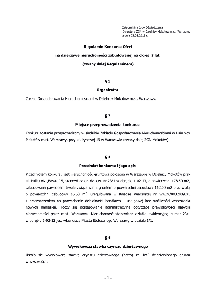 Załączniki nr 2 do Oświadczenia Dyrektora ZGN w Dzielnicy Mokotów m.st. Warszawy z dnia 23.03.2016 r. Regulamin Konkursu Ofert na dzierżawę nieruchomości zabudowanej na okres 3 lat (zwany dalej Regulaminem) §1 Organizator Zakład Gospodarowania Nieruchomościami w Dzielnicy Mokotów m.st. Warszawy. §2 Miejsce przeprowadzenia konkursu Konkurs zostanie przeprowadzony w siedzibie Zakładu Gospodarowania Nieruchomościami w Dzielnicy Mokotów m.st. Warszawy, przy ul. irysowej 19 w Warszawie (zwany dalej ZGN Mokotów). §3 Przedmiot konkursu i jego opis Przedmiotem konkursu jest nieruchomość gruntowa położona w Warszawie w Dzielnicy Mokotów przy ul. Pułku AK „Baszta” 5, stanowiąca cz. dz. ew. nr 23/1 w obrębie 1-02-13, o powierzchni 178,50 m2, zabudowana pawilonem trwale związanym z gruntem o powierzchni zabudowy 162,00 m2 oraz wiatą o powierzchni zabudowy 16,50 m2, uregulowana w Księdze Wieczystej nr WA2M/00320092/1 z przeznaczeniem na prowadzenie działalności handlowo – usługowej bez możliwości wznoszenia nowych naniesień. Toczy się postępowanie administracyjne dotyczące prawidłowości nabycia nieruchomości przez m.st. Warszawa. Nieruchomość stanowiąca działkę ewidencyjną numer 23/1 w obrębie 1-02-13 jest własnością Miasta Stołecznego Warszawy w udziale 1/1. §4 Wywoławcza stawka czynszu dzierżawnego Ustala się wywoławczą stawkę czynszu dzierżawnego (netto) za 1m2 dzierżawionego gruntu w wysokości : -1- Załączniki nr 2 do Oświadczenia Dyrektora ZGN w Dzielnicy Mokotów m.st. Warszawy z dnia 23.03.2016 r. Teren zabudowany pawilonem handlowym (162,00 m2) 20,00 zł/m2netto/m-c Teren zabudowany wiatą (16,50 m2) 3,99 zł/m2netto/m-c §5 Kryteria oceny ofert i ich znaczenie Przy wyborze najkorzystniejszej oferty ZGN Mokotów będzie kierował się wysokością stawki czynszu. §6 Termin konkursu 1) Oferty należy składać w siedzibie ZGN Mokotów przy ul. Irysowej 19 w Warszawie, w pokoju nr 7 od dnia 23.03.2016 r. do dnia 08.04.2016 r. do godz. 14:30 2) Oferent może wycofać ofertę przed upływem końcowego terminu składania ofert. Oferentowi przysługuje w tym przypadku możliwość zwrotu wadium wpłaconego w związku z planowanym udziałem w konkursie ofert. Wycofanie oferty następuje na pisemny wniosek oferenta. We wniosku o wycofanie oferty, oferent podaje nr konta bankowego, na który należy zwrócić wpłacone wadium. 3) Otwarcie ofert i część jawna konkursu odbędzie się w dniu 12.04.2016 r. o godz. 10:00 w siedzibie ZGN Mokotów przy ul. Irysowej 19 w Warszawie, zgodnie z § 15 niniejszego Regulaminu. §7 Warunki uczestnictwa w konkursie 1) W konkursie mogą brać udział osoby fizyczne i prawne, 2) Warunkiem przystąpienia oferenta do konkursu ofert jest:, • zapoznanie się z treścią Informatora konkursowego dostępnego w siedzibie ZGN Mokotów • • przy ul Irysowej 19 w Warszawie; wniesienie wadium w określonej wysokości, formie oraz wyznaczonym terminie; złożenie prawidłowej oferty - zgodnej z terminem i wymaganiami określonymi w niniejszym Regulaminie. -2- Załączniki nr 2 do Oświadczenia Dyrektora ZGN w Dzielnicy Mokotów m.st. Warszawy z dnia 23.03.2016 r. 3) Oferta (wypełniony druk oferty wraz z załączonymi dokumentami) powinna być złożona w zamkniętej kopercie, ostemplowanej bądź podpisanej w miejscu zaklejenia. Na kopercie umieszcza się napis: „OFERTA - DZIERŻAWA NIERUCHOMOŚCI ZABUDOWANEJ STANOWIĄCEJ DZIAŁKĘ EW. NR 23/1 W OBRĘBIE 1-02-13 Z PRZEZNACZENIEM NA PROWADZENIE DZIAŁALNOŚCI HANDLOWO - USŁUGOWEJ" NAZWĘ OFERENTA. 4) Oferent ma prawo do zmiany swojej oferty przed upływem końcowego terminu składania ofert jedynie w przypadku wycofania poprzednio złożonej oferty. §8 Oferta 1) Wzór Oferty stanowi załącznik nr 3 do niniejszego Regulaminu. Za ważną uznaje się jedynie ofertę złożoną na formularzu stanowiącym załącznik nr 3 do niniejszego Regulaminu. Oferent może wypełnić druk ręcznie /czytelnie/ lub korzystając z komputera /maszyny do pisania/. Zmiana treści wzoru oferty na dzierżawę nieruchomości bądź nie załączenie dokumentów, o których mowa poniżej skutkuje odrzuceniem oferty. 2) Oferta musi zawierać: a) imię i nazwisko/nazwę i adres lub siedzibę oferenta, b) datę sporządzenia oferty, c) przedmiot oferty, d) oferowaną cenę stanowiącą wysokość stawki czynszu netto za: 1m2 powierzchni terenu zabudowanego pawilonem handlowym oraz oferowaną cenę stanowiącą wysokość stawki czynszu netto za: 1m2 powierzchni zabudowanej wiatą (wyrażoną w złotych cyfrowo i słownie), e) podpis oferenta lub jego pełnomocnika/ów, f) koncepcję prowadzenia działalności na wydzierżawionej nieruchomości wraz z informacją o sytuacji finansowej oferenta (sprawozdanie finansowe/zeznanie podatkowe za ostatni rok) umożliwiającej należyte prowadzenie tej działalności, g) oświadczenie o zapoznaniu się oferenta: z Regulaminem Konkursu Ofert, wzorem umowy i przyjęciem ich treści bez zastrzeżeń, z informatorem konkursowym, -3- Załączniki nr 2 do Oświadczenia Dyrektora ZGN w Dzielnicy Mokotów m.st. Warszawy z dnia 23.03.2016 r. ze stanem faktycznym, prawnym i technicznym nieruchomości. (treść oświadczenia stanowi załącznik nr 1 do Regulaminu), h) aktualne zaświadczenie o nie zaleganiu w stosunku do m.st. Warszawy w podatkach oraz z tytułu należności finansowych, w stosunku do których nie stosuje się przepisów ordynacja i) podatkowa lub stwierdzających stan zaległości. w przypadku spółek prawa handlowego lub innych osób prawnych: odpis z KRS (oryginał *) wydany nie później niż na trzy miesiące przed datą konkursu ustaloną w ogłoszeniu (do odpisu powinno być dołączone oświadczenie osób uprawnionych do reprezentacji uczestnika, że od daty wydania odpisu z rejestru dane w nim zawarte nie uległy zmianie i do dnia konkursu dane te nie ulegną zmianie), zaświadczenie j) o nadaniu nr NIP, REGON pełnomocni