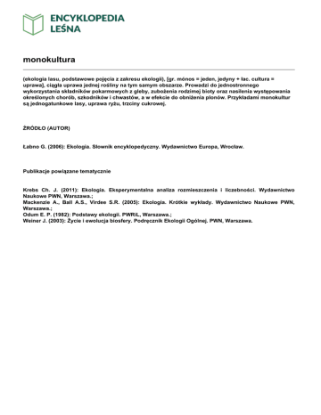 monokultura (ekologia lasu, podstawowe pojęcia z zakresu ekologii), [gr. mónos = jeden, jedyny + łac. cultura = uprawa], ciągła uprawa jednej rośliny na tym samym obszarze. Prowadzi do jednostronnego wykorzystania składników pokarmowych z gleby, zubożenia rodzimej bioty oraz nasilenia występowania określonych chorób, szkodników i chwastów, a w efekcie do obniżenia plonów. Przykładami monokultur są jednogatunkowe lasy, uprawa ryżu, trzciny cukrowej. ŹRÓDŁO (AUTOR) Łabno G. (2006): Ekologia. Słownik encyklopedyczny. Wydawnictwo Europa, Wrocław. Publikacje powiązane tematycznie Krebs Ch. J. (2011): Ekologia. Eksperymentalna analiza rozmieszczenia i liczebności. Wydawnictwo Naukowe PWN, Warszawa.; Mackenzie A., Ball A.S., Virdee S.R. (2005): Ekologia. Krótkie wykłady. Wydawnictwo Naukowe PWN, Warszawa.; Odum E. P. (1982): Podstawy ekologii. PWRiL, Warszawa.; Weiner J. (2003): Życie i ewolucja biosfery. Podręcznik Ekologii Ogólnej. PWN, Warszawa.