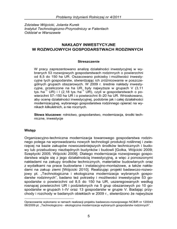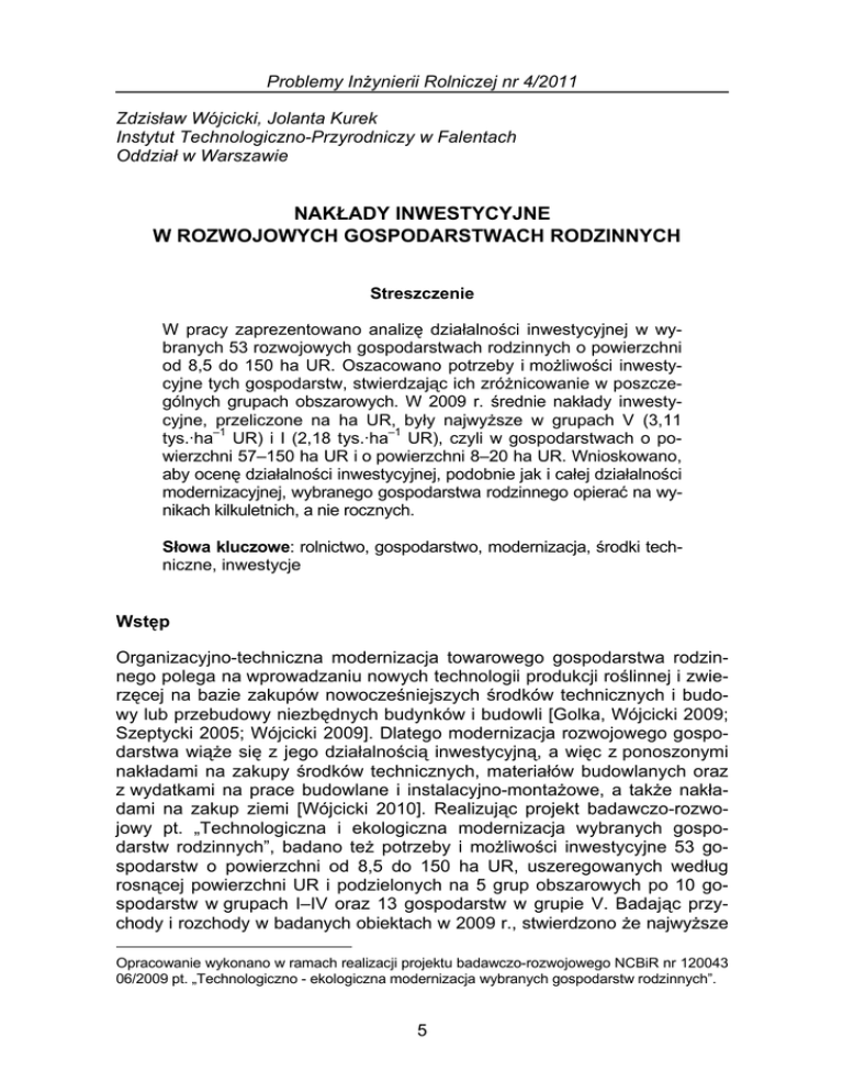 Problemy Inżynierii Rolniczej nr 4/2011 Zdzisław Wójcicki, Jolanta Kurek Instytut Technologiczno-Przyrodniczy w Falentach Oddział w Warszawie NAKŁADY INWESTYCYJNE W ROZWOJOWYCH GOSPODARSTWACH RODZINNYCH∗ Streszczenie W pracy zaprezentowano analizę działalności inwestycyjnej w wybranych 53 rozwojowych gospodarstwach rodzinnych o powierzchni od 8,5 do 150 ha UR. Oszacowano potrzeby i możliwości inwestycyjne tych gospodarstw, stwierdzając ich zróżnicowanie w poszczególnych grupach obszarowych. W 2009 r. średnie nakłady inwestycyjne, przeliczone na ha UR, były najwyższe w grupach V (3,11 tys.·ha–1 UR) i I (2,18 tys.·ha–1 UR), czyli w gospodarstwach o powierzchni 57–150 ha UR i o powierzchni 8–20 ha UR. Wnioskowano, aby ocenę działalności inwestycyjnej, podobnie jak i całej działalności modernizacyjnej, wybranego gospodarstwa rodzinnego opierać na wynikach kilkuletnich, a nie rocznych. Słowa kluczowe: rolnictwo, gospodarstwo, modernizacja, środki techniczne, inwestycje Wstęp Organizacyjno-techniczna modernizacja towarowego gospodarstwa rodzinnego polega na wprowadzaniu nowych technologii produkcji roślinnej i zwierzęcej na bazie zakupów nowocześniejszych środków technicznych i budowy lub przebudowy niezbędnych budynków i budowli [Golka, Wójcicki 2009; Szeptycki 2005; Wójcicki 2009]. Dlatego modernizacja rozwojowego gospodarstwa wiąże się z jego działalnością inwestycyjną, a więc z ponoszonymi nakładami na zakupy środków technicznych, materiałów budowlanych oraz z wydatkami na prace budowlane i instalacyjno-montażowe, a także nakładami na zakup ziemi [Wójcicki 2010]. Realizując projekt badawczo-rozwojowy pt. „Technologiczna i ekologiczna modernizacja wybranych gospodarstw rodzinnych”, badano też potrzeby i możliwości inwestycyjne 53 gospodarstw o powierzchni od 8,5 do 150 ha UR, uszeregowanych według rosnącej powierzchni UR i podzielonych na 5 grup obszarowych po 10 gospodarstw w grupach I–IV oraz 13 gospodarstw w grupie V. Badając przychody i rozchody w badanych obiektach w 2009 r., stwierdzono że najwyższe Opracowanie wykonano w ramach realizacji projektu badawczo-rozwojowego NCBiR nr 120043 06/2009 pt. „Technologiczno - ekologiczna modernizacja wybranych gospodarstw rodzinnych”. 5 Zdzisław Wójcicki, Jolanta Kurek pozycje łącznych rozchodów zajmują wydatki inwestycyjne (28,3%) i zakupy produktów rolniczych (25,8%), a niższe zakupy agrochemikaliów (12,8%) i bezpośrednich nośników energii (11%) [Kurek, Wójcicki 2011]. Analizując projekty modernizacji badanych gospodarstw w latach 2009–2015 [Wójcicki 2010; 2011] oszacowano natomiast, że w 2015 r. prognozowane wydatki na inwestycje odtworzeniowe i rozwojowe będą stanowiły średnio 14,4% przewidywanych rozchodów, najniższe nakłady inwestycyjne zostały zaplanowane na lata 2010 i 2015 r., a najwyższe na 2012 i 2013. Celem opracowania jest analiza i ocena działalności inwestycyjnej badanych 53 gospodarstw, a na tej podstawie stwierdzenie, czy właściciele badanych obiektów właściwie oceniają potrzeby i możliwości wprowadzenia nowych technik i technologii. Metody badań Badania w wybranych gospodarstwach są prowadzone według ustalonych jednolitych metodyk badań [Wójcicki i in. 2009]. Badane gospodarstwa (tab. 1) mają średnią powierzchnię 44,23 ha UR, która jest ponad 4-krotnie większa od średniej powierzchni gospodarstwa rolnego w Polsce. Tabela 1. Ogólna charakterystyka badanych gospodarstw Table 1. General characteristics of the farms surveyed GO AL (arable land) Średnia wartość odtworzeniowa środków trwałych [tys. zł·ha–1 UR] Average reproductive value of capital assets [thous. PLN·ha–1 AL] Przychody [tys. zł·ha–1 UR] Incomes [thous. PLN·ha–1 AL] Rozchody [tys. zł·ha–1 UR] Outlays [thous. PLN·ha–1 AL] 10 10 10 10 13 16,01 24,67 32,44 48,85 86,48 9,77 16,76 24,73 33,82 76,95 1,26 1,07 1,22 1,12 0,62 90,83 75,24 56,33 45,08 32,45 10,26 10,61 8,69 9,16 8,60 7,73 7,49 5,54 6,10 7,23 53 44,23 34,93 0,83 46,88 9,05 6,82 Grupa obszarowa gospodarstw Farm acreage group Liczba gospodarstw Number of farms UR AL (agricultural land) Obsada inwentarza żywego [DJP·ha–1 UR] Livestock density [LU·ha–1 AL] Średnia powierzchnia UR gospodarstwa [ha] Average AL area of farm [ha] I II III IV V Razem/średnio In total/average Źródło: wyniki własne. Source: own study. Szacowanie potrzeb i możliwości inwestycyjnych gospodarstw rodzinnych przeprowadzono, analizując: – średnie wyniki dla całej zbiorowości 53 obiektów; – średnie wyniki dla poszczególnych grup obszarowych; – wyniki działalności inwestycyjnej poszczególnych gospodarstw. 6 Nakłady inwestycyjne w rozwojowych gospodarstwach rodzinnych Analizy średnich wyników w poszczególnych grupach obszarowych i całej ich zbiorowości przeprowadzono, porównując poniesione w 2009 r. średnie wydatki (nakłady) inwestycyjne ze średnimi wartościami oszacowanej amortyzacji środków trwałych oraz ponoszonymi średnimi wydatkami (rozchody), a także z uzyskanymi średnimi przychodami. Szacowanie możliwości inwestycyjnych Mi badanego gospodarstwa przeprowadzono, wykorzystując formułę: Mi = Am + Ab + Ir + (Wb – Wp) (1) gdzie: Am – amortyzacja środków technicznych, Ab – amortyzacja budynków i budowli, Ir – inwestycje rozwojowe, Wb – bilansowy dochód rodziny rolnika brutto, Wp – parytetowe wynagrodzenie, będące średnim wynagrodzeniem uzyskiwanym przez zatrudnionych poza rolnictwem [Wójcicki, Kurek 2011]. Wyniki badań We wszystkich badanych gospodarstwach dochody rodziny brutto w 2009 r. przekraczały 12,0 zł·rbg–1 produkcyjnej pracy własnej. Uzyskiwano więc dodatni dochód parytetowy Wp, a tym samym istniały możliwości w zakresie odtworzeniowych nakładów inwestycyjnych. Nie wszystkie jednak gospodarstwa wykorzystywały te możliwości inwestycyjne w swojej działalności produkcyjnej i finansowej w 2009 