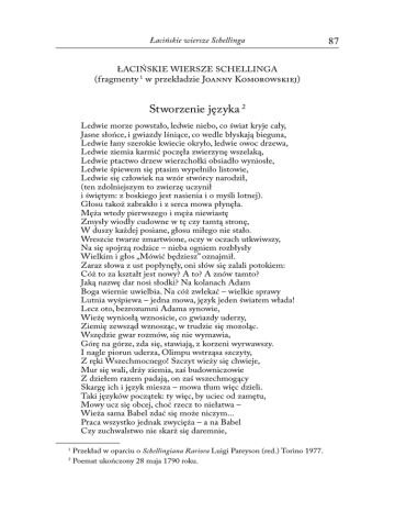 Łacińskie wiersze Schellinga ŁACIŃSKIE WIERSZE SCHELLINGA (fragmenty 1 w przekładzie Joanny Komorowskiej) Stworzenie języka 2 Ledwie morze powstało, ledwie niebo, co świat kryje cały, Jasne słońce, i gwiazdy lśniące, co wedle błyskają bieguna, Ledwie łany szerokie kwiecie okryło, ledwie owoc drzewa, Ledwie ziemia karmić poczęła zwierzynę wszelaką, Ledwie ptactwo drzew wierzchołki obsiadło wyniosłe, Ledwie śpiewem się ptasim wypełniło listowie, Ledwie się człowiek na wzór stwórcy narodził, (ten zdolniejszym to zwierzę uczynił i świętym: z boskiego jest nasienia i o myśli lotnej). Głosu takoż zabrakło i z serca mowa płynęła. Męża wtedy pierwszego i męża niewiastę Zmysły wiodły cudowne w tę czy tamtą stronę, W duszy każdej posiane, głosu miłego nie stało. Wreszcie twarze zmartwione, oczy w oczach utkwiwszy, Na się spojrzą rodzice – nieba ogniem rozbłysły Wielkim i głos „Mówić będziesz” oznajmił. Zaraz słowa z ust popłynęły, oni słów się zalali potokiem: Cóż to za kształt jest nowy? A to? A znów tamto? Jaką nazwę dar nosi słodki? Na kolanach Adam Boga wiernie uwielbia. Na cóż zwlekać – wielkie sprawy Lutnia wyśpiewa – jedna mowa, język jeden światem włada! Lecz oto, bezrozumni Adama synowie, Wieżę wyniosłą wznosicie, co gwiazdy uderzy, Ziemię zewsząd wznosząc, w trudzie się mozoląc. Wszędzie gwar rozmów, się nie wymawia, Górę na górze, zda się, stawiają, z korzeni wyrwawszy. I nagle piorun uderza, Olimpu wstrząsa szczyty, Z ręki Wszechmocnego! Szczyt wieży się chwieje, Mur się wali, drży ziemia, zaś budowniczowie Z dziełem razem padają, on zaś wszechmogący Skargę ich i język miesza – mowa tłum więc dzieli. Taki języków początek: ty więc, by uciec od zamętu, Mowy ucz się obcej, choć rzecz to niełatwa – Wieża sama Babel zdać się może niczym... Praca wszystko jednak zwycięża – a na Babel Czy zuchwalstwo nie skarż się daremnie, 1 2 Przekład w oparciu o Schellingiana Rariora Luigi Pareyson (red.) Torino 1977. Poemat ukończony 28 maja 1790 roku. 87 88 Friedrich Wilhelm Joseph Schelling Że pierwszej w świecie nie masz mowy, Znaleźć jej nikt nie zdoła (takie pomieszanie), A sprawa wciąż niejasna... Niech przyjdzie Hebrajczyk, Chaldejczyk, Arab, Czy kto syryjskim włada – niech śmiech was ogarnie Gdy kto zechce mowę pierwszą odtworzyć rodziców. Dla mnie wzgląd miejcie jednego i przez wasze usta Niech uczone moje przemówią przestrogi. (Dystych o milczeniu z września 1785 roku) O tajnym myśleć nie umiesz, szalony. Wierz mi, nie lada milczenie jest sztuką. (O spełnieniu się proroctw Starego Testamentu jako dowodzie boskiego pochodzenia tegoż. Fragment elegii, o której wspomina Schelling w notatce z 20 października 1786) I żeś dzieje, pomyślisz, nie pieśni czytał proroków. Do Anglii (Elegia w 81 dystychach czyni Wolność najwyższym bóstwem Anglii, wspomina wybitne osobistości takie, jak: Milton, Hume, Szekspir, a następnie opisuje scenę obdarowania wyspy przez kolejne bóstwa olimpijskie – fragmenty) Tam Franklin prawa nadał piorunom, Święty ogień w karby ujął reguł. (Na marginesie wersja alternatywna dystychu) Tam Franklin boskim rozporządza ogniem – On to prawa płomieniom, piorunom narzucił. (Dalej o podróżnikach): Cook po trzykroć okrąża ziemię niezmierzoną, Ziem wciąż nowych na lotnym szukając okręcie. Ze sceny obdarowania: (Dary Merkurego) Z mojej woli zyski wam handel przyniesie Spójrzcie – mórz się przed wami otwiera głębina. Łacińskie wiersze Schellinga Niech na obcym brzegu obce wita statki słońce – Dla was wszak morze łagodne, i spokojna podróż. Pełne z portu ładownie niech statek zabiera, Z podróżnymi do ojczystej ziemi przecie nie powróci. (Dary Junony) Umysł wzniosły i dumną wam duszę daruję, Brytyjczycy, co mojej naturze podobna. W sercach waszych pycha zamieszka szlachetna, A czynami ambicja pokieruje zacna. (Natura angielska) Umysł wzniosły a serce cnoty świadome W piersi bije dumne angielskiej. Nie inaczej lew stoi w ziemi Massyliotów Okrążony, lecz męstwa zawsze świadom swego. Zewsząd psy go z zębami dopadają rącze, Sfora wrzaskliwy jazgot pod niebo podnosi. Ów stoi, paszczą tylko a pazury grozi, Grzywą wstrząsa potworną włosy na niej jeżąc. (Dary Pallas) Wielcy będziecie – a i wielka niewiasta, I piękna w waszych portach pojawi się panna. (I wreszcie konkluzja) Tyle rzekli bogowie. Trzykroć wyspa zakrzyknie Wielka w swej radości, trzykroć na fali podskoczy, Morze jej wtóruje głębokie, głos się od brzegu odbija, Trzykroć głośno skały odkrzykną i cyple na morzu. 89 90