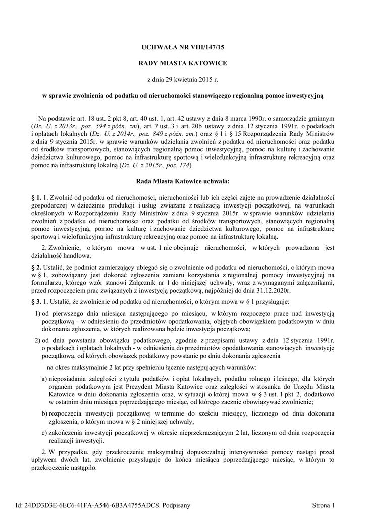 UCHWAŁA NR VIII/147/15 RADY MIASTA KATOWICE z dnia 29 kwietnia 2015 r. w sprawie zwolnienia od podatku od nieruchomości stanowiącego regionalną pomoc inwestycyjną Na podstawie art. 18 ust. 2 pkt 8, art. 40 ust. 1, art. 42 ustawy z dnia 8 marca 1990r. o samorządzie gminnym (Dz. U. z 2013r., poz. 594 z późn. zm), art. 7 ust. 3 i art. 20b ustawy z dnia 12 stycznia 1991r. o podatkach i opłatach lokalnych (Dz. U. z 2014r., poz. 849 z późn. zm.) oraz § 1 i § 15 Rozporządzenia Rady Ministrów z dnia 9 stycznia 2015r. w sprawie warunków udzielania zwolnień z podatku od nieruchomości oraz podatku od środków transportowych, stanowiących regionalną pomoc inwestycyjną, pomoc na kulturę i zachowanie dziedzictwa kulturowego, pomoc na infrastrukturę sportową i wielofunkcyjną infrastrukturę rekreacyjną oraz pomoc na infrastrukturę lokalną (Dz. U. z 2015r., poz. 174) Rada Miasta Katowice uchwala: § 1. 1. Zwolnić od podatku od nieruchomości, nieruchomości lub ich części zajęte na prowadzenie działalności gospodarczej w dziedzinie produkcji i usług związane z realizacją inwestycji początkowej, na warunkach określonych w Rozporządzeniu Rady Ministrów z dnia 9 stycznia 2015r. w sprawie warunków udzielania zwolnień z podatku od nieruchomości oraz podatku od środków transportowych, stanowiących regionalną pomoc inwestycyjną, pomoc na kulturę i zachowanie dziedzictwa kulturowego, pomoc na infrastrukturę sportową i wielofunkcyjną infrastrukturę rekreacyjną oraz pomoc na infrastrukturę lokalną. 2. Zwolnienie, o którym mowa w ust. 1 nie obejmuje nieruchomości, w których prowadzona jest działalność handlowa. § 2. Ustalić, że podmiot zamierzający ubiegać się o zwolnienie od podatku od nieruchomości, o którym mowa w § 1, zobowiązany jest dokonać zgłoszenia zamiaru korzystania z regionalnej pomocy inwestycyjnej na formularzu, którego wzór stanowi Załącznik nr 1 do niniejszej uchwały, wraz z wymaganymi załącznikami, przed rozpoczęciem prac związanych z inwestycją początkową, najpóźniej do dnia 31.12.2020r. § 3. 1. Ustalić, że zwolnienie od podatku od nieruchomości, o którym mowa w § 1 przysługuje: 1) od pierwszego dnia miesiąca następującego po miesiącu, w którym rozpoczęto prace nad inwestycją początkową - w odniesieniu do przedmiotów opodatkowania, objętych obowiązkiem podatkowym w dniu dokonania zgłoszenia, w których realizowana będzie inwestycja początkowa; 2) od dnia powstania obowiązku podatkowego, zgodnie z przepisami ustawy z dnia 12 stycznia 1991r. o podatkach i opłatach lokalnych - w odniesieniu do przedmiotów opodatkowania stanowiących inwestycję początkową, od których obowiązek podatkowy powstanie po dniu dokonania zgłoszenia na okres maksymalnie 2 lat przy spełnieniu łącznie następujących warunków: a) nieposiadania zaległości z tytułu podatków i opłat lokalnych, podatku rolnego i leśnego, dla których organem podatkowym jest Prezydent Miasta Katowice oraz zaległości w stosunku do Urzędu Miasta Katowice w dniu dokonania zgłoszenia oraz, w sytuacji o której mowa w § 3 ust. 1 pkt 2, dodatkowo w ostatnim dniu miesiąca poprzedzającego miesiąc, od którego zacznie obowiązywać zwolnienie; b) rozpoczęcia inwestycji początkowej w terminie do sześciu miesięcy, liczonego od dnia dokonana zgłoszenia, o którym mowa w § 2 niniejszej uchwały; c) zakończenia inwestycji początkowej w okresie nieprzekraczającym 2 lat, liczonym od dnia rozpoczęcia realizacji inwestycji. 2. W przypadku, gdy przekroczenie maksymalnej dopuszczalnej intensywności pomocy nastąpi przed upływem dwóch lat, zwolnienie przysługuje do końca miesiąca poprzedzającego miesiąc, w którym to przekroczenie nastąpiło. Id: 24DD3D3E-6EC6-41FA-A546-6B3A4755ADC8. Podpisany Strona 1 3. Zwolnienie od podatku od nieruchomości, o którym mowa w § 1 następuje na podstawie złożonej deklaracji lub korekty deklaracji na podatek od nieruchomości wraz z załącznikami zawierającymi dane o zwolnieniach podatkowych w podatku od nieruchomości bądź informacji lub korekty informacji złożonej w sprawie podatku od nieruchomości wraz z załącznikami zawierającymi dane o zwolnieniach podatkowych w podatku od nieruchomości. § 4. 1. Ustalić, że po rozpoczęciu realizacji inwestycji początkowej, w terminie do 14 dni podmiot, który dokonał zgłoszenia zamiaru korzystania z pomocy winien złożyć Prezydentowi Miasta Katowice: a) dokument potwierdzający rozpoczęcie prac związanych z inwestycją początkową, tj. dokument zawierający datę rozpoczęcia robót budowlanych związanych z inwestycją lub pierwsze prawnie wiążące zobowiązanie do zamówienia urządzeń lub inne zobowiązanie, które sprawia, że inwestycja staje się nieodwracalna, w zależności od tego co wystąpi najpierw; b) informacje i dokumenty, których obowiązek złożenia wynika z ustawy o postępowaniu w sprawach dotyczących pomocy publicznej, w zakresie udzielania regionalnej pomocy inwestycyjnej, obowiązujące w dniu dokonania zgłoszenia. 2. W trakcie realizacji inwestycji początkowej, co 6 miesięcy od dnia rozpoczęcia prac podmiot, który dokonał zgłoszenia zamiaru korzystania z pomocy, winien złożyć Prezydentowi Miasta Katowice informację o stanie realizacji inwestycji początkowej, o poniesionych kosztach kwalifikujących się do objęcia pomocą oraz o przewidywanym terminie zakończenia realizacji inwestycji początkowej. 3. Po zakończeniu realizacji inwestycji początkowej, w terminie do 30 dni podmiot, który dokonał zgłoszenia zamiaru korzystania z pomocy winien złożyć Prezydentowi Miasta Katowice: a) dokument potwierdzający zakończenie realizacji inwestycji początkowej tj. decyzję o pozwoleniu na użytkowanie obiektu otrzymaną z Powiatowego Inspektoratu Nadzoru Budowlanego lub dokument potwierdzający przyjęcie przez Powiatowy Inspektorat Nadzoru Budowlanego zgłoszenia zakończeni