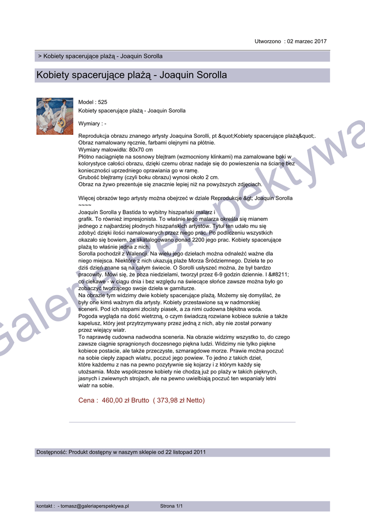 Utworzono : 02 marzec 2017 > Kobiety spacerujące plażą - Joaquin Sorolla Kobiety spacerujące plażą - Joaquin Sorolla Model : 525 Kobiety spacerujące plażą - Joaquin Sorolla a w ty Wymiary : - Reprodukcja obrazu znanego artysty Joaquina Sorolli, pt "Kobiety spacerujące plażą". Obraz namalowany ręcznie, farbami olejnymi na płótnie. Wymiary malowidła: 80x70 cm Płótno naciągnięte na sosnowy blejtram (wzmocniony klinkami) ma zamalowane boki w kolorystyce całości obrazu, dzięki czemu obraz nadaje się do powieszenia na ścianę bez konieczności uprzedniego oprawiania go w ramę. Grubość blejtramy (czyli boku obrazu) wynosi około 2 cm. Obraz na żywo prezentuje się znacznie lepiej niż na powyższych zdjęciach. a i r e l a G p rs k e Więcej obrazów tego artysty można obejrzeć w dziale Reprodukcje > Joaquin Sorolla ~~~~ Joaquín Sorolla y Bastida to wybitny hiszpański malarz i grafik. To również impresjonista. To właśnie tego malarza określa się mianem jednego z najbardziej płodnych hiszpańskich artystów. Tytuł ten udało mu się zdobyć dzięki ilości namalowanych przez niego prac. Po podliczeniu wszystkich okazało się bowiem, że skatalogowano ponad 2200 jego prac. Kobiety spacerujące plażą to właśnie jedna z nich. Sorolla pochodził z Walencji. Na wielu jego dziełach można odnaleźć ważne dla niego miejsca. Niektóre z nich ukazują plaże Morza Śródziemnego. Dzieła te po dziś dzień znane są na całym świecie. O Sorolli usłyszeć można, że był bardzo pracowity. Mówi się, że poza niedzielami, tworzył przez 6-9 godzin dziennie. I – co ciekawe - w ciągu dnia i bez względu na świecące słońce zawsze można było go zobaczyć tworzącego swoje dzieła w garniturze. Na obrazie tym widzimy dwie kobiety spacerujące plażą. Możemy się domyślać, że były one kimś ważnym dla artysty. Kobiety przestawione są w nadmorskiej scenerii. Pod ich stopami złocisty piasek, a za nimi cudowna błękitna woda. Pogoda wygląda na dość wietrzną, o czym świadczą rozwiane kobiece suknie a także kapelusz, który jest przytrzymywany przez jedną z nich, aby nie został porwany przez wiejący wiatr. To naprawdę cudowna nadwodna sceneria. Na obrazie widzimy wszystko to, do czego zawsze ciągnie spragnionych doczesnego piękna ludzi. Widzimy nie tylko piękne kobiece postacie, ale także przeczyste, szmaragdowe morze. Prawie można poczuć na sobie ciepły zapach wiatru, poczuć jego powiew. To jedno z takich dzieł, które każdemu z nas na pewno pozytywnie się kojarzy i z którym każdy się utożsamia. Może współczesne kobiety nie chodzą już po plaży w takich pięknych, jasnych i zwiewnych strojach, ale na pewno uwielbiają poczuć ten wspaniały letni wiatr na sobie. e P Cena : 460,00 zł Brutto ( 373,98 zł Netto) Dostępność: Produkt dostępny w naszym sklepie od 22 listopad 2011 kontakt : - [email protected] Strona 1/1