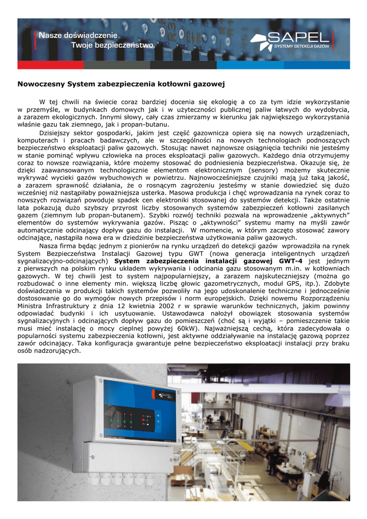 Nowoczesny System zabezpieczenia kotłowni gazowej W tej chwili na świecie coraz bardziej docenia się ekologię a co za tym idzie wykorzystanie w przemyśle, w budynkach domowych jak i w użyteczności publicznej paliw łatwych do wydobycia, a zarazem ekologicznych. Innymi słowy, cały czas zmierzamy w kierunku jak największego wykorzystania właśnie gazu tak ziemnego, jak i propan-butanu. Dzisiejszy sektor gospodarki, jakim jest część gazownicza opiera się na nowych urządzeniach, komputerach i pracach badawczych, ale w szczególności na nowych technologiach podnoszących bezpieczeństwo eksploatacji paliw gazowych. Stosując nawet najnowsze osiągnięcia techniki nie jesteśmy w stanie pominąć wpływu człowieka na proces eksploatacji paliw gazowych. Każdego dnia otrzymujemy coraz to nowsze rozwiązania, które możemy stosować do podniesienia bezpieczeństwa. Okazuje się, że dzięki zaawansowanym technologicznie elementom elektronicznym (sensory) możemy skutecznie wykrywać wycieki gazów wybuchowych w powietrzu. Najnowocześniejsze czujniki mają już taką jakość, a zarazem sprawność działania, że o rosnącym zagrożeniu jesteśmy w stanie dowiedzieć się dużo wcześniej niż nastąpiłaby poważniejsza usterka. Masowa produkcja i chęć wprowadzania na rynek coraz to nowszych rozwiązań powoduje spadek cen elektroniki stosowanej do systemów detekcji. Także ostatnie lata pokazują dużo szybszy przyrost liczby stosowanych systemów zabezpieczeń kotłowni zasilanych gazem (ziemnym lub propan-butanem). Szybki rozwój techniki pozwala na wprowadzenie „aktywnych” elementów do systemów wykrywania gazów. Pisząc o „aktywności” systemu mamy na myśli zawór automatycznie odcinający dopływ gazu do instalacji. W momencie, w którym zaczęto stosować zawory odcinające, nastąpiła nowa era w dziedzinie bezpieczeństwa użytkowania paliw gazowych. Nasza firma będąc jednym z pionierów na rynku urządzeń do detekcji gazów wprowadziła na rynek System Bezpieczeństwa Instalacji Gazowej typu GWT (nowa generacja inteligentnych urządzeń sygnalizacyjno-odcinających) System zabezpieczenia instalacji gazowej GWT-4 jest jednym z pierwszych na polskim rynku układem wykrywania i odcinania gazu stosowanym m.in. w kotłowniach gazowych. W tej chwili jest to system najpopularniejszy, a zarazem najskuteczniejszy (można go rozbudować o inne elementy min. większą liczbę głowic gazometrycznych, moduł GPS, itp.). Zdobyte doświadczenia w produkcji takich systemów pozwoliły na jego udoskonalenie techniczne i jednocześnie dostosowanie go do wymogów nowych przepisów i norm europejskich. Dzięki nowemu Rozporządzeniu Ministra Infrastruktury z dnia 12 kwietnia 2002 r w sprawie warunków technicznych, jakim powinny odpowiadać budynki i ich usytuowanie. Ustawodawca nałożył obowiązek stosowania systemów sygnalizacyjnych i odcinających dopływ gazu do pomieszczeń (choć są i wyjątki – pomieszczenie takie musi mieć instalację o mocy cieplnej powyżej 60kW). Najważniejszą cechą, która zadecydowała o popularności systemu zabezpieczenia kotłowni, jest aktywne oddziaływanie na instalację gazową poprzez zawór odcinający. Taka konfiguracja gwarantuje pełne bezpieczeństwo eksploatacji instalacji przy braku osób nadzorujących. Centrala GWT zasila detektory gazu (głowice) i steruje ich pracą oraz generuje impulsy zamykające zawory ZB/MSV w sytuacjach odbiegających od zaprogramowanych stanów. Posiada dwa komplety wyjść (dla każdego progu alarmowego) umożliwiających połączenie systemu z automatyką i sterujących sygnalizatorami optycznymi i akustycznymi. Możliwe jest sterowanie kilkoma zaworami przy znacznych odległościach zaworów od systemu wykrywania gazu. Zawór ZB/MSV jest aktywnym elementem systemu GWT, realizuje ideę zabezpieczania instalacji. Dzięki impulsowi elektrycznemu zawory te są zamykane automatycznie. Otworzyć zawór można tylko ręcznie. Specyfika działania zaworów jest tak dobrana, że impuls elektryczny dostępny jest tylko w chwili zamykania. Dzięki takiemu rozwiązaniu zawór odporny jest na zaniki i spadki napięcia. Detektory gazu (głowice) typu EX o konstrukcji przeciwwybuchowej zapewniają pełne bezpieczeństwo i wykrywanie wszystkich rodzajów gazów wybuchowych. Bardzo ważną cechą jest to, że posiadają sensor gazu z dwoma programowalnymi progami alarmowymi, który można wymieniać. Powoduje to prostą obsługę, tanią eksploatację systemu a tym samym wieloletnie używanie. Głowice, które Państwo od nas otrzymujecie zawsze dostarczamy z indywidualnymi zaświadczeniami fabrycznymi oraz atestem kalibracyjnym. Uniwersalność naszego systemu pozwala na zastosowanie go: • w miejskich i przemysłowych kotłowniach gazowych, • w budynkach użyteczności publicznej (kina, teatry, szkoły), • w kotłowniach osiedlowych, • w domowych instalacjach gazowych. System Zabezpieczenia Instalacji Gazowej GWT i jego cechy: • wykrywanie podwyższonego stężenia gazu (poziomu ostrzegawczego) i generowanie ostrzegawczego sygnału optycznego oraz sygnału sterującego urządzeniami zewnętrznymi, • wykrywanie wysokiego stężenia gazu (poziomu alarmowego) i zamykanie zaworu odcinającego dopływ gazu do instalacji oraz generowanie sygnału akustycznego, optycznego i sygnału sterującego urządzeniami zewnętrznymi (np. stycznikiem wyłączającym zasilanie pomieszczeń zagrożonych z sieci energetycznej); • bardzo duża odporność na zakłócenia zasilania systemu; • sygnalizacja i rejestracja stanu awarii linii kablowej; • pamięć przekroczenia wartości alarmowych; • programowalne sterowanie podtrzymaniem pracy wentylacji indywidualnie na każdym kanale; • sterowanie wentylacją w trybie AUTO/MANUAL z możliwością dezaktywacji • możliwość odstawienia zdalnej sygnalizacji alarmowej; • zasilanie buforowe + sygnalizacja pracy awaryjnej; • autodiagnostyka z powiad