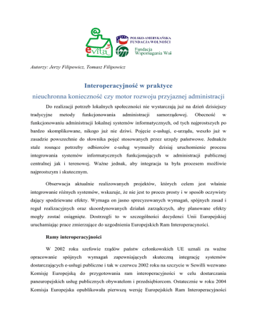 Autorzy: Jerzy Filipowicz, Tomasz Filipowicz Interoperacyjność w praktyce nieuchronna konieczność czy motor rozwoju przyjaznej administracji Do realizacji potrzeb lokalnych społeczności nie wystarczają już na dzień dzisiejszy tradycyjne metody funkcjonowania administracji samorządowej. Obecność w funkcjonowaniu administracji lokalnej systemów informatycznych, od tych najprostszych po bardzo skomplikowane, nikogo już nie dziwi. Pojęcie e-usługi, e-urządu, weszło już w zasadzie powszechnie do słownika pojęć stosowanych przez urzędy państwowe. Jednakże stale rosnące potrzeby odbiorców e-usług wymusiły dzisiaj uruchomienie procesu integrowania systemów informatycznych funkcjonujących w administracji publicznej centralnej jak i terenowej. Ważne jednak, aby integracja ta była procesem możliwie najprostszym i skutecznym. Obserwacja aktualnie realizowanych projektów, których celem jest właśnie integrowanie różnych systemów, wskazuje, że nie jest to proces prosty i w sposób oczywisty dający spodziewane efekty. Wymaga on jasno sprecyzowanych wymagań, spójnych zasad i reguł realizacyjnych oraz skoordynowanych działań zarządczych, aby planowane efekty mogły zostać osiągnięte. Dostrzegli to w szczególności decydenci Unii Europejskiej uruchamiając prace zmierzające do uzgodnienia Europejskich Ram Interoperacyności. Ramy interoperacyjności W 2002 roku szefowie rządów państw członkowskich UE uznali za ważne opracowanie spójnych wymagań zapewniających skuteczną integrację systemów dostarczających e-usługi publiczne i tak w czerwcu 2002 roku na szczycie w Sewilli wezwano Komisję Europejską do przygotowania ram interoperacyjności w celu dostarczania paneuropejskich usług publicznych obywatelom i przedsiębiorcom. Ostatecznie w roku 2004 Komisja Europejska opublikowała pierwszą wersję Europejskich Ram Interoperacyjności (ERI) 1. Rozumienie interoperacyności w ramach UE oznacza, że różne organizacje mają możliwość współpracowania ze sobą, aby realizować wspólne cele. W ramach tej współpracy następuje proces wymiany informacji i wiedzy, bez którego współpraca jest utrudniona. W dzisiejszych czasach z kolei wymiana informacji i wiedzy bez odpowiednich systemów ICT2 jest wręcz nie możliwa. Definicja Interoperacyjności jaka istnieje w polskiej nomenklaturze jest zgodna z definicją jaką posługuje się Unia Europejska 3. Konieczność podjęcia prac nad uregulowaniem prawnym interoperacyjności Komisja Europejska tłumaczyła brakiem ram prawnych dla działań w zakresie interoperacyjności oraz różnicą w wykładni prawa europejskiego; brakiem porozumień w zakresie zasad i definicji formatów danych, standardów i zasad dostępności; brakiem koordynacji wymiany dobrych praktyk. Intencjonalnie ERI w wersji pierwszej miały być prawnym mechanizmem egzekwowania określonych cech, jakie powinny spełniać zamawiane przez instytucje publiczne systemy informatyczne. Przyjmując ERI wersja 1.0 Komisja Europejska zakładała wymuszenie na państwach członkowskich przyjmowania Krajowych Ram Interoperacyjności, jako prawnych podstaw egzekwowania od administracji publicznej stosowania określonych zasad i reguł, które miały przyczynić się do rozwoju paneuropejskich usług publicznych. Przyglądając się historii prac nad powstaniem ERI należy stwierdzić, iż zgodnie z przewidywaniami wywołały one szereg kontrowersji i wątpliwości wynikających z problemów interpretacyjnych. Mogliśmy być świadkami ścierających się poglądów i różnicy zdań przede wszystkim przedstawicieli środowisk reprezentujących osoby zaangażowane w stosowanie rozwiązań opartych na licencjach otwartych 4 (przykładem może być licencja typu Copyleft – GNU General Public License - GNU GPL) oraz przedstawicieli rozwiązań informatycznych tzw. zamkniętych, czyli takich, których model biznesowy ochrony praw 1 Dokumentację dotyczącą European Interoperability Framework (Europejskie Ramy Interoperacyności) można znaleźć pod adresem http://ec.europa.eu/idabc/en/document/3473 2 Information and Comunication Technology (ICT) – Technologie Informacyjno-Komunikacyjne. 3 Na podstawie ustawy z dnia 17 lutego 2005 r. o informatyzacji działalności podmiotów realizujących zadania publiczne 4 Przykładową definicję licencji otwartej można znaleźć pod adresem http://pl.wikipedia.org/wiki/Licencja_otwarta Strona 2 autorskich do kodu źródłowego sprowadza się do jego nieujawniania (nieupubliczniania). W 2005 r. ówczesne Ministerstwo Informatyzacji przedstawiło projekt rozporządzenia Krajowych Ram Interoperacyjności zgodne z ERI wersja 1.0. Niemniej, jego ostateczne przyjęcie do porządku prawnego nie nastąpiło, co stanowiło pokłosie problemów związanych ze stosowaniem i krytyką ERI wersja 1.0. Kilkuletnie doświadczenie w promowaniu i stosowaniu ERI wersja 1.0 doprowadziło ostatecznie w 2009 roku do podjęcia dyskusji w ramach KE nad opracowaniem drugiej wersji tego dokumentu. Należy zauważyć istotną zmianę w podejściu do ram interoperacyjności i ich znaczenia w ramach UE. Podstawowa zmiana polega na tym, że w przeciwieństwie do wersji pierwszej, która miała stać się elementem systemu prawnego UE, wersja druga takiego charakteru nie ma. Zgodnie z deklaracją KE wersja druga stanowi dokument roboczy, którego celem jest wywołanie dyskusji na temat ich znaczenia w informatyzacji usług publicznych. Interoperacyjność w praktyce Rozwój koncepcji interoperacyjności e-usług publicznych, mimo braku na dzień dzisiejszy jednoznacznych regulacji prawnych, może potencjalnie wpłynąć na funkcjonowanie administracji samorządowej. Już dzisiaj realizowana jest integracja systemów centralnych. Wystarczy wspomnieć tutaj integrację usług publicznych w ramach platformy ePUAP 5 czy też projekt Pl.ID 6, w ramach którego planowana jest integracja głównych systemów takich jak PESEL, Centr