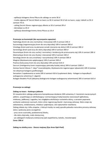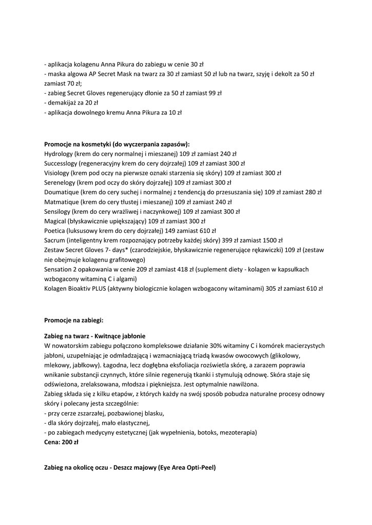 - aplikacja kolagenu Anna Pikura do zabiegu w cenie 30 zł - maska algowa AP Secret Mask na twarz za 30 zł zamiast 50 zł lub na twarz, szyję i dekolt za 50 zł zamiast 70 zł; - zabieg Secret Gloves regenerujący dłonie za 50 zł zamiast 99 zł - demakijaż za 20 zł - aplikacja dowolnego kremu Anna Pikura za 10 zł Promocje na kosmetyki (do wyczerpania zapasów): Hydrology (krem do cery normalnej i mieszanej) 109 zł zamiast 240 zł Successlogy (regeneracyjny krem do cery dojrzałej) 109 zł zamiast 300 zł Visiology (krem pod oczy na pierwsze oznaki starzenia się skóry) 109 zł zamiast 300 zł Serenelogy (krem pod oczy do skóry dojrzałej) 109 zł zamiast 300 zł Doumatique (krem do cery suchej i normalnej z tendencją do przesuszania się) 109 zł zamiast 280 zł Matmatique (krem do cery tłustej i mieszanej) 109 zł zamiast 240 zł Sensilogy (krem do cery wrażliwej i naczynkowej) 109 zł zamiast 300 zł Magical (błyskawicznie upiększający) 109 zł zamiast 300 zł Poetica (luksusowy krem do cery dojrzałej) 149 zamiast 610 zł Sacrum (inteligentny krem rozpoznający potrzeby każdej skóry) 399 zł zamiast 1500 zł Zestaw Secret Gloves 7- days* (czarodziejskie, błyskawicznie regenerujące rękawiczki) 109 zł (zestaw nie obejmuje kolagenu grafitowego) Sensation 2 opakowania w cenie 209 zł zamiast 418 zł (suplement diety - kolagen w kapsułkach wzbogacony witaminą C i algami) Kolagen Bioaktiv PLUS (aktywny biologicznie kolagen wzbogacony witaminami) 305 zł zamiast 610 zł Promocje na zabiegi: Zabieg na twarz - Kwitnące jabłonie W nowatorskim zabiegu połączono kompleksowe działanie 30% witaminy C i komórek macierzystych jabłoni, uzupełniając je odmładzającą i wzmacniającą triadą kwasów owocowych (glikolowy, mlekowy, jabłkowy). Łagodna, lecz dogłębna eksfoliacja rozświetla skórę, a zarazem poprawia wnikanie substancji czynnych, które silnie regenerują tkanki i stymulują odnowę. Skóra staje się odświeżona, zrelaksowana, młodsza i piękniejsza. Jest optymalnie nawilżona. Zabieg składa się z kilku etapów, z których każdy na swój sposób pobudza naturalne procesy odnowy skóry i polecany jesta szczególnie: - przy cerze zszarzałej, pozbawionej blasku, - dla skóry dojrzałej, mało elastycznej, - po zabiegach medycyny estetycznej (jak wypełnienia, botoks, mezoterapia) Cena: 200 zł Zabieg na okolicę oczu - Deszcz majowy (Eye Area Opti-Peel) Odbudowa i optymalne nawilżenie skóry okolic oczu siłami samej natury. Synergia najpotężniejszych substancji kosmetologicznych: witaminy C i kolagenu aktywnego biologicznie w połączeniu z odmładzającymi składnikami roślinnymi. Łagodny witaminowy peeling za pomocą 30% witaminy C w połączeniu z odżywczymi i nawilżającymi składnikami roślinnymi oraz kolagen aktywny biologicznie zastają skórę starzejącą się i zaniedbaną, a zostawiają młodniejącą i odbudowaną. Cena: 100 zł Mezoterapia bezigłowa z ekskluzywnym płatem japooskim z kwasem hialuronowym, kolagenem i morskimi minerałami : 140 zł Zabieg na okolice oczu (sonoforeza, japooski płat z kwasem hialuronowym na całą twarz, maska gipsowa, aplikacja kremu): 100 zł Peeling kawitacyjny + sonoforeza + maska algowa + aplikacja kremu: 130 zł Masaż twarzy szyi i dekoltu: 50 zł Masaż relaksacyjny pleców: 60 zł Mikrodermabrazja dłoni + kolagen AP Bioaktiv: 60 zł