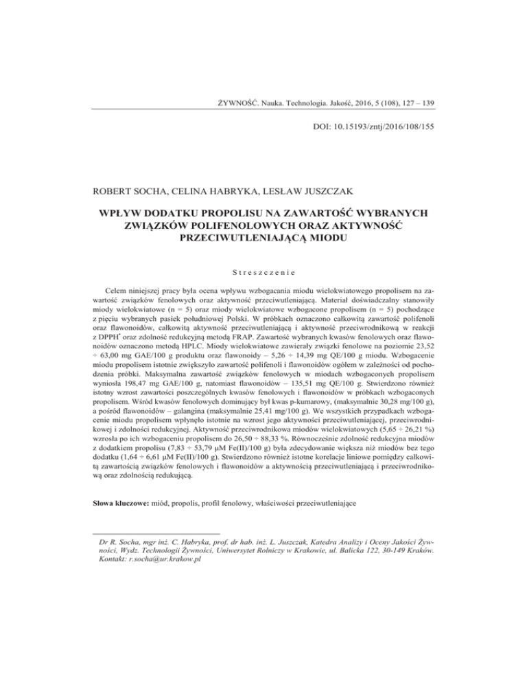 ŻYWNOŚĆ. Nauka. Technologia. Jakość, 2016, 5 (108), 127 – 139 DOI: 10.15193/zntj/2016/108/155 ROBERT SOCHA, CELINA HABRYKA, LESŁAW JUSZCZAK WPŁYW DODATKU PROPOLISU NA ZAWARTOŚĆ WYBRANYCH ZWIĄZKÓW POLIFENOLOWYCH ORAZ AKTYWNOŚĆ PRZECIWUTLENIAJĄCĄ MIODU Streszczenie Celem niniejszej pracy była ocena wpływu wzbogacania miodu wielokwiatowego propolisem na zawartość związków fenolowych oraz aktywność przeciwutleniającą. Materiał doświadczalny stanowiły miody wielokwiatowe (n = 5) oraz miody wielokwiatowe wzbogacone propolisem (n = 5) pochodzące z pięciu wybranych pasiek południowej Polski. W próbkach oznaczono całkowitą zawartość polifenoli oraz flawonoidów, całkowitą aktywność przeciwutleniającą i aktywność przeciwrodnikową w reakcji z DPPH• oraz zdolność redukcyjną metodą FRAP. Zawartość wybranych kwasów fenolowych oraz flawonoidów oznaczono metodą HPLC. Miody wielokwiatowe zawierały związki fenolowe na poziomie 23,52 ÷ 63,00 mg GAE/100 g produktu oraz flawonoidy – 5,26 ÷ 14,39 mg QE/100 g miodu. Wzbogacenie miodu propolisem istotnie zwiększyło zawartość polifenoli i flawonoidów ogółem w zależności od pochodzenia próbki. Maksymalna zawartość związków fenolowych w miodach wzbogaconych propolisem wyniosła 198,47 mg GAE/100 g, natomiast flawonoidów – 135,51 mg QE/100 g. Stwierdzono również istotny wzrost zawartości poszczególnych kwasów fenolowych i flawonoidów w próbkach wzbogaconych propolisem. Wśród kwasów fenolowych dominujący był kwas p-kumarowy, (maksymalnie 30,28 mg/100 g), a pośród flawonoidów – galangina (maksymalnie 25,41 mg/100 g). We wszystkich przypadkach wzbogacenie miodu propolisem wpłynęło istotnie na wzrost jego aktywności przeciwutleniającej, przeciwrodnikowej i zdolności redukcyjnej. Aktywność przeciwrodnikowa miodów wielokwiatowych (5,65 ÷ 26,21 %) wzrosła po ich wzbogaceniu propolisem do 26,50 ÷ 88,33 %. Równocześnie zdolność redukcyjna miodów z dodatkiem propolisu (7,83 ÷ 53,79 μM Fe(II)/100 g) była zdecydowanie większa niż miodów bez tego dodatku (1,64 ÷ 6,61 μM Fe(II)/100 g). Stwierdzono również istotne korelacje liniowe pomiędzy całkowitą zawartością związków fenolowych i flawonoidów a aktywnością przeciwutleniającą i przeciwrodnikową oraz zdolnością redukującą. Słowa kluczowe: miód, propolis, profil fenolowy, właściwości przeciwutleniające Dr R. Socha, mgr inż. C. Habryka, prof. dr hab. inż. L. Juszczak, Katedra Analizy i Oceny Jakości Żywności, Wydz. Technologii Żywności, Uniwersytet Rolniczy w Krakowie, ul. Balicka 122, 30-149 Kraków. Kontakt: [email protected] 128 Robert Socha, Celina Habryka, Lesław Juszczak Wprowadzenie Miód oraz produkty pszczele są wartościowymi składnikami diety człowieka. Stanowią one cenne i bogate źródło związków biologicznie czynnych [5, 10, 26]. Stosowane są od wieków w tradycyjnej medycynie ludowej ze względu na szerokie spektrum działania przeciwbakteryjnego, przeciwrodnikowego, przeciwutleniającego, przeciwrakowego i wspomagającego w profilaktyce i leczeniu wielu chorób [6, 8, 9, 10, 28]. Produkty pszczele mogą stanowić również atrakcyjne składniki żywności prozdrowotnej i funkcjonalnej, ze względu na ich znaczny potencjał przeciwutleniający [11, 19, 25, 28]. Do składników miodu o aktywności przeciwutleniającej należą niektóre białka i aminokwasy, karotenoidy, związki fenolowe i flawonoidy, kwas askorbinowy, kwasy organiczne oraz produkty reakcji Maillarda [7, 10, 13, 18, 17, 27]. Skład miodów i pozostałych produktów pszczelich oraz ich aktywność biologiczna zależą od czynników takich, jak: źródło nektaru, pora roku, warunki klimatyczne i środowiskowe, czynniki genetyczne i inne [2, 13, 19, 20]. Jednym z ważnych produktów pszczelich jest propolis – substancja produkowana przez pszczoły z żywiczno-woskowych wydzielin roślin w postaci żywicznobalsamicznej masy o charakterystycznym zapachu i gorzkim, cierpkim smaku. Propolis ma silne właściwości przeciwdrobnoustrojowe, przeciwzapalne, immunostymulujące, chemoprewencyjne, cytostatyczne i proapoptotyczne [3, 28]. Związki fenolowe występujące w propolisie hamują tworzenie rodników aminowych, tlenowych i nadtlenowych, kompleksują jony metali przejściowych, przerywają reakcje wolnorodnikowe i zapobiegają peroksydacji lipidów [14, 21]. Z właściwościami przeciwutleniającymi propolisu wiąże się także jego aktywność przeciwkancerogenna, ponieważ może on hamować namnażanie się komórek rakowych i powodować ich apoptozę. Największe znaczenie w prewencji nowotworów ma ester fenyloetylowy kwasu kawowego (CAPE), jednak warunkiem jego aktywności jest synergiczne działanie wszystkich składników zawartych w propolisie [3]. Propolis może być wprowadzany do miodu w formie zagęszczonego ekstraktu alkoholowego [23]. Ze względu jednak na intensywny zapach oraz smak możliwa jego ilość do wprowadzenia jest ograniczona. Jak podają Osés i wsp. [14], ilość propolisu wprowadzonego do miodu nie powinna przekraczać 1 % ze względu na jego niekorzystny wpływ na charakterystykę sensoryczną miodu. Produkty pszczele zdobywają coraz większe uznanie konsumentów ze względu na zawartość związków bioaktywnych. Wśród nich znaczącą grupę stanowią związki polifenolowe o charakterze naturalnych przeciwutleniaczy, których bogatym źródłem jest propolis. Najbardziej naturalnym sposobem wprowadzenia propolisu do diety człowieka wydaje się być jego dodatek do miodu [14, 23]. WPŁYW DODATKU PROPOLISU NA ZAWARTOŚĆ WYBRANYCH ZWIĄZKÓW POLIFENOLOWYCH… 129 Celem niniejszej pracy była ocena wpływu wzbogacenia miodu wielokwiatowego propolisem na zawartość wybranych kwasów fenolowych i flawonoidów oraz jego właściwości przeciwutleniające. Materiał i metody badań Materiał doświadczalny stanowiły miody wielokwiatowe (n = 5) oraz miody wielok