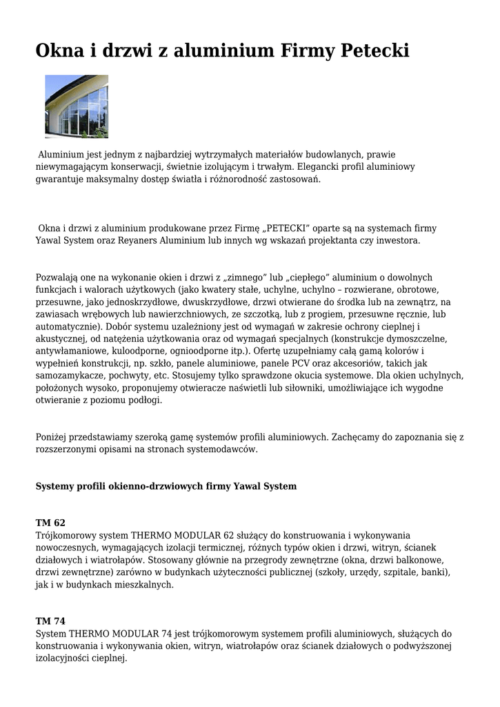 Okna i drzwi z aluminium Firmy Petecki Aluminium jest jednym z najbardziej wytrzymałych materiałów budowlanych, prawie niewymagającym konserwacji, świetnie izolującym i trwałym. Elegancki profil aluminiowy gwarantuje maksymalny dostęp światła i różnorodność zastosowań. Okna i drzwi z aluminium produkowane przez Firmę „PETECKI” oparte są na systemach firmy Yawal System oraz Reyaners Aluminium lub innych wg wskazań projektanta czy inwestora. Pozwalają one na wykonanie okien i drzwi z „zimnego” lub „ciepłego” aluminium o dowolnych funkcjach i walorach użytkowych (jako kwatery stałe, uchylne, uchylno – rozwierane, obrotowe, przesuwne, jako jednoskrzydłowe, dwuskrzydłowe, drzwi otwierane do środka lub na zewnątrz, na zawiasach wrębowych lub nawierzchniowych, ze szczotką, lub z progiem, przesuwne ręcznie, lub automatycznie). Dobór systemu uzależniony jest od wymagań w zakresie ochrony cieplnej i akustycznej, od natężenia użytkowania oraz od wymagań specjalnych (konstrukcje dymoszczelne, antywłamaniowe, kuloodporne, ognioodporne itp.). Ofertę uzupełniamy całą gamą kolorów i wypełnień konstrukcji, np. szkło, panele aluminiowe, panele PCV oraz akcesoriów, takich jak samozamykacze, pochwyty, etc. Stosujemy tylko sprawdzone okucia systemowe. Dla okien uchylnych, położonych wysoko, proponujemy otwieracze naświetli lub siłowniki, umożliwiające ich wygodne otwieranie z poziomu podłogi. Poniżej przedstawiamy szeroką gamę systemów profili aluminiowych. Zachęcamy do zapoznania się z rozszerzonymi opisami na stronach systemodawców. Systemy profili okienno-drzwiowych firmy Yawal System TM 62 Trójkomorowy system THERMO MODULAR 62 służący do konstruowania i wykonywania nowoczesnych, wymagających izolacji termicznej, różnych typów okien i drzwi, witryn, ścianek działowych i wiatrołapów. Stosowany głównie na przegrody zewnętrzne (okna, drzwi balkonowe, drzwi zewnętrzne) zarówno w budynkach użyteczności publicznej (szkoły, urzędy, szpitale, banki), jak i w budynkach mieszkalnych. TM 74 System THERMO MODULAR 74 jest trójkomorowym systemem profili aluminiowych, służących do konstruowania i wykonywania okien, witryn, wiatrołapów oraz ścianek działowych o podwyższonej izolacyjności cieplnej. PI 50 System Profili Izolowanych (PI 50) jest rozbudowanym systemem profili aluminiowych, służących do konstruowania i wykonywania nowoczesnych, wymagających izolacji termicznej, różnych typów okien i drzwi, witryn, ścianek działowych i wiatrołapów. Właściwości izolujące, zapewniają taśmy poliamidowe, wzmocnione włóknem szklanym, dając pewne i trwałe połączenie. PBI 50N Jednokomorowy system bez izolacji termicznej przeznaczony do zabudowy wewnętrznej. Szeroka gama profili, w tym wzmocnionych słupków, pozwala wykonywać konstrukcje o dużych gabarytach; w przypadku ścian nawet do 8m wysokości. PBI 40E System profili bez izolacji termicznej pozwala tworzyć konstrukcje ścianek działowych, ścianek kasowych oraz drzwi i okien nie wymagających izolacji termicznej. Wykorzystywany jest do ekonomicznej zabudowy wnętrz o wysokim standardzie estetycznym i użytkowym. L 50 System zabudowy loggi i balkonów DP 94 System drzwi przesuwnych. KONTAKT Petecki E-mail: [email protected] WWW: www.petecki.eu Tel: +48 42 689 99 99 Fax: +48 42 680 25 64 Adres: Rudzka 11/13 93 – 457 Łódź