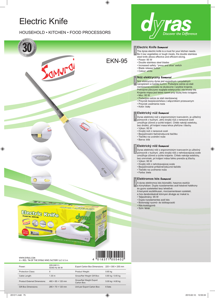 Electric Knife English HOUSEHOLD • KITCHEN • FOOD PROCESSORS Magyar Slovenský Český Polski EKN-95 Electric Knife Samurai The dyras electric knife is a must for your kitchen needs. Be it raw vegetables or tough meats, the double stainless steel knife allows effective and efficient slicing. • Power: 95 W • Double stainless steel blades • Increased safety: “press and slice” switch • Blade release button • Colour: white Nóż elektryczny Samurai Nóż elektryczny dyras jest wygodnym i przydatnym narzędziem w każdej kuchni. Podwójne ostrze ze stali nierdzewnej pozwala na skuteczne i szybkie krojenie. Pokrojone pieczywo wygląda estetycznie i nie kruszy się. Krojenie mięsa jest łatwe nawet przy dużej ilości ścięgien. • Moc: 95 W • Podwójne ostrze ze stali nierdzewnej • Przycisk bezpieczeństwa z włącznikiem przesuwnym • Przycisk uwalniania noża • Kolor: biały Elektrický nůž Samurai Dyras elektrický nůž s ergonomickým tvarováním, je užitečný pomocník v kuchyni. Jeho dvojitý nůž z nerezové oceli umožňuje účinné a rychlé krájení. Chléb nakrájí esteticky, bez drobků, při krájení masa lehce přeřízne i šlachy. • Výkon: 95 W • Dvojitý nůž z nerezové oceli • Bezpečnostní tlačné/odsuvné tlačítko • Tlačítko na uvolnění nože • Barva: bílá Elektrický nôž Samurai Dyras elektrický nôž s ergonomickým tvarovaním je užitočný pomocník v kuchyni. Jeho dvojitý nôž z nehrdzavejúcej ocele umožňuje účinné a rýchle krájanie. Chlieb nakrája esteticky, bez omrviniek, pri krájaní mäsa ľahko prereže aj šľachy. • Výkon: 95 W • Dvojitý nôž z nehrdzavejúcej ocele • Bezpečnostné prítlačné/odsuvné tlačidlo • Tlačidlo na uvoľnenie noža • Farba: biela Elektromos kés Samurai A dyras elektromos kés kézreálló, hasznos eszköz a konyhában. Dupla rozsdamentes acél késével hatékony és gyors szeletelést tesz lehetővé. A kenyeret esztétikusan, morzsamentesen szeleteli, a hús darabolásánál könnyen átvágja az ínakat is. • Teljesítmény: 95 W • Dupla rozsdamentes acél kés • Biztonsági nyomó- és tolókapcsoló • Kés kioldógomb • Szín: fehér WWW.DYRAS.COM ® = REG. TM OF THE DYRAS WWE.FACTORY LLC U.S.A. Power: 220-240 V~ 50/60 Hz 95 W Export Carton Box Dimensions: 225 × 300 × 255 mm Protection Class: II Product Weight: 0.65 kg Cable Length: 1.30 m Gross/Net Weight Gift Box: 0.80 kg / 0.65 kg Product External Dimensions: 460 × 65 × 120 mm Gross/Net Weight Export Carton Box: 5.00 kg / 4.60 kg Gift Box Dimensions: 285 × 70 × 120 mm Unit per Export Carton Box: 6 Sets 201211.indd 75 2013.02.12. 12:55:34