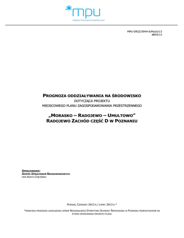 MPU-ORZ2/5044-6/Ma1b/13 8854/13 PROGNOZA ODDZIAŁYWANIA NA ŚRODOWISKO DOTYCZĄCA PROJEKTU MIEJSCOWEGO PLANU ZAGOSPODAROWANIA PRZESTRZENNEGO „MORASKO – RADOJEWO – UMULTOWO” RADOJEWO ZACHÓD CZĘŚĆ D W POZNANIU OPRACOWANIE: ZESPÓŁ OPRACOWAŃ ŚRODOWISKOWYCH MGR AGATA CHĘCIŃSKA POZNAŃ, CZERWIEC 2013 R./ LIPIEC 2013 R.* *NINIEJSZA PROGNOZA UWZGLĘDNIA OPINIE REGIONALNEGO DYREKTORA OCHRONY ŚRODOWISKA W POZNANIU PRZEDSTAWIONE NA ETAPIE OPINIOWANIA PROJEKTU PLANU PROGNOZA ODDZIAŁYWANIA NA ŚRODOWISKO DOTYCZĄCA PROJEKTU MPZP OBSZARU „MORASKO – RADOJEWO – UMULTOWO” RADOJEWO ZACHÓD CZĘŚĆ D W POZNANIU SPIS TREŚCI 1. WPROWADZENIE ............................................................................................................................... 3 1.1. Informacje wstępne ..................................................................................................................... 3 1.2. Podstawy formalno-prawne opracowania ....................................................................................... 3 1.3. Cel i zakres merytoryczny opracowania .......................................................................................... 3 1.4 Wykorzystane materiały i metody pracy ......................................................................................... 4 2. CHARAKTERYSTYKA ORAZ STAN ŚRODOWISKA PRZYRODNICZEGO .............................................. 6 2.1. Położenie, użytkowanie i zagospodarowanie terenu ........................................................................ 6 2.2. Rzeźba terenu ............................................................................................................................. 6 2.3. Budowa geologiczna i warunki gruntowe ....................................................................................... 7 2.4. Zasoby naturalne ......................................................................................................................... 7 2.5. Warunki wodne ........................................................................................................................... 7 2.6. Szata roślinna ............................................................................................................................. 7 2.7. Świat zwierzęcy ........................................................................................................................... 9 2.8. Gleby ....................................................................................................................................... 10 2.9. Klimat lokalny............................................................................................................................ 11 2.10. Dziedzictwo kulturowe ............................................................................................................... 12 2.11. Jakość powietrza atmosferycznego .............................................................................................. 12 2.12. Klimat akustyczny ...................................................................................................................... 14 2.13. Jakość wód ............................................................................................................................... 14 3. ISTNIEJĄCE PROBLEMY OCHRONY ŚRODOWISKA ISTOTNE Z PUNKTU WIDZENIA REALIZACJI PROJEKTU PLANU, W SZCZEGÓLNOŚCI DOTYCZĄCE OBSZARÓW CHRONIONYCH NA PODSTAWIE USTAWY O OCHRONIE PRZYRODY .................................................................................................. 15 4. INFORMACJA O GŁÓWNYCH CELACH I ZAWARTOŚCI PROJEKTU PLANU ..................................... 17 4.1. Cel opracowania projektu planu .................................................................................................. 17 4.2. Ustalenia projektu planu............................................................................................................. 17 4.3. Powiązanie ustaleń projektu planu z innymi dokumentami ................................................................. 18 4.4. Potencjalne zmiany stanu środowiska w przypadku braku realizacji ustaleń projektu planu ............... 19 5. CELE OCHRONY ŚRODOWISKA USTANOWIONE NA SZCZEBLU MIĘDZYNARODOWYM, KRAJOWYM I LOKALNYM ISTOTNE Z PUNKTU WIDZENIA PROJEKTOWANEGO DOKUMENTU ......................... 20 6. PRZEWIDYWANE ODDZIAŁYWANIA USTALEŃ PROJEKTU PLANU NA ŚRODOWISKO .................. 22 6.1. Oddziaływanie na powierzchnię ziemi .......................................................................................... 22 6.2. Oddziaływanie na zasoby naturalne ............................................................................................. 23 6.3. Oddziaływanie na wody powierzchniowe i podziemne ................................................................... 23 6.4. Oddziaływanie na różnorodność biologiczną i krajobraz ................................................................. 23 6.5. Oddziaływanie na szatę roślinną.................................................................................................. 24 6.6. Oddziaływanie na zwierzęta ........................................................................................................ 24 6.7. Oddziaływanie na powietrze ....................................................................................................... 25 6.8. Oddziaływanie na klimat lokalny.................................................................................................. 25 6.9. Oddziaływanie na klimat akustyczny ............................................................................................ 25 6.10. Oddziaływanie na dziedzictwo kulturowe...................................................................................... 26 6.11. Oddziaływanie na ludzi .....................................................................................................
