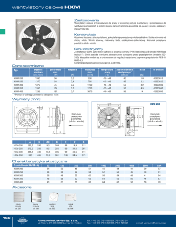 wentylatory osiowe HXM Zastosowanie Wentylatory osiowe przystosowane do pracy w dowolnej pozycji montażowej i przeznaczone do wentylacji pomieszczeń o niskim stopniu zanieczyszczenia powietrza np. garaży, piwnic, poddaszy, magazynów etc. Konstrukcja Obudowa tłoczona z blachy stalowej, pokryta farbą epoksydową w kolorze białym. Siatka ochronna od strony wlotu. Wirnik stalowy, malowany farbą epoksydowo-poliestrową. Kierunek przepływu powietrza silnik - wirnik. Silnik elektryczny Jednofazowy 230V, 50Hz silnik klatkowy o stopniu ochrony IP44 i klasie izolacji B (model 400 klasa izolacji F). Silnik posiada termiczne zabezpieczenie uzwojenia przed przeciążeniem (modele 200350). Wszystkie modele są przystosowane do regulacji napięciowej za pomocą regulatorów REB-1 i RMB-1,5 Schemat podłączenia elektrycznego rys. 9, str. 926. Dane techniczne prędkość obrotowa [obr./min] pobór mocy max. [W] natężenie HXM-200 1330 36 HXM-250 1370 58 Typ [A] wydajność max. [m3/h] temperatura pracy [oC] poziom ciśnienia akustycznego* [dB(A)] masa nr artykułu 0,2 530 -15 +40 42 1,8 42023010 0,4 780 -15 +40 46 2,2 42023020 [kg] HXM-300 1370 75 0,5 1160 -15 +40 50 3,2 42023030 HXM-350 1350 104 0,6 1750 -15 +40 53 4,3 42023040 HXM-400 1255 151 0,7 3670 -40 +60 56 9 42023050 *Pomiar w wolnej przestrzeni z odległości 1,5m Wymiary [mm] 500 420 464 410 Kierunek przepływu powietrza (silnik - wirnik) 10 40 0 Kierunek przepływu powietrza (silnik - wirnik) D G C HXM 400 12 A B F 92 E 12 78 122 204 HXM-200 A 222,5 B 266 OC 9,5 D 205 E 88 F 19,5 G 211 HXM-250 275,5 333 9,5 255 99 31,5 261 HXM-300 336,5 400 10,5 305 99 35,5 311 HXM-350 390 465 10,5 361 106 34,5 371 Charakterystyka akustyczna Częstotliwość Hz/dB(A) HXM-200 63 34 125 53 250 46 500 51 1000 46 2000 44 4000 41 8000 39 LwA 57 HXM-250 36 50 52 58 52 50 45 40 61 HXM-300 36 48 52 62 56 54 48 41 64 HXM-350 48 55 62 63 59 56 50 46 67 HXM-400 43 61 63 63 64 63 58 50 70 Akcesoria żaluzje PER-W str. 207 żaluzje PER-CN str. 208 regulator REB str. 892 czujnik SQA str. 896 168 Venture Industries Sp. z o.o. ul. Mokra 27, 05-092 Łomianki - Kiełpin tel. +48 22 751 95 50, 751 20 31 fax +48 22 751 22 59, 751 12 02 e-mail: [email protected] wentylatory osiowe HXM Charakterystyki pracy HXM-250 HXM-200 Pst Pst [Pa] [Pa] 30 20 25 16 P[W] 12 60 8 40 P[W] 20 15 230V 10 4 20 40 5 20 42 0 200 300 0,07 400 0,09 1 500 0,11 0 Q[m3/h] 0,13 3 400 46 500 2 0,15 4 340 300 5 260 60 230V 0 300 400 500 0,10 Q[m3/s] pg[Pa] 0,14 1 700 0,18 2 500 200 SFP 600 3 400 300 800 0,22 240 200 3 3 HXM-350 HXM-300 Pst [Pa] [Pa] 40 40 30 P[W] 30 P[W] 160 160 20 120 20 120 230V 80 230V 10 80 10 40 40 50 600 0,1 1 800 1000 0,2 2 480 3 400 53 1200 0,3 4 5 0 Q[m3/h] 0 600 10 240 pg[Pa] 800 1000 1200 1400 1600 1800 0,2 Q[m3/s] 7 300 SFP [W/(m /s)] Pst 400 Q[m3/s] 5 pg[Pa] 4 [W/(m /s)] 0 200 0 Q[m3/h] 1 0,3 2 400 SFP 3 [W/(m /s)] 3 300 0,4 4 5 0,5 7 200 160 0 Q[m3/h] Q[m3/s] pg[Pa] SFP 3 [W/(m /s)] HXM-400 Pst [Pa] 70 60 50 P[W] 40 200 30 150 230V 20 100 10 50 56 0 1000 0,3 1500 2000 0,4 0,5 400 300 1 3 2500 0,6 0,7 5 3000 0,8 7 200 3500 0,9 1,0 Q[m3/s] pg[Pa] 10 140 0 Q[m3/h] 120 SFP 3 [W/(m /s)] www.venture.pl 169