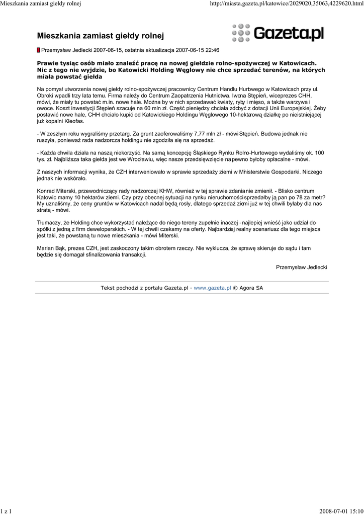 Mieszkania zamiast giełdy rolnej 1z1 http://miasta.gazeta.pl/katowice/2029020,35063,4229620.html Mieszkania zamiast giełdy rolnej Przemysław Jedlecki 2007-06-15, ostatnia aktualizacja 2007-06-15 22:46 Prawie tysiąc osób miało znaleźć pracę na nowej giełdzie rolno-spożywczej w Katowicach. Nic z tego nie wyjdzie, bo Katowicki Holding Węglowy nie chce sprzedać terenów, na których miała powstać giełda Na pomysł utworzenia nowej giełdy rolno-spożywczej pracownicy Centrum Handlu Hurtowego w Katowicach przy ul. Obroki wpadli trzy lata temu. Firma należy do Centrum Zaopatrzenia Hutnictwa. Iwona Stępień, wiceprezes CHH, mówi, że miały tu powstać m.in. nowe hale. Można by w nich sprzedawać kwiaty, ryby i mięso, a także warzywa i owoce. Koszt inwestycji Stępień szacuje na 60 mln zł. Część pieniędzy chciała zdobyć z dotacji Unii Europejskiej. Żeby postawić nowe hale, CHH chciało kupić od Katowickiego Holdingu Węglowego 10-hektarową działkę po nieistniejącej już kopalni Kleofas. - W zeszłym roku wygraliśmy przetarg. Za grunt zaoferowaliśmy 7,77 mln zł - mówi Stępień. Budowa jednak nie ruszyła, ponieważ rada nadzorcza holdingu nie zgodziła się na sprzedaż. - Każda chwila działa na naszą niekorzyść. Na samą koncepcję Śląskiego Rynku Rolno-Hurtowego wydaliśmy ok. 100 tys. zł. Najbliższa taka giełda jest we Wrocławiu, więc nasze przedsięwzięcie na pewno byłoby opłacalne - mówi. Z naszych informacji wynika, że CZH interweniowało w sprawie sprzedaży ziemi w Ministerstwie Gospodarki. Niczego jednak nie wskórało. Konrad Miterski, przewodniczący rady nadzorczej KHW, również w tej sprawie zdania nie zmienił. - Blisko centrum Katowic mamy 10 hektarów ziemi. Czy przy obecnej sytuacji na rynku nieruchomości sprzedałby ją pan po 78 za metr? My uznaliśmy, że ceny gruntów w Katowicach nadal będą rosły, dlatego sprzedaż ziemi już w tej chwili byłaby dla nas stratą - mówi. Tłumaczy, że Holding chce wykorzystać należące do niego tereny zupełnie inaczej - najlepiej wnieść jako udział do spółki z jedną z firm deweloperskich. - W tej chwili czekamy na oferty. Najbardziej realny scenariusz dla tego miejsca jest taki, że powstaną tu nowe mieszkania - mówi Miterski. Marian Bąk, prezes CZH, jest zaskoczony takim obrotem rzeczy. Nie wyklucza, że sprawę skieruje do sądu i tam będzie się domagał sfinalizowania transakcji. Przemysław Jedlecki Tekst pochodzi z portalu Gazeta.pl - www.gazeta.pl © Agora SA 2008-07-01 15:10