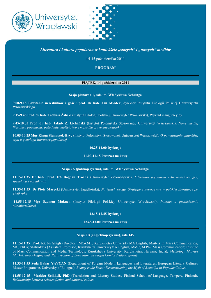 16.40-17.00 Mgr Dorota Stępień (Instytut Filologii Polskiej, Uniwersytet Wrocławski), Czarownica i czarodziej XXI wieku.